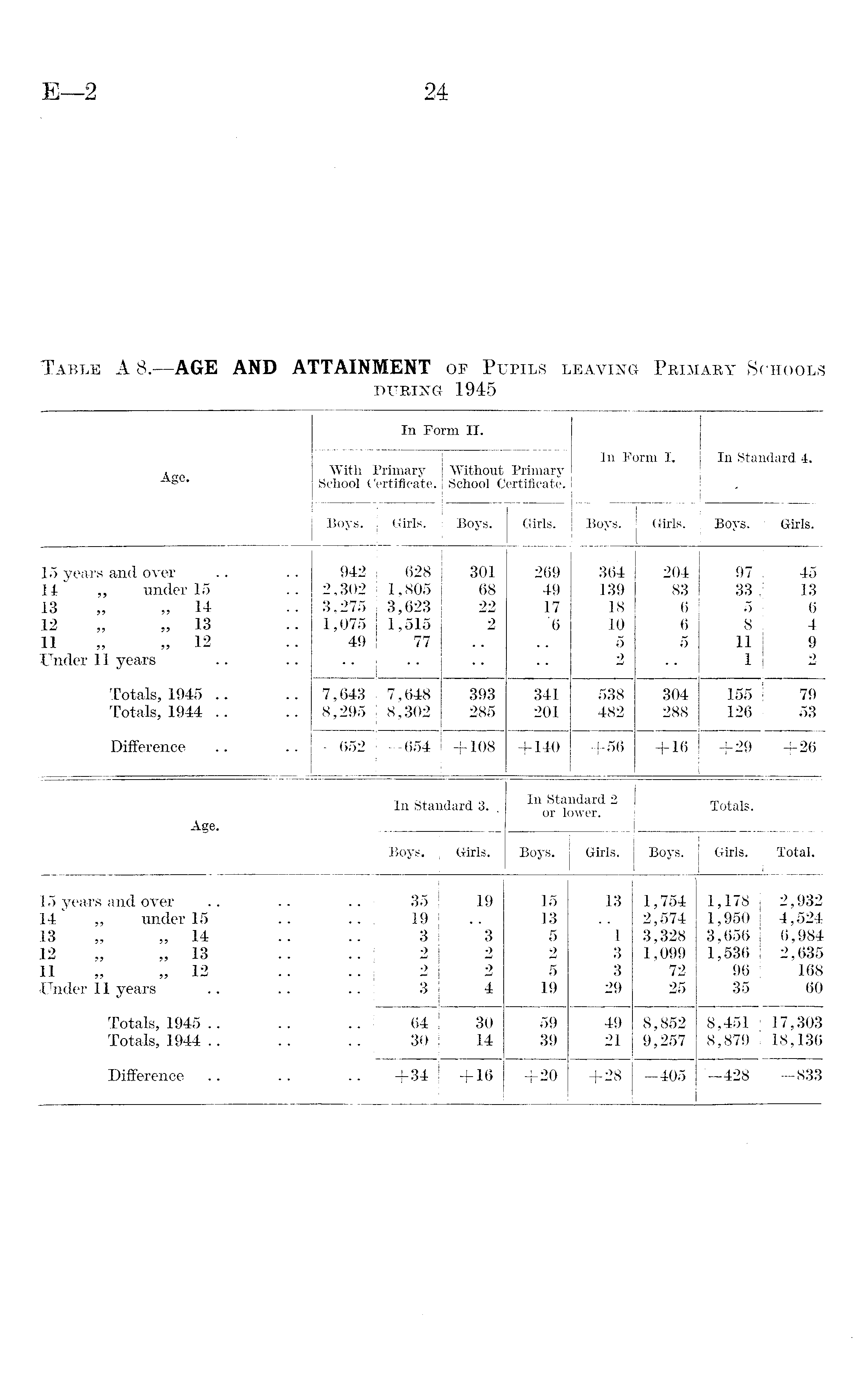 In Form II. Age. With Primary School Certificate. Without Primary School Certificate. In Form I. In Standard 4. Boys. Girls. Boys. Girls. Boys. Girls. Boys. 1 Girls. 15 years and over 14 „ under 15 13 „ „ U 12 „ „ 13 11 „ „ 12 Under 11 years 942 2,302 3,275 1,075 49 628 1,805 3,623 1,515 77 301 68 22 2 269 49 17 '6 364 139 18 10 5 2 204 83 6 6 5 97 33, 5 8 11 1 45 13 6 4 9 2 Totals, 1945 Totals, 1944 7,643 8,295 7,648 8,302 393 285 341 201 538 482 304 288 155 126 79 53 Difference -652 -654 + 108 +140 +56 + 16 +29 +26 Age. In Standard 3. , In Standard 2 or lower. Totals. Boys. Girls. Boys. Girls. Boys. Girls. Total. 1 15 years and over 14 „ under 15 13 „ „ 14 12 „ „ 13 11 „ „ 12 Under 11 years 35 19 3 2 2 3 19 3 2 2 4 15 13 5 2 5 19 1 13 1 3 3 29 1,754 2,574 3,328 1,099 72 25 1,178 1,950 3,656 1,536 96 35 2,932 4,524 6,984 2,635 168 60 Totals, 1945 Totals, 1944 64 30 30 14 59 39 49 21 8,852 9,257 8,451 8,879 17,303 18,136 Difference +34 + 16 +20 +28 -405 -428 -833
