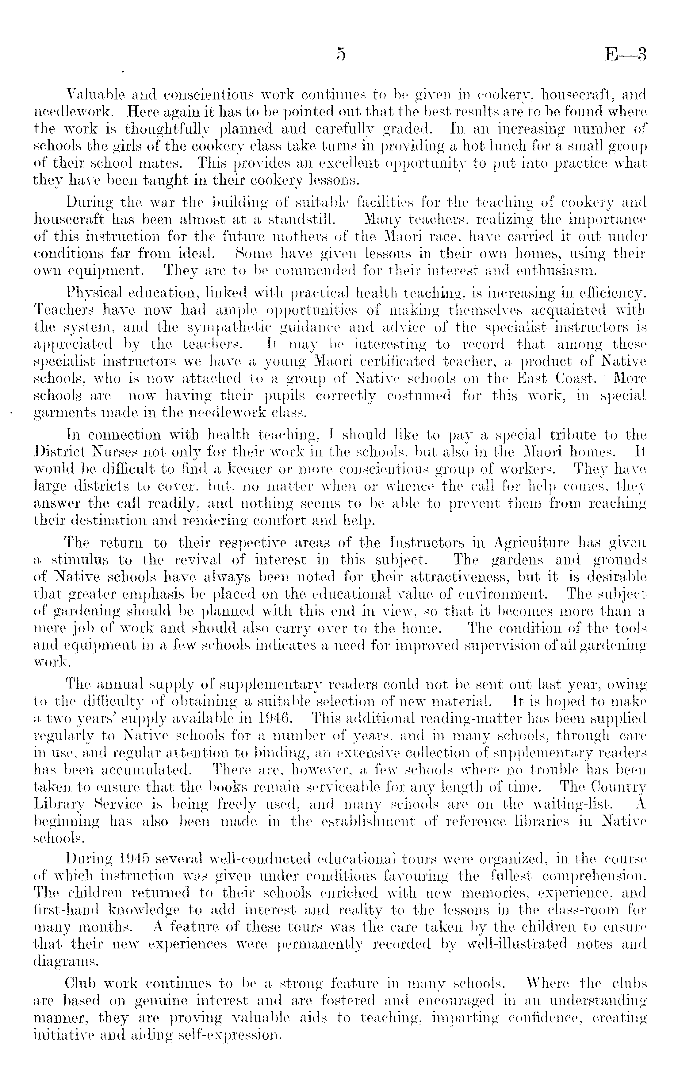 Valuable and conscientious work continues to be given in cookery, housecraft, and needlework. Here again it has to be pointed out that the best results are to be found where the work is thoughtfully planned and carefully graded. In an increasing number of schools the girls of the cookery class take turns in providing a hot lunch for a small group of their school mates. This provides an excellent opportunity to put into practice what they have been taught in their cookery lessons. During the war the building of suitable facilities for the teaching of cookery and housecraft has been almost at a standstill. Many teachers, realizing the importance of this instruction for the future mothers of the Maori race, have carried it out under conditions far from ideal. Some have given lessons in their own homes, using their own equipment. They are to be commended for their interest and enthusiasm. Physical education, linked with practical health teaching, is increasing in efficiency. Teachers have now had ample opportunities of making themselves acquainted with the system, and the sympathetic guidance and advice of the specialist instructors is appreciated by the teachers. It may be interesting to record that among these specialist instructors we have a young Maori certificated teacher, a product of Native schools, who is now attached to a group of Native schools on the East Coast. More schools are now having their pupils correctly costumed for this work, in special garments made in the needlework class. In connection with health teaching, I should like to pay a special tribute to the District Nurses not only for their work in the schools, but also in the Maori homes. It would be difficult to find a keener or more conscientious group of workers. They have large districts to cover, but, no matter when or whence the call for help comes, they answer the call readily, and nothing seems to be able to prevent them from reaching their destination and rendering comfort and help. The return to their respective areas of the Instructors in Agriculture has given a stimulus to the revival of interest in this subject. The gardens and grounds of Native schools- have always been noted for their attractiveness, but it is desirable that greater emphasis be placed on the educational value of environment. The subject of gardening should be planned with this end in view, so that it becomes more than a mere job of work and should also carry over to the home. The condition of the tools and equipment in a few schools indicates a need for improved supervision of all gardening work. The annual supply of supplementary readers could not be sent out last year, owing to the difficulty of obtaining a suitable selection of new material. It is hoped to make a two years' supply available in 1946. This additional reading-matter has been supplied regularly to Native schools for a number of years, and in many schools, through care in use, and regular attention to binding, an extensive collection of supplementary readers has been accumulated. There are, however, a few schools where no trouble has been taken to ensure that the books remain serviceable for any length of time. The Country Library Service is being freely used, and many schools are 011 the waiting-list. A beginning has also been made in the establishment of reference libraries in Native schools. During 1945 several well-conducted educational tours were organized, in the course of which instruction was given under conditions favouring the fullest comprehension. The children returned to their schools enriched with new memories, experience, and first-hand knowledge to add interest and reality to the lessons in the class-room for many months. A feature of these tours was the care taken by the children to ensure that their new experiences were permanently recorded by well-illustrated notes and diagrams. Club work continues to be a strong feature in many schools. Where the clubs are based on genuine interest and are fostered and encouraged in an understanding manner, they are proving valuable aids to teaching, imparting confidence, creating initiative and aiding self-expression.