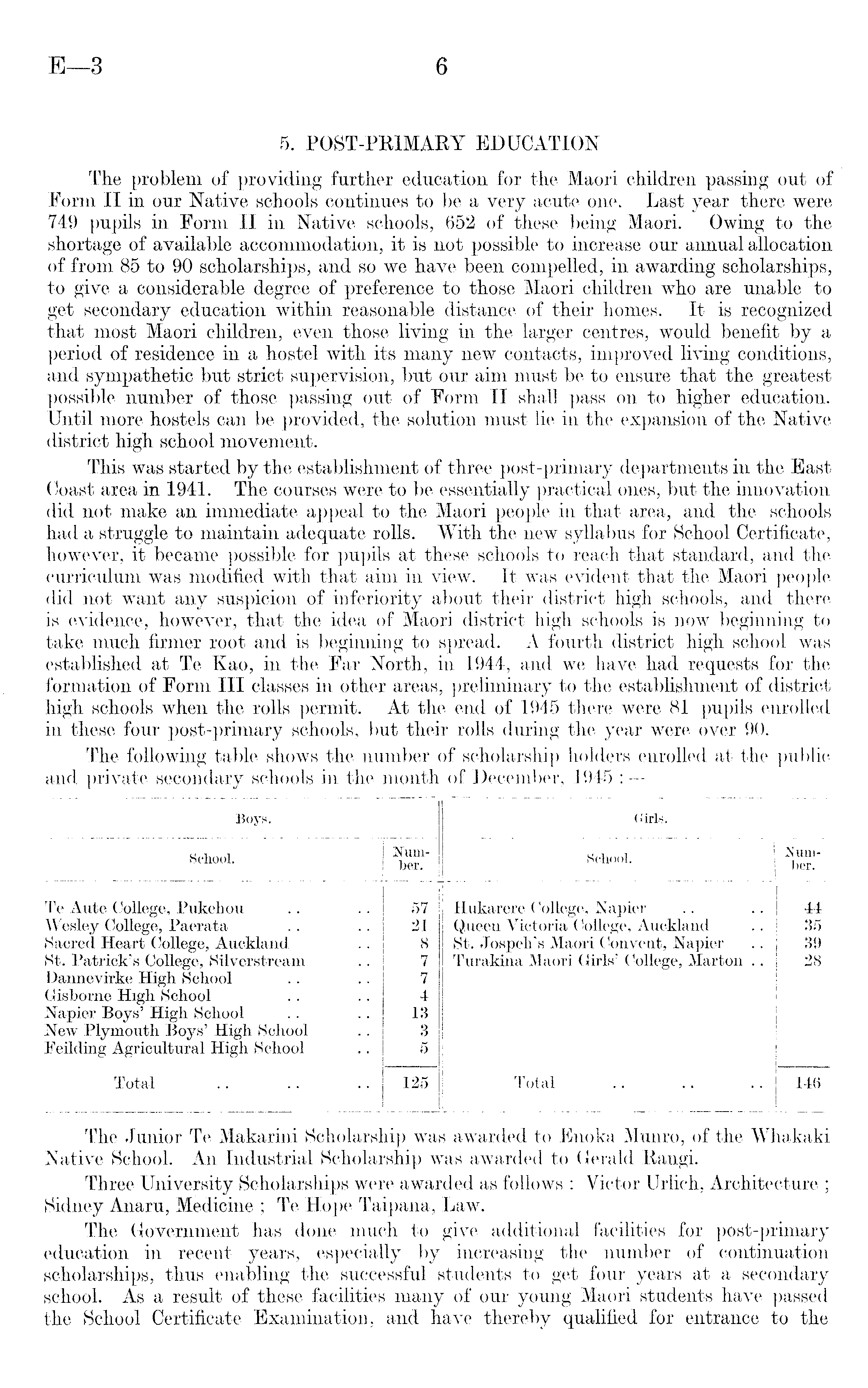 The problem of providing further education for the Maori children passing out of Form II in our Native schools continues to be a very acute one. Last year there were 749 pupils in Form II in Native schools, 652 of these being Maori. Owing to the shortage of available accommodation, it is not possible to increase our annual allocation of from 85 to 90 scholarships, and so we have been compelled, in awarding scholarships, to give a considerable degree of preference to those Maori children who are unable to get secondary education within reasonable distance of their homes. It is recognized that most Maori children, even those living in the larger centres, would benefit by a period of residence in a hostel with its many new contacts, improved living conditions, and sympathetic but strict supervision, but our aim must be to ensure that the greatest possible number of those passing out of Form II shall pass on to higher education. Until more hostels can be provided, the solution must lie in the expansion of the Native district high school movement. This was started by the establishment of three post-primary departments in the East Coast area in 1941. The courses were to be essentially practical ones, but the innovation did not make an immediate appeal to the Maori people in that area, and the schools had a struggle to maintain adequate rolls. With the new syllabus for School Certificate, however, it became possible for pupils at these schools to reach that standard, and the curriculum was modified with that aim in view. It was evident that the Maori people did not want any suspicion of inferiority about their district high schools, and there is evidence, however, that the idea of Maori district high schools is now beginning to take much firmer root and is beginning to spread. A fourth district high school was established at Te Kao, in the Far North, in 1944, and we have had requests for the formation of Form 111 classes in other areas, preliminary to the establishment of district high schools when the rolls permit. At the end of 1945 there were 81 pupils enrolled in these four post-primary schools, but their rolls during the year were over 90. The following table shows the number of scholarship holders enrolled at the public and private secondary schools in the month of December, 1945 :