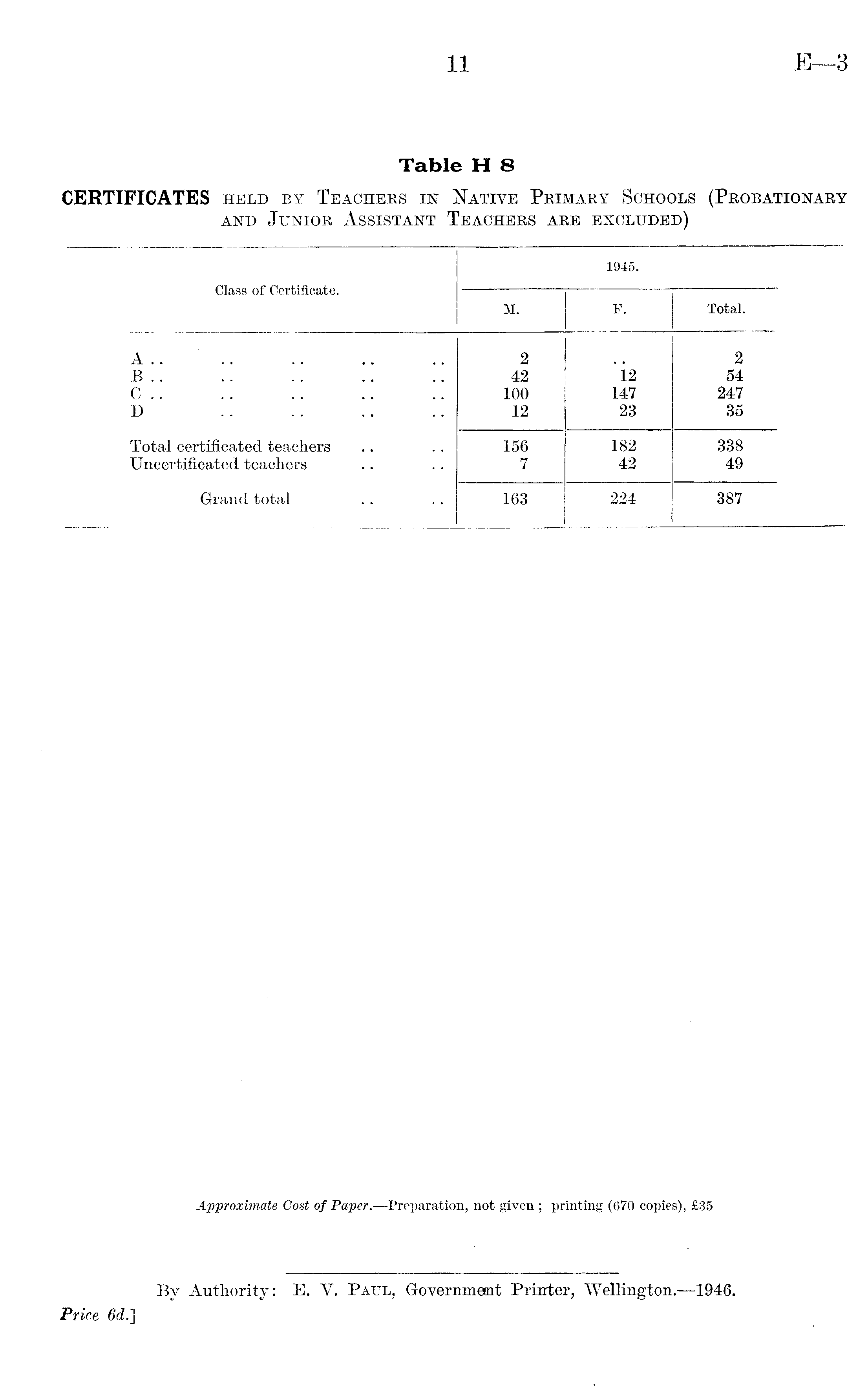 1945. Class of Certificate. M. F. Total. A .. .. 2 2 B .. 42 12 54 C 100 147 247 D 12 23 35 Total certificated teachers 156 182 338 Uncertificated teachers 7 42 49 Grand total 163 224 387