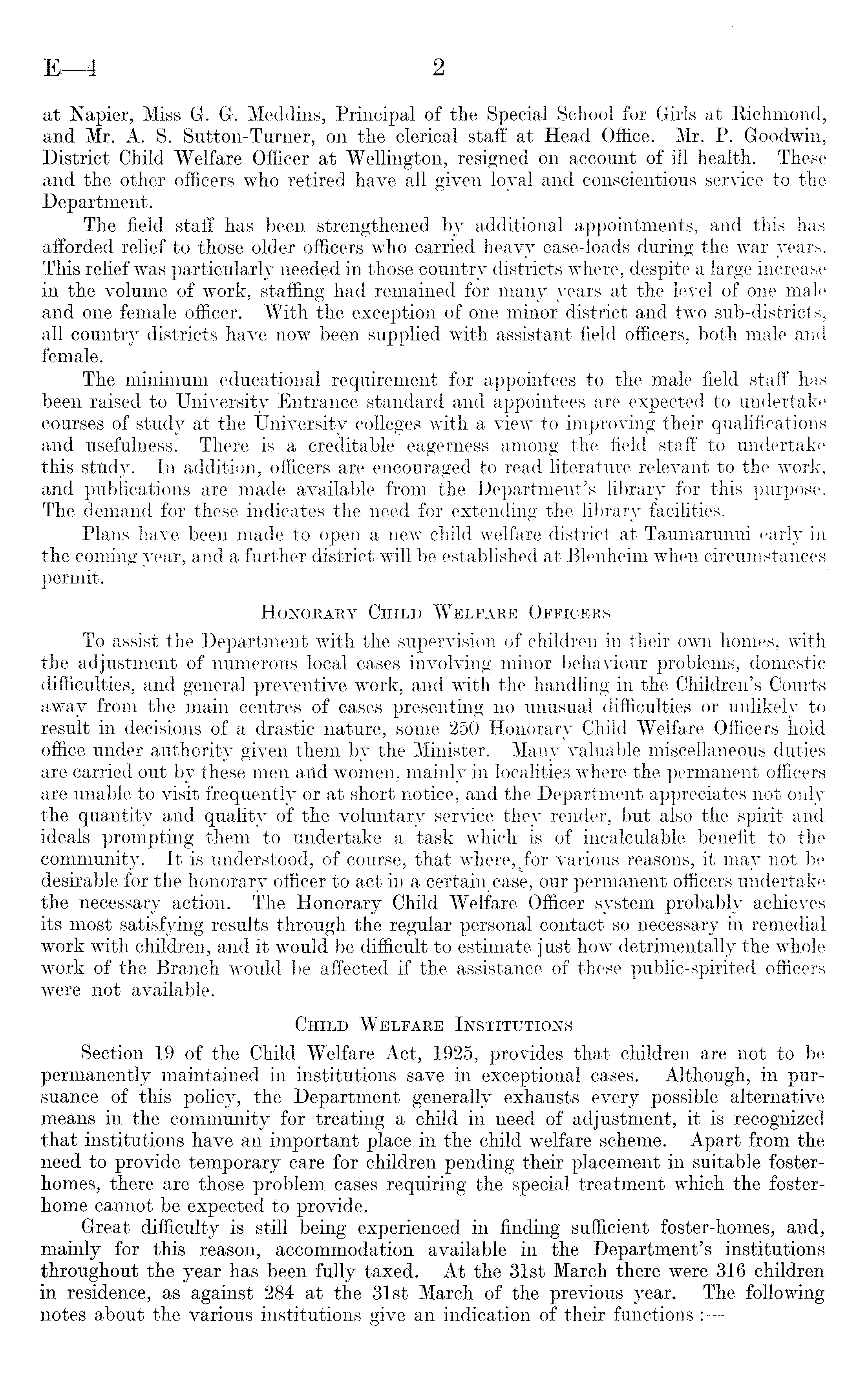 at Napier, Miss G. G. Meddins, Principal of the Special School for Girls at Richmond, and Mr. A. S. Sutton-Turner, on the clerical staff at Head Office. Mr. P. Goodwin, District Child Welfare Officer at Wellington, resigned on account of ill health. These and the other officers who retired have all given loyal and conscientious service to the Department. The field staff has been strengthened by additional appointments, and this has afforded relief to those older officers who carried heavy case-loads during the war years. This relief was particularly needed in those country districts where, despite a large increase in the volume of work, staffing had remained for many years at the level of one male and one female officer. With the exception of one minor district and two sub-districts, all country districts have now been supplied with assistant field officers, both male and female. The minimum educational requirement for appointees to the male field staff has been raised to University Entrance standard and appointees are expected to undertake courses of study at the University colleges with a view to improving their qualifications and usefulness. There is a creditable eagerness among the field staff to undertake this study. In addition, officers are encouraged to read literature relevant to the work, and publications are made available from the Department's library for this purpose. The demand for these indicates the need for extending the library facilities. Plans have been made to open a new child welfare district at Taumarunui early in the coming year, and a further district will be established at Blenheim when circumstances permit. Honorary Child Welfare Officers To assist the Department with the supervision of children in their own homes, with the adjustment of numerous local cases involving minor behaviour problems, domestic difficulties, and general preventive work, and with the handling in the Children's Courts away from the main centres of cases presenting no unusual difficulties or unlikely to result in decisions of a drastic nature, some 250 Honorary Child Welfare Officers hold office under authority given them by the Minister. Many valuable miscellaneous duties are carried out by these men and women, mainly in localities where the permanent officers are unable to visit frequently or at short notice, and the Department appreciates not only the quantity and quality of the voluntary service they render, but also the spirit and ideals prompting them to undertake a task which is of incalculable benefit to the community. It is understood, of course, that whereof or various reasons, it may not be desirable for the honorary officer to act in a certain case, our permanent officers undertake the necessary action. The Honorary Child Welfare Officer system probably achieves its most satisfying results through the regular personal contact so necessary in remedial work with children, and it would be difficult to estimate just how detrimentally the whole work of the Branch would be affected if the .assistance of these public-spirited officers were not available. Child Welfare Institutions Section 19 of the Child Welfare Act, 1925, provides that children are not to be permanently maintained in institutions save in exceptional cases. Although, in pursuance of this policy, the Department generally exhausts every possible alternative means in the community for treating a child in need of adjustment, it is recognized that institutions have an important place in the child welfare scheme. Apart from the need to provide temporary care for children pending their placement in suitable fosterhomes, there are those problem cases requiring the special treatment which the fosterhome cannot be expected to provide. Great difficulty is still being experienced in finding sufficient foster-homes, and, mainly for this reason, accommodation available in the Department's institutions throughout the year has been fully taxed. At the 31st March there were 316 children in residence, as against 284 at the 31st March of the previous year. The following notes about the various institutions give an indication of their functions :