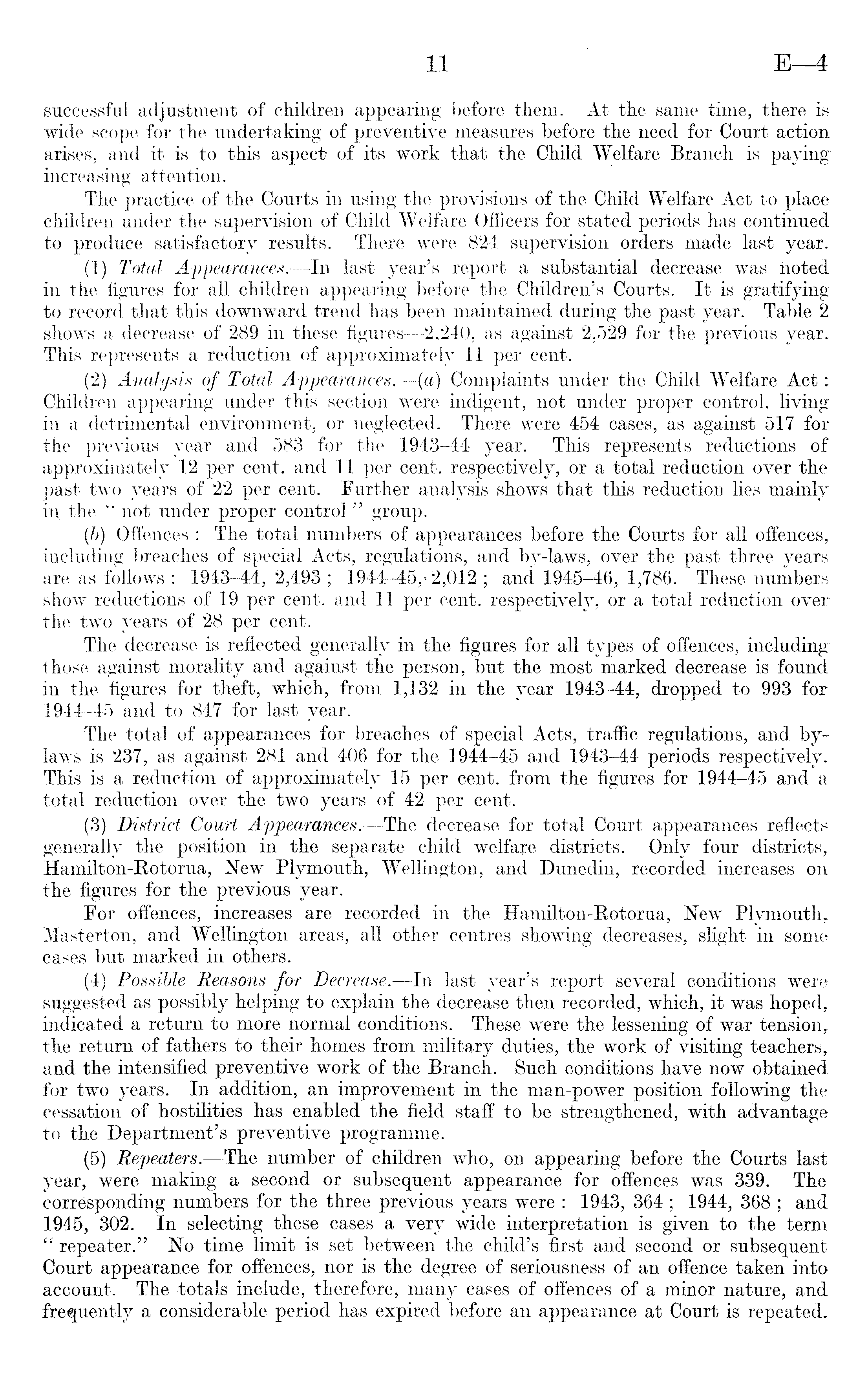 successful adjustment of children appearing before them. At the same time, there is wide scope for the undertaking of preventive measures before the need for Court action arises, and it is to this aspect of its work that the Child Welfare Branch is paying increasing attention. The practice of the Courts in using the provisions of the Child Welfare Act to place children under the supervision of Child Welfare Officers for stated periods has continued to produce satisfactory results. There were 824 supervision orders made last year. (1) Total Appearances. —In last year's report a substantial decrease was noted in the figures for all children appearing before the Children's Courts. It is gratifying to record that this downward trend has been maintained during the past year. Table 2 shows a decrease of 289 in these figures—2,24o, as against 2,529 for the previous year. This represents a reduction of approximately 11 per cent. (2) Analysis of Total Appearances.—(a) Complaints under the Child Welfare Act: Children appearing under this section were indigent, not under proper control, living in a detrimental environment, or neglected. There were 454 cases, as against 517 for the previous year and 583 for the 1943-44 year. This represents reductions of approximately 12 per cent, and 11 per cent, respectively, or a total reduction over the past two years of 22 per cent. Further analysis shows that this reduction lies mainly in the " not under proper control " group. (b) Offences : The total numbers of appearances before the Courts for all offences, including breaches of special Acts, regulations, and by-laws, over the past three years are as follows : 1943-44, 2,493 ; 1944-45/2,012 ; and 1945-46, 1,786. These numbers show reductions of 19 per cent, and 11 per cent, respectively, or a total reduction over the two years of 28 per cent. The decrease is reflected generally in the figures for all types of offences, including those against morality and against the person, but the most marked decrease is found in the figures for theft, which, from 1,132 in the year 1943-44, dropped to 993 for 1944-45 and to 847 for last year. The total of appearances for breaches of special Acts, traffic regulations, and bylaws is 237, as against 281 and 406 for the 1944-45 and 1943-44 periods respectively. This is a reduction of approximately 15 per cent, from the figures for 1944-45 and a total reduction over the two years of 42 per cent. (3) District Court Appearances.—The decrease for total Court appearances reflects generally the position in the separate child welfare districts. Only four districts, Hamilton-Rotorua, New Plymouth, Wellington, and Dunedin, recorded increases on the figures for the previous year. For offences, increases are recorded in the Hamilton-Rotorua, New Plymouth, Masterton, and Wellington areas, all other centres showing decreases, slight in some cases but marked in others. (4) Possible Reasons for Decrease. —In last year's report several conditions were suggested as possibly helping to explain the decrease then recorded, which, it was hoped, indicated a return to more normal conditions. These were the lessening of war tension, the return of fathers to their homes from military duties, the work of visiting teachers, and the intensified preventive work of the Branch. Such conditions have now obtained for two years. In addition, an improvement in the man-power position following the cessation of hostilities has enabled the field staff to be strengthened, with advantage to the Department's preventive programme. (5) Repeaters. —The number of children who, on appearing before the Courts last year, were making a second or subsequent appearance for offences was 339. The corresponding numbers for the three previous years were : 1943, 364 ; 1944, 368 ; and 1945, 302. In selecting these cases a very wide interpretation is given to the term " repeater." No time limit is set between the child's first and second or subsequent Court appearance for offences, nor is the degree of seriousness of an offence taken into account. The totals include, therefore, many cases of offences of a minor nature, and frequently a considerable period has expired before an appearance at Court is repeated.