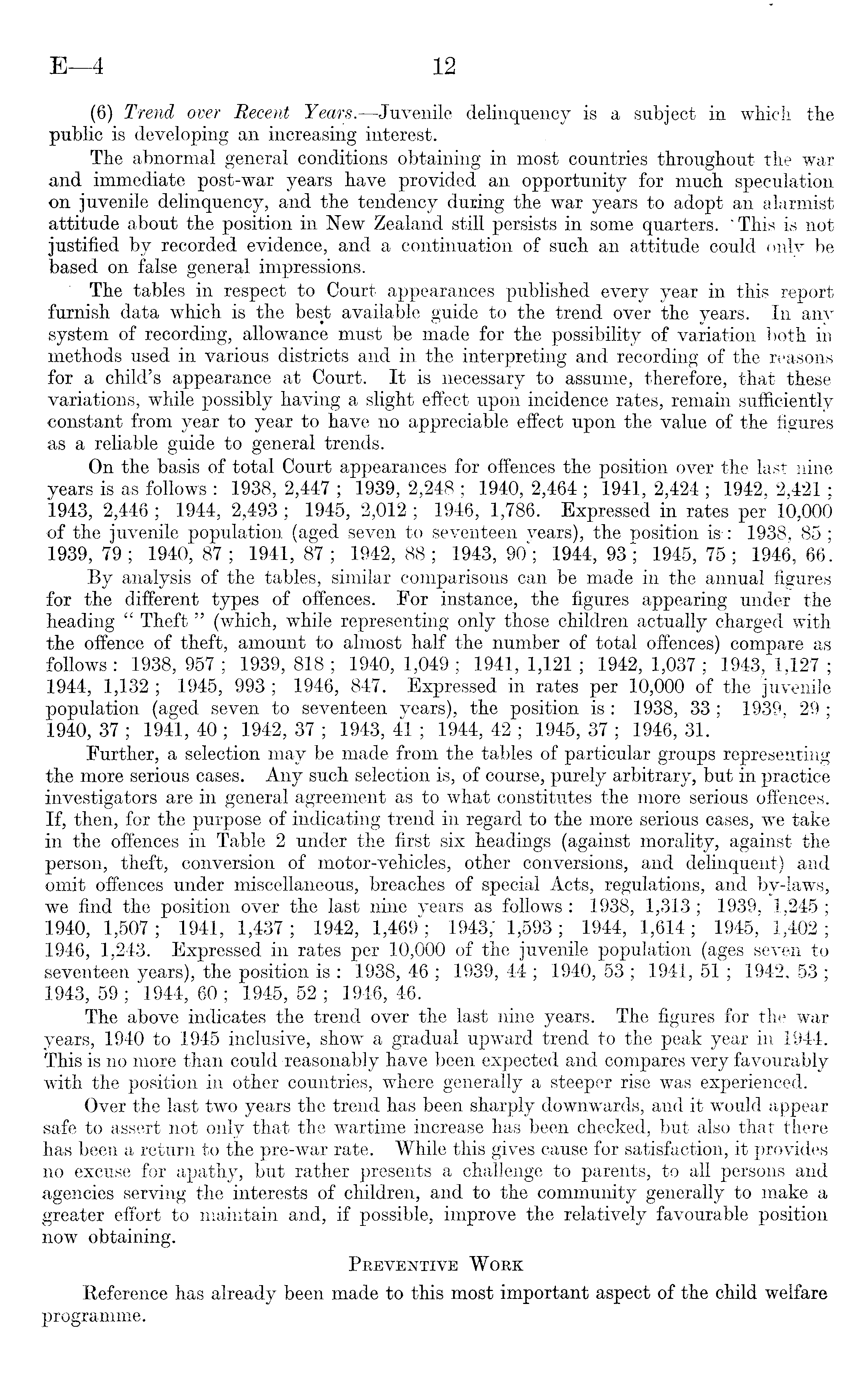 The abnormal general conditions obtaining in most countries throughout the war and immediate post-war years have provided an opportunity for much speculation on juvenile delinquency, and the tendency during the war years to adopt an alarmist attitude about the position in New Zealand still persists in some quarters. ' This is not justified by recorded evidence, and a continuation of such an attitude could only be based on false general impressions. The tables in respect to Court appearances published every year in this report furnish data which is the best available guide to the trend over the years. In any system of recording, allowance must be made for the possibility of variation both in methods used in various districts and in the interpreting and recording of the reasons for a child's appearance at Court. It is necessary to assume, therefore, that these variations, while possibly having a slight effect upon incidence rates, remain sufficiently constant from year to year to have no appreciable effect upon the value of the figures as a reliable guide to general trends. On the basis of total Court appearances for offences the position over the last nine years is as follows : 1938, 2,447 ; 1939, 2,248 ; 1940, 2,464 ; 1941, 2,424 ; 1942, 2,421; 1943, 2,446 ; 1944, 2,493 ; 1945, 2,012 ; 1946, 1,786. Expressed in rates per 10,000 of the juvenile population (aged seven to seventeen vears), the position is : 1938, 85 ; 1939,79; 1940,87; 1941,87; 1942,88; 1943, 90"; 1944, 931 1945,75; 1946,66. By analysis of the tables, similar comparisons can be made in the annual figures for the different types of offences. For instance, the figures appearing under the heading " Theft " (which, while representing only those children actually charged with the offence of theft, amount to almost half the number of total offences) compare as follows : 1938, 957 ; 1939, 818 ; 1940, 1,049 ; 1941, 1^,121; 1942, 1,037 ; 1943, 1,127 ; 1944, 1,132 ; 1945, 993 ; 1946, 847. Expressed in rates per 10,000 of the juvenile population (aged seven to seventeen years), the position is : 1938, 33; 1939, 29 ; 1940, 37 ; 1941, 40 ; 1942, 37 ; 1943, 41 ; 1944, 42 ; 1945, 37 ; 1946, 31. Further, a selection may be made from the tables of particular groups representing the more serious cases. Any such selection is, of course, purely arbitrary, but in practice investigators are in general agreement as to what constitutes the more serious offences. If, then, for the purpose of indicating trend in regard to the more serious cases, we take in the offences in Table 2 under the first six headings (against morality, against the person, theft, conversion of motor-vehicles, other conversions, and delinquent) and omit offences under miscellaneous, breaches of special Acts, regulations, and by-laws, we find the position over the last nine years as follows : 1938, 1,313; 1939, 1,245 ; 1940, 1,507 ; 1941, 1,437 ; 1942, 1,469"; 1943," 1,593; 1944, 1,614; 1945, 1,402 ; 1946, 1,243. Expressed in rates per 10,000' of the juvenile population (ages seven to seventeen years), the position is : 1938, 46 ; 1939, 44 ; 1940, 53 ; 1941, 51 ; 1942, 53 ; 1943, 59 ; 1944, 60 ; 1945, 52 ; 1946, 46. The above indicates the trend over the last nine years. The figures for the war years, 1940 to 1945 inclusive, show a gradual upward trend to the peak year in 1944. This is no more, than could reasonably have been expected and compares very favourably with the position in other countries, where generally a steeper rise was experienced. Over the last two years the trend has been sharply downwards, and it would appear safe to assert not only that the wartime increase has been checked, but also that there has been a return to the pre-war rate. While this gives cause for satisfaction, it provides no excuse for apathy, but rather presents a challenge to parents, to all persons and agencies serving the interests of children, and to the community generally to make a greater effort to maintain and, if possible, improve the relatively favourable position now obtaining. Preventive Work Reference has already been made to this most important aspect of the child welfare programme.