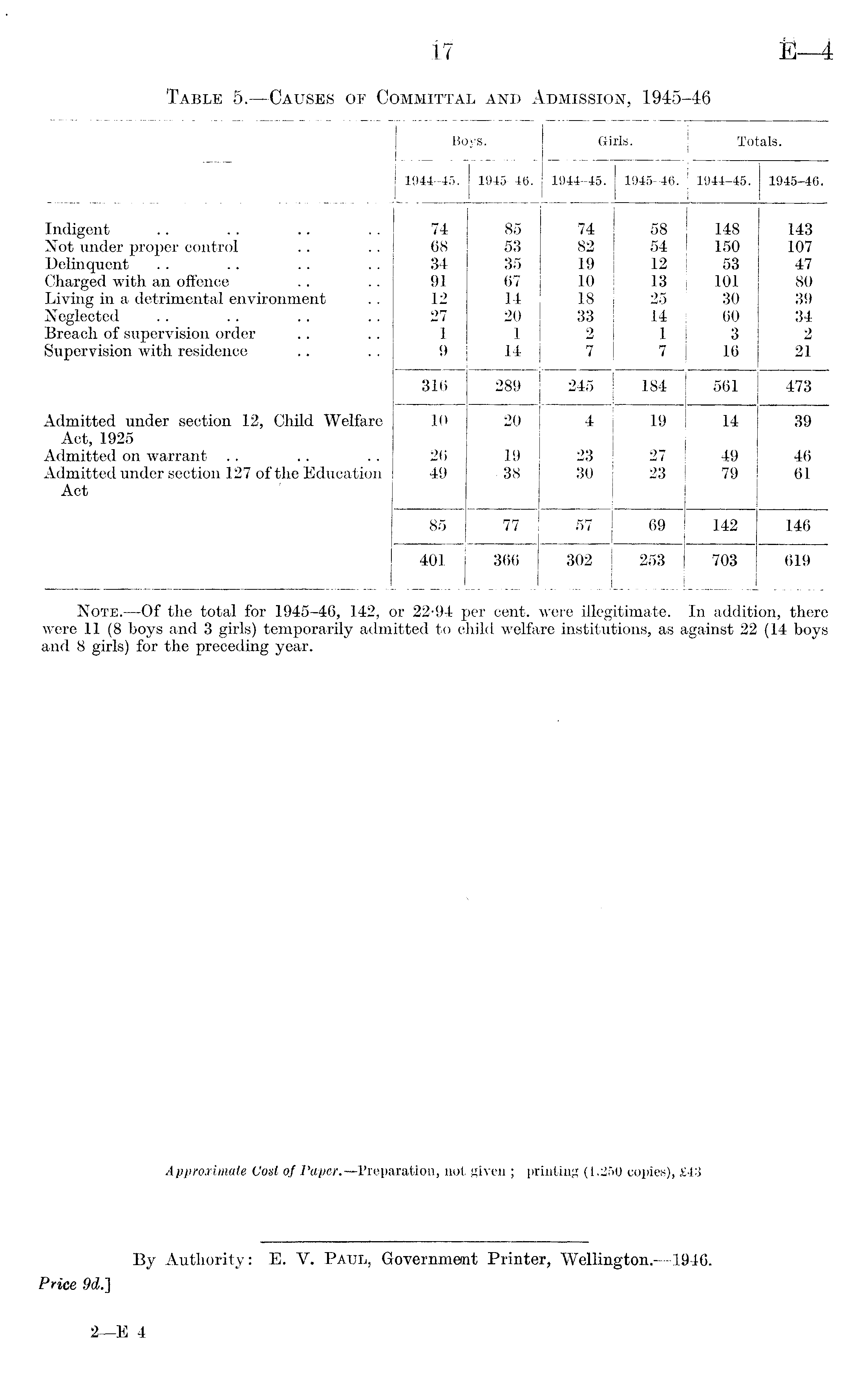 Boys. Girls. Totals. 1944-45. 1945-46. 1944-45. 1945-46. 1944-45. 1945-46. Indigent 74 85 74 58 148 143 Not under proper control 68 53 82 54 150 107 Delinquent 34 35 19 12 53 47 Charged with an offence 91 67 10 13 101 80 Living in a detrimental environment 12 14 18 25 30 39 Neglected 27 20 33 14 60 34 Breach of supervision order 1 1 2 1 3 2 Supervision with residence 9 14 7 7 16 21 316 289 245 184 561 473 Admitted under section 12, Child Welfare 10 20 4 19 14 39 Act, 1925 Admitted on warrant 26 19 23 27 49 46 Admitted under section 127 of the Education 49 -38 30 23 79 61 Act 85 77 57 69 142 146 401 366 302 253 703 619 Note. —Of the total for 1945-46, 142, or 22-94 per cent, were illegitimate, were 11 (8 boys and 3 girls) temporarily admitted to child welfare institutions, as a and 8 girls) for the preceding year. In addition, there igainst 22 (14 boys