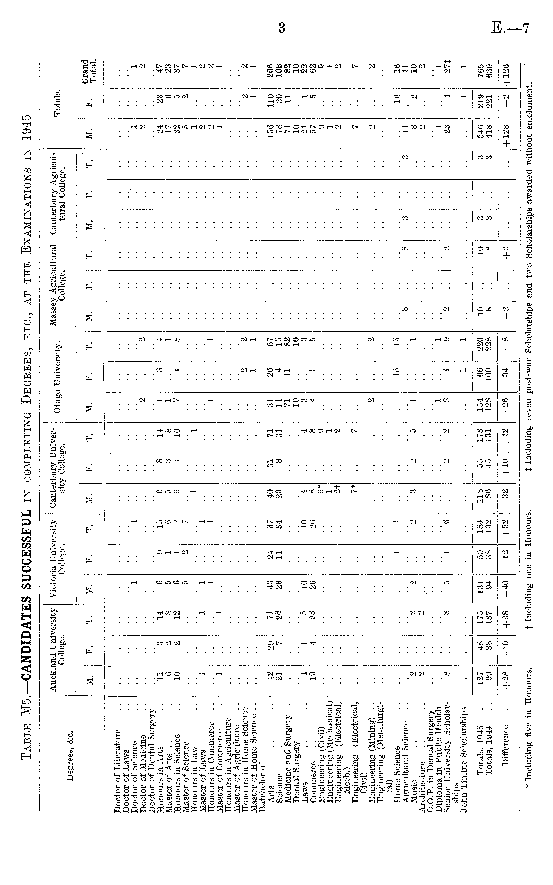 Degrees, &c. Auckland University College. Victoria University College. Canterbury University College. Otago University. Massey Agricultural College. Canterbury Agricultural College. Totals. M. F. T. M. F. T. M. F. T. M. F. T. M. F. T. M. F. T. M. F. Grand Total. Doctor of Literature Doctor of Laws Doctor of Science Doctor of Medicine Doctor of Dental Surgery Honours in Arts Master of Arts Honours in Science Master of Science Honours in Law Master of Laws Honours in Commerce Master of Commerce Honours in Agriculture .. Master of Agriculture Hpnours in Home Science Master of Home Science .. Batchelor of— Arts • Science Medicine aiid Surgery .. Dental Surgery Laws Commerce.... Engineering (Civil) Engineering (Mechanical) Engineering (Electrical, Mech.) Engineering (Electrical, Civil) Engineering (Mining) .. Engineering (Metallurgical) Home Science Agricultural Science .. Music Architecture C.O.P. in Dental Surgery Diploma in Public Health Senior University Scholarships John Tinline Scholarships Totals, 1945 .. Totals, 1944 Difference ii 6 10 "l ' 1 42 21 "4 19 ' *2 2 ' 8 ' S 2 2 29 7 ' 1 4 14 8 12 ' 1 ' 1 71 28 ' 5 23 ' '2 2 ' '8 ' 'l ' 6 5 6 5 ' 1 1 43 23 io 26 ' '2 5 ' 9 1 1 2 24 11 1 ' 1 ' 1 is 6 7 7 ' 1 1 67 34 io 26 1 ' '2 ' *6 "6 5 9 "l 40 23 ' '4 8 9* 1 2t 7* 3 "8 3 1 31 8 ' '2 ' 2 U 8 10 ' 1 71 31 ' '4 8 9 1 2 7 "5 "2 "2 "l 1 7 "l 31 11 71 10 3 4 2 ' 'l ' 1 8 ' 3 ' 1 "2 1 26 4 11 ' 1 15 ' 1 1 ' '2 ' 4 1 8 "l "2 1 57 15 82 10 3 5 2 15 ' 1 ' 'l 9 1 ' '8 "2 "8 ' 2 "3 1 "3 ' 'l 2 '24 17 32 5 1 2 2 1 166 78 71 10 21 57 9 1 2 7 2 11 8 "l 23 23 6 5 2 "2 1 110 30 11 ' 1 5 16 "2 ' 4 1 ' 'i 2 '47 23 37 7 1 2 2 1 "2 1 266 108 82 10 22 62 9 1 2 7 2 16 11 10 2 ' "l 27t 1 127 99 48 38 175 137 134 94 50 38 184 132 118 86 55 45 173 131 154 128 66 100 220 228 10 8 10 8 3 3 3 . 3 546 418 219 221 765 639 + 28 + 10 +38 + 40 +12 + 52 + 32 + 10 + 42 +26 -34 -8 + 2 , +2 + 128 -2 +126 * Including Ave in Honours. t Including one in Honours. | Including seven post-war Scholarships and two Scholarships awarded without emolument.