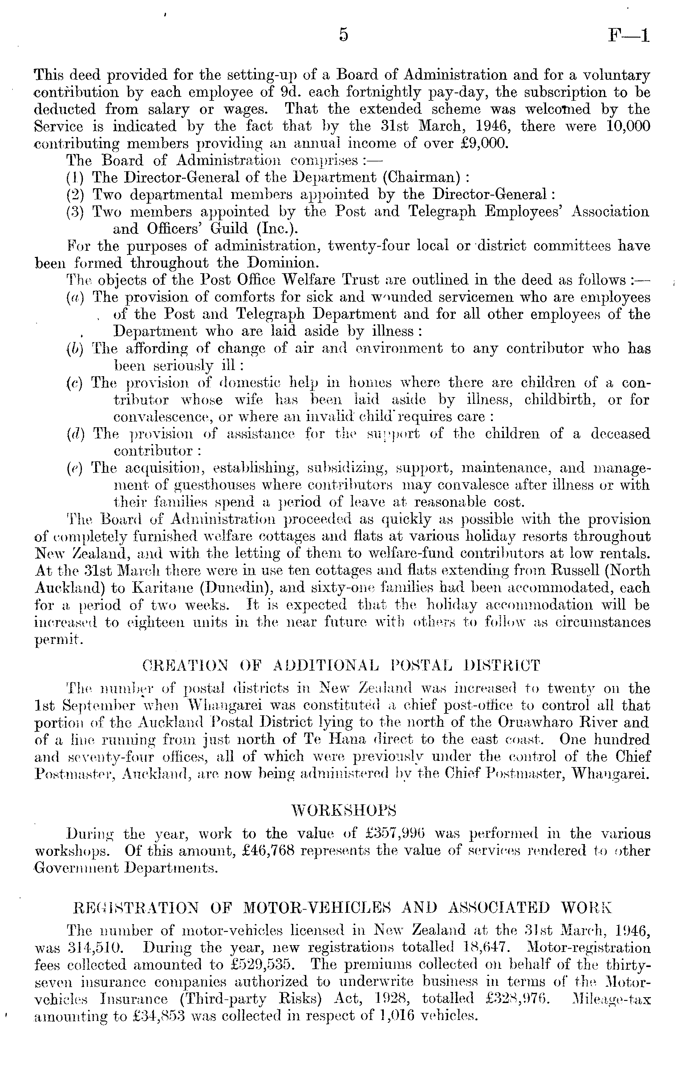 This deed provided for the setting-up of a Board of Administration and for a voluntary contribution by each employee of 9d. each fortnightly pay-day, the subscription to be deducted from salary or wages. That the extended scheme was welcomed by the Service is indicated by the fact that by the 31st March, 1946, there Were 10,000 contributing members providing an annual income of over £9,000. The Board of Administration comprises : (1) The Director-General of the Department (Chairman) : (2) Two departmental members appointed by the Director-General: (3) Two members appointed by the Post and Telegraph Employees' Association and Officers' Guild (Inc.). For the purposes of administration, twenty-four local or district committees have been formed throughout the Dominion. The objects of the Post Office Welfare Trust are outlined in the deed as follows : (a) The provision of comforts for sick and wounded servicemen who are employees , of the Post and Telegraph Department and for all other employees of the Department who are laid aside by illness : {b) The affording of change of air and environment to any contributor who has been seriously ill: {c) The provision of domestic help in homes where there are children of a contributor whose wife has been laid aside by illness, childbirth, or for convalescence, or where an invalid' child" requires care : (d) The provision of assistance for the support of the children of a deceased contributor : (e) The acquisition, establishing, subsidizing, support, maintenance, and management of guesthouses where contributors may convalesce after illness or with their families spend a period of leave at reasonable cost. The Board of Administration proceeded as quickly as possible with the provision of completely furnished welfare cottages and flats at various holiday resorts throughout New Zealand, and with the letting of them to welfare-fund contributors at low rentals. At the 3'lst March there were in use ten cottages and flats extending from Russell (North Auckland) to Karitane (Dunedin), and sixty-one families had been accommodated, each for a period of two weeks. It is expected that the holiday accommodation will be increased to eighteen units in the near future with others to follow as circumstances permit. CREATION OF ADDITIONAL POSTAL DISTRICT The number of postal districts in New Zealand was increased to twenty on the Ist September when Whangarei was constituted a chief post-office to control all that portion of the Auckland Postal District lying to the north of the Oruawharo River and of a line running from just north of Te Hana direct to the east coast. One hundred and seventy-four offices, all of which were previously under the control of the Chief Postmaster, Auckland, are now being administered by the Chief Postmaster, Whangarei. WORKSHOPS During the year, work to the value of £357,996 was performed in the various workshops. Of this amount, £46,768 represents the value of services rendered to other •Government Departments. REGISTRATION OF MOTOR-VEHICLES AND ASSOCIATED WORK The number of motor-vehicles licensed in New Zealand at the 31st March, 1946, was 314,510. During the year, new registrations totalled 18,647. Motor-registration fees collected amounted to £529,535. The premiums collected on behalf of the thirtyseven insurance companies authorized to underwrite business in terms of the Motorvehicles Insurance (Third-party Risks) Act, 1928, totalled £328,976. Mileage-tax amounting to £34,853 was collected in respect of 1,016 vehicles.