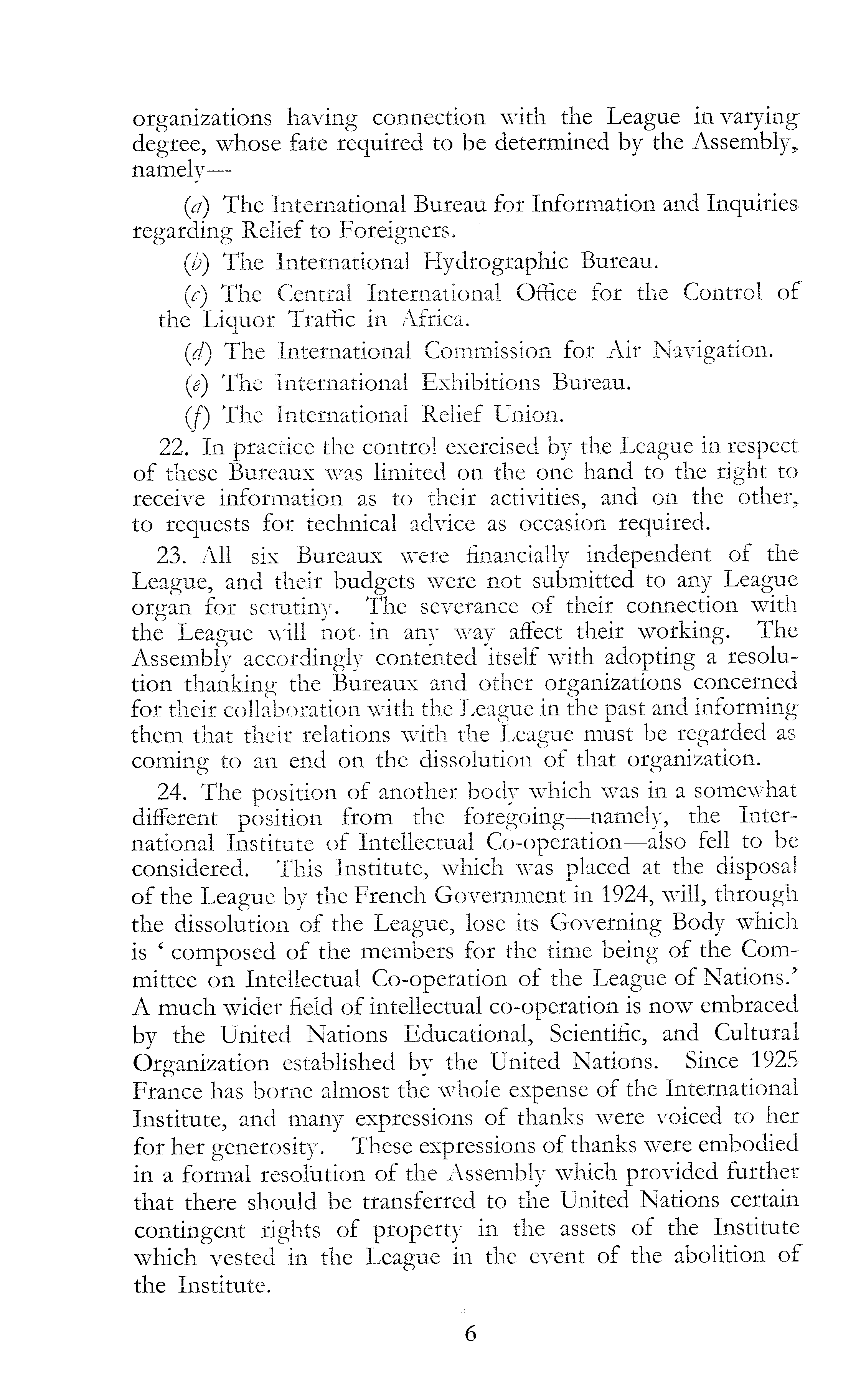 organizations having connection with the League in varying degree, whose fate required to be determined by the Assembly, namely—(a) The International Bureau for Information and Inquiries regarding Relief to Foreigners. (b) The International Hydrographic Bureau. ( c) The Central International Office for the Control of the Liquor Traffic in Africa. (d) The International Commission for Air Navigation. (e) The International Exhibitions Bureau. (f) The International Relief Union. 22. In practice the control exercised by the League in respect of these Bureaux was limited on the one hand to the right to receive information as to their activities, and on the other, to requests for technical advice as occasion required. 23. All six Bureaux were financially independent of the League, and their budgets were not submitted to any League organ for scrutiny. The severance of their connection with the League will not- in any way affect their working. The Assembly accordingly contented itself with adopting a resolution thanking the Bureaux and other organizations concerned for their collaboration with the League in the past and informing them that their relations with the League must be regarded as coming to an end on the dissolution of that organization. 24. The position of another body which was in a somewhat different position from the foregoing —namely, the International Institute of Intellectual Co-operation —also fell to be considered. This Institute, which was placed at the disposal of the League by the French Government in 1924, will, through the dissolution of the League, lose its Governing Body which is ' composed of the members for the time being of the Committee on Intellectual Co-operation of the League of Nations/ A much wider field of intellectual co-operation is now embraced by the United Nations Educational, Scientific, and Cultural Organization established by the United Nations. Since 1925 France has borne almost the whole expense of the International Institute, and many expressions of thanks were voiced to her for her generosity. These expressions of thanks were embodied in a formal resolution of the Assembly which provided further that there should be transferred to the United Nations certain contingent rights of property in the assets of the Institute which vested in the League in the event of the abolition of the Institute.