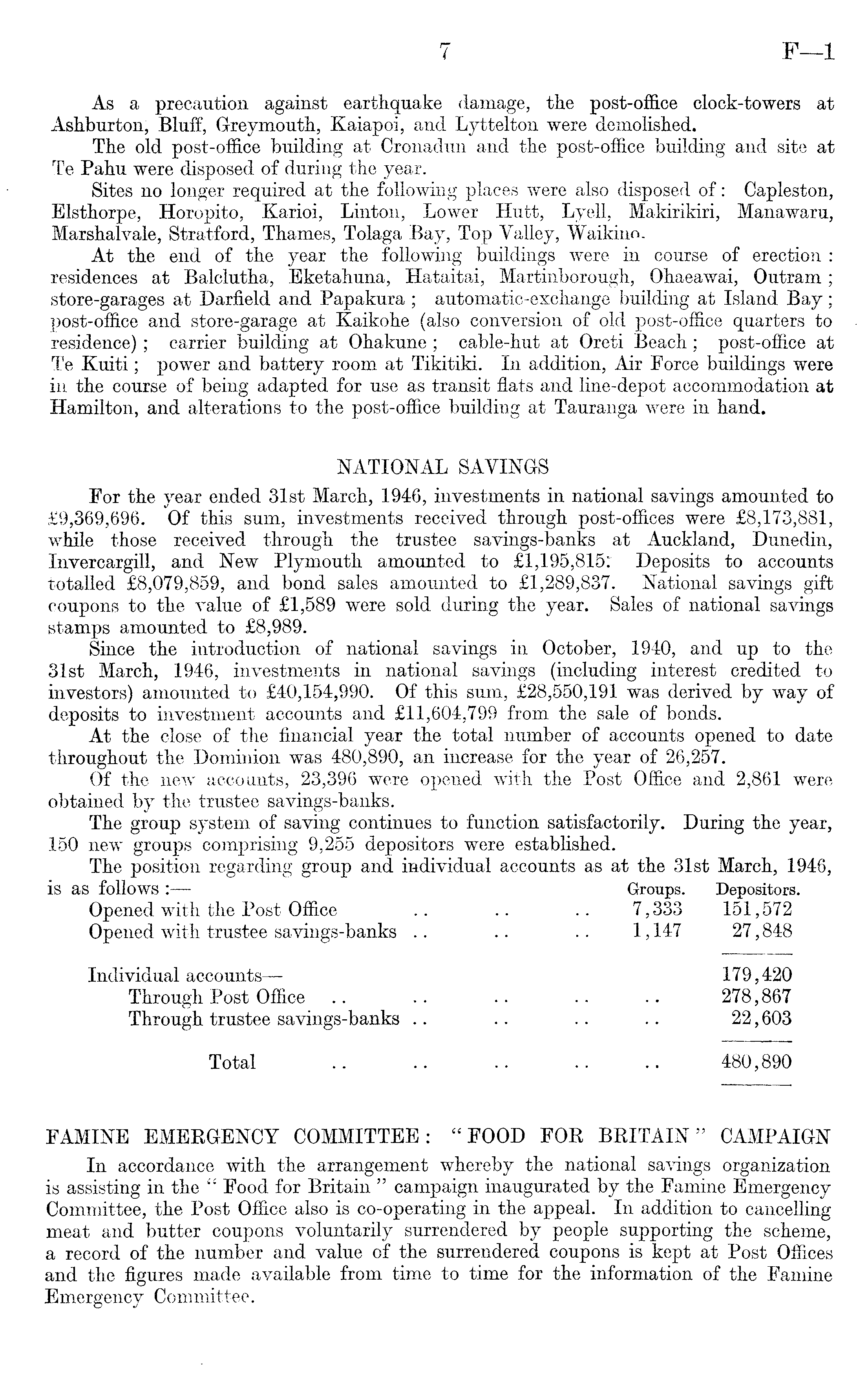 As a precaution against earthquake damage, the post-office clock-towers at Ashburton, Bluff, Greymouth, Kaiapoi, and Lyttelton were demolished. The old post-office building at Cronadun and the post-office building and site at Te Pahu were disposed of during the year. Sites no longer required at the following places were also disposed of: Capleston, Blsthorpe, Horopito, Karioi, Linton, Lower Hutt, Lyell, Makirikiri, Manawaru, Marshalvale, Stratford, Thames, Tolaga Bay, Top Valley, Waikino. At the end of the year the following buildings were in course of erection : residences at Balclutha, Eketahuna, Hataitai, Martinborough, Ohaeawai, Outram; store-garages at Darfield and Papakura ; automatic-exchange building at Island Bay; post-office and store-garage at Kaikohe (also conversion of old post-office quarters to residence); carrier building at Ohakune ; cable-hut at Oreti Beach; post-office at Te Kuiti; power and battery room at Tikitiki. In addition, Air Force buildings were in the course of being adapted for use as transit flats and line-depot accommodation at Hamilton, and alterations to the post-office building at Tauranga were in hand. NATIONAL SAYINGS For the year ended 31st March, 1946, investments in national savings amounted to £9,369,696. Of this sum, investments received through post-offices were £8,173,881, while those received through the trustee savings-banks at Auckland, Dunedin, Invercargill, and New Plymouth amounted to £1,195,815: Deposits to accounts totalled £8,079,859, and bond sales amounted to £1,289,837. National savings gift coupons to the value of £1,589 were sold during the year. Sales of national savings stamps amounted to £8,989. Since the introduction of national savings in October, 1940, and up to the 31st March, 1946, investments in national savings (including interest credited to investors) amounted to £40,154,990. Of this sum, £28,550,191 was derived by way of deposits to investment accounts and £11,604,799 from the sale of bonds. At the close of the financial year the total number of accounts opened to date throughout the Dominion was 480,890, an increase for the year of 26,257. Of the new accounts, 23,396 were opened with the Post Office and 2,861 were obtained by the trustee savings-banks. The group system of saving continues to function satisfactorily. During the year, 150 new groups comprising 9,255 depositors were established. The position regarding group and individual accounts as at the 31st March, 1946, is as follows : Groups. Depositors. OpenedwiththePostOffi.ee .. .. .. 7,333 151,572 Opened with trustee savings-banks .. .. .. 1,147 27,848 Individual accounts — 179,420 Through Post Office .. .. .. .. .. 278,867 Through trustee savings-banks .. .. .. .. 22,603 Total .. .. .. .. .. 480,890 FAMINE EMERGENCY COMMITTEE: "FOOD FOR BRITAIN" CAMPAIGN In accordance with the arrangement whereby the national savings organization is assisting in the " Food for Britain " campaign inaugurated by the Famine Emergency Committee, the Post Office also is co-operating in the appeal. In addition to cancelling meat and butter coupons voluntarily surrendered by people supporting the scheme, a record of the number and value of the surrendered coupons is kept at Post Offices and the figures made available from time to time for the information of the Famine Emergency Committee.
