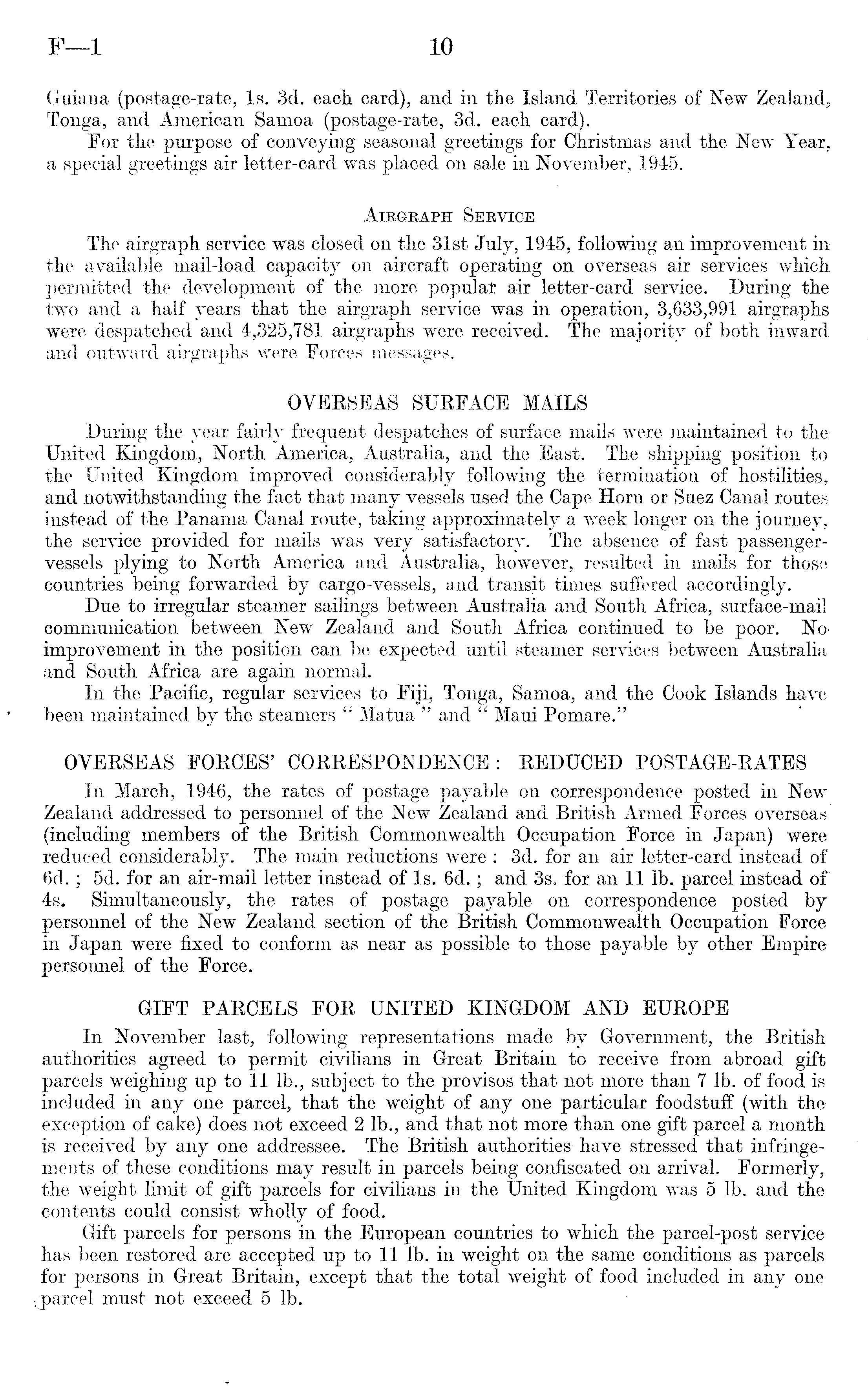 Guiana (postage-rate, Is. 3d. each, card), and in the Island Territories of New Zealand, Tonga, and American Samoa (postage-rate, 3d. each card). For the purpose of conveying seasonal greetings for Christmas and the New Year, a special greetings air letter-card was placed on sale in November, 1945. Airgraph Service The airgraph service was closed on the 31st July, 1945, following an improvement in the available mail-load capacity on aircraft operating on overseas air services which permitted the development of the more popular air letter-card"' service. During the two and a half years that the airgraph service was in operation, 3,633,991 airgraphs were despatched and 4,325,781 airgraphs were received. The majority of both inward and outward airgraphs were Forces messages. OVERSEAS SURFACE MAILS During the year fairly frequent despatches of surface mails were maintained to the United Kingdom, North America, Australia, and the East. The shipping position to the United Kingdom improved considerably following the termination of hostilities, and notwithstanding the fact that many vessels used the Cape Horn or Suez Canal routes instead of the Panama Canal route, taking approximately a week longer on the journey, the service provided for mails was very satisfactory. The absence of fast passengervessels plying to North America and Australia, however, resulted in mails for those countries being forwarded by cargo-vessels, and transit times suffered accordingly. Due to irregular steamer sailings between Australia and South Africa, surface-mail communication between New Zealand and South Africa continued to be poor. Noimprovement in the position can be expected until steamer services between Australia and South Africa are again normal. In the Pacific, regular services to Fiji, Tonga, Samoa, and the Cook Islands have been maintained by the steamers " Matua " and " Maui Pomare." OVERSEAS FORCES' CORRESPONDENCE: REDUCED POSTAGE-RATES In March, 1946, the rates of postage payable on correspondence posted in New Zealand addressed to personnel of the New Zealand and British Armed Forces overseas (including members of the British Commonwealth Occupation Force in Japan) were reduced considerably. The main reductions were : 3d. for an air letter-card instead of 6d. ; sd. for an air-mail letter instead of Is. 6d.; and 3s. for an 11 lb. parcel instead of 4s. Simultaneously, the rates of postage payable on correspondence posted by personnel of the New Zealand section of the British Commonwealth Occupation Force in Japan were fixed to conform as near as possible to those payable by other Empire personnel of the Force. GIFT PARCELS FOR UNITED KINGDOM AND EUROPE In November last, following representations made by Government, the British authorities agreed to permit civilians in Great Britain to receive from abroad gift parcels weighing up to 11 lb., subject to the provisos that not more than 7 lb. of food is included in any one parcel, that the weight of any one particular foodstuff (with the exception of cake) does not exceed 2 lb., and that not more than one gift parcel a month is received by any one addressee. The British authorities have stressed that infringements of these conditions may result in parcels being confiscated on arrival. Formerly, the weight limit of gift parcels for civilians in the United Kingdom was 5 lb. and the contents could consist wholly of food. Gift parcels for persons in the European countries to which the parcel-post service has been restored are accepted up to 11 lb. in weight on the same conditions as parcels for persons in Great Britain, except that the total weight of food included in any one must not exceed 5 lb.