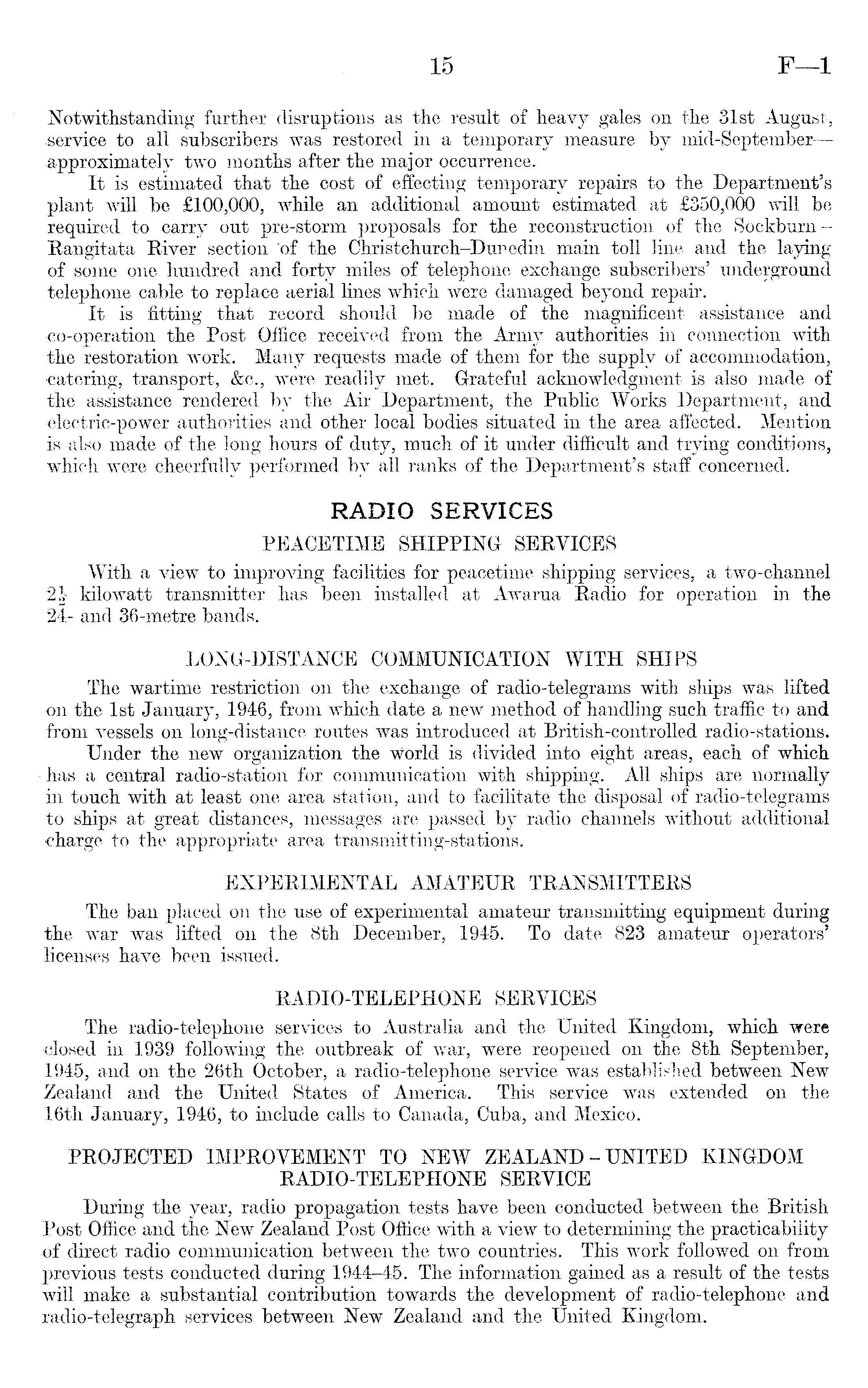 Notwithstanding further disruptions as the result of heavy gales on the 31st August, service to all subscribers was restored in a temporary measure by mid-September — approximately two months after the major occurrence. It is estimated that the cost of effecting temporary repairs to the Department's plant will be £lOO,OOO, while an additional amount estimated at £350,000 will be required to carry out pre-storm proposals for the reconstruction of the SockburnRangitata River section 'of the Christchurch-Duredin main toll line and the laying of some one hundred and forty miles of telephone exchange subscribers' underground telephone cable to replace aerial lines which were damaged beyond repair. It is fitting that record should be made of the magnificent assistance and co-operation the Post Office received from the Army authorities in connection with the restoration work. Many requests made of them for the supply of accommodation, catering, transport, &c., were readily met. Grateful acknowledgment is also made of the assistance rendered by the Air Department, the Public Works Department, and electric-power authorities and other local bodies situated in the area affected. Mention is also made of the long hours of duty, much of it under difficult and trying conditions, which were cheerfully performed by all ranks of the Department's staff concerned. RADIO SERVICES PEACETIME SHIPPING SERVICES With a view to improving facilities for peacetime shipping services, a two-channel kilowatt transmitter has been installed at Awarua Radio for operation in the 24- and 36-metre bands. LONG-DISTANCE COMMUNICATION WITH SHIPS The wartime restriction on the exchange of radio-telegrams with ships was lifted on the Ist January, 1946, from which date a new method of handling such traffic to and from vessels on long-distance routes was introduced at British-controlled radio-stations. Under the new organization the world is divided into eight areas, each of which has a central radio-station for communication with shipping. All ships are normally in touch with at least one area station, and to facilitate the disposal of radio-telegrams to ships at great distances, messages are passed by radio channels without additional charge to the appropriate area transmitting-stations. EXPERIMENTAL AMATEUR TRANSMITTERS The ban placed on the use of experimental amateur transmitting equipment during the war was lifted on the Bth December, 1945. To date 823 amateur operators' licenses have been issued. RADIO-TELEPHONE SERVICES The radio-telephone services to Australia and the United Kingdom, which were closed in 1939 following the outbreak of war, were reopened on the Bth September, 1945, and on the 26th October, a radio-telephone service was established between New Zealand and the United States of America. This service was extended on the 16th January, 1946, to include calls to Canada, Cuba, and Mexico. PROJECTED IMPROVEMENT TO NEW ZEALAND - UNITED KINGDOM RADIO-TELEPHONE SERVICE During the year, radio propagation tests have been conducted between the British Post Office and the New Zealand Post Office with a view to determining the practicability of direct radio communication between the two countries. This work followed on from previous tests conducted during 1944-45. The information gained as a result of the tests will make a substantial contribution towards the development of radio-telephone and radio-telegraph services between New Zealand and the United Kingdom.