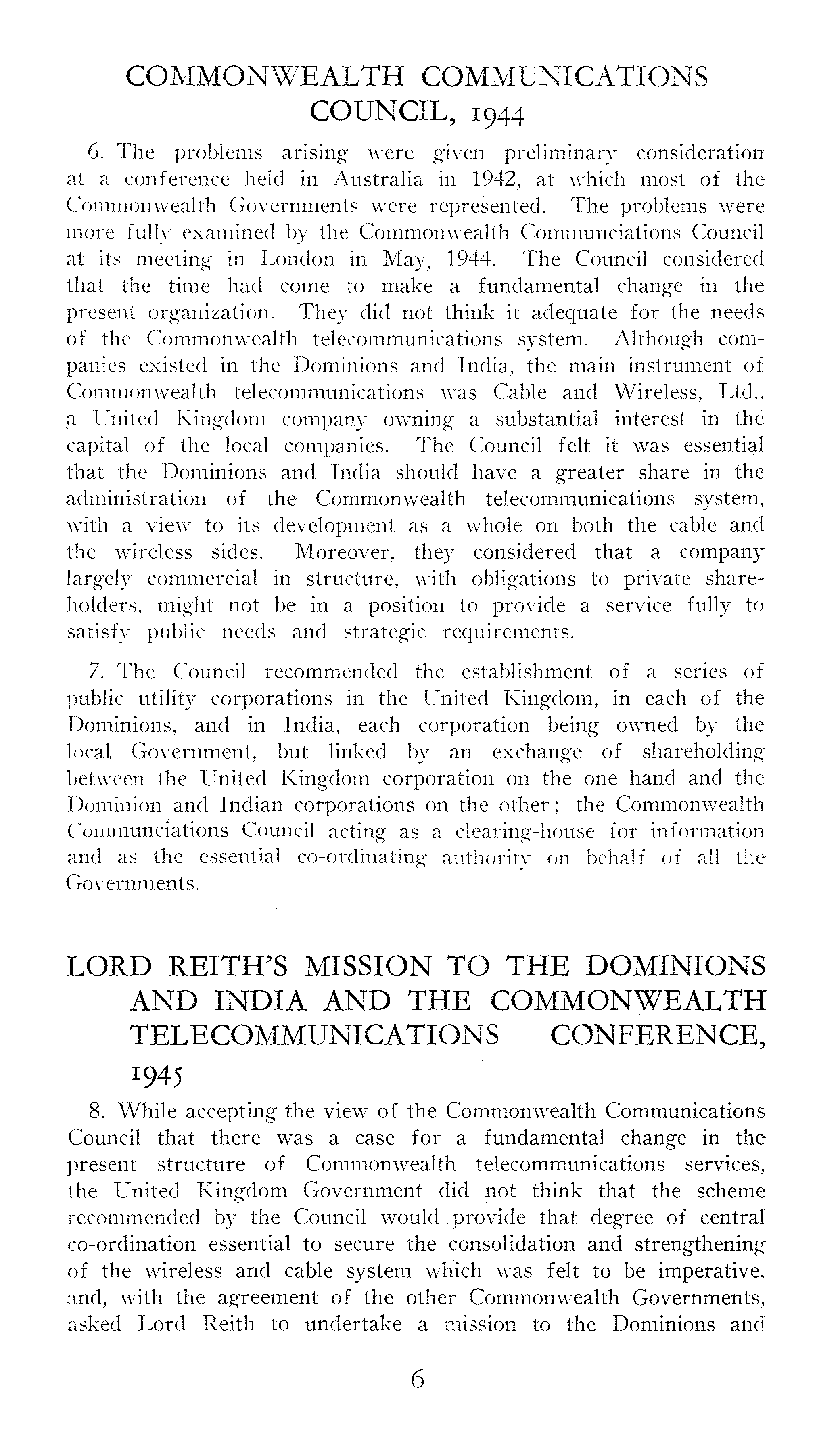 COMMONWEALTH COMMUNICATIONS COUNCIL, 1944 6. The problems arising were given preliminary consideration at a conference held in Australia in 1942, at which most of the Commonwealth Governments were represented. The problems were more fully examined by the Commonwealth Communciations Council at its meeting in London in May, 1944. The Council considered that the time had come to make a fundamental change in the present organization. They did not think it adequate for the needs of the Commonwealth telecommunications system. Although companies existed in the Dominions and India, the main instrument of Commonwealth telecommunications was Cable and Wireless, Ltd., a United Kingdom company owning a substantial interest in the capital of the local companies. The Council felt it was essential that the Dominions and India should have a greater share in the administration of the Commonwealth telecommunications system, with a view to its development as a whole on both the cable and the wireless sides. Moreover, they considered that a company largely commercial in structure, with obligations to private shareholders, might not be in a position to provide a service fully to satisfy public needs and strategic requirements. 7. The Council recommended the establishment of a series of public utility corporations in the United Kingdom, in each of the Dominions, and in India, each corporation being owned by the local Government, but linked by an exchange of shareholding between the United Kingdom corporation on the one hand and the Dominion and Indian corporations on the other; the Commonwealth Communciations Council acting as a clearing-house for information and as the essential co-ordinating authority on behalf of all the Governments. LORD REITH'S MISSION TO THE DOMINIONS AND INDIA AND THE COMMONWEALTH TELECOMMUNICATIONS CONFERENCE, i 945 8. While accepting the view of the Commonwealth Communications Council that there was a case for a fundamental change in the present structure of Commonwealth telecommunications services,, the United Kingdom Government did not think that the scheme recommended by the Council would provide that degree of central co-ordination essential to secure the consolidation and strengthening of the wireless and cable system which was felt to be imperative, and, with the agreement of the other Commonwealth Governments, asked Lord Reith to undertake a mission to the Dominions and