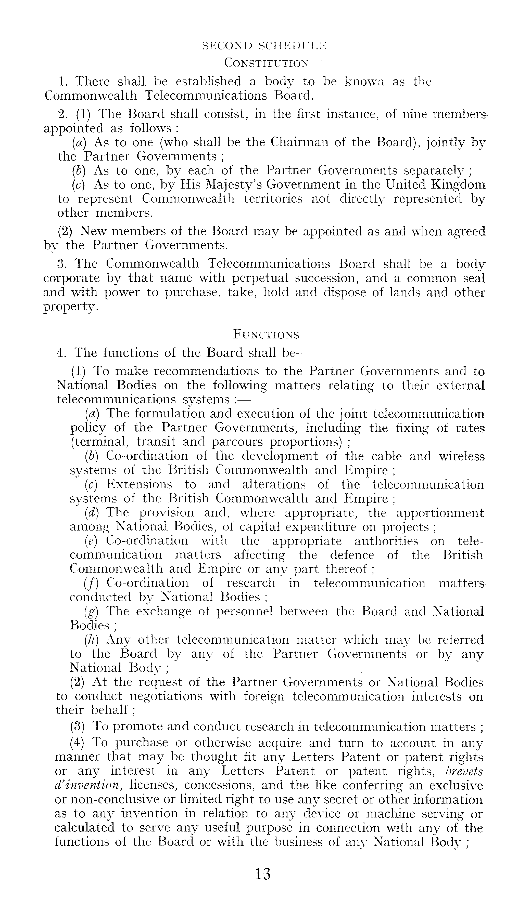 SECOND SCHEDULE Constitution 1. There shall be established a body to be known as the Commonwealth Telecommunications Board. 2. (1) The Board shall consist, in the first instance, of nine membersappointed as follows : (a) As to one (who shall be the Chairman of the Board), jointly by the Partner Governments ; (b) As to one, by each of the Partner Governments separately ; (c) As to one, by His Majesty's Government in the United Kingdom to represent Commonwealth territories not directly represented by other members. (2) New members of the Board may be appointed as and when agreed by the Partner Governments. 3. The Commonwealth Telecommunications Board shall be a body corporate by that name with perpetual succession, and a common seal and with power to purchase, take, hold and dispose of lands and other property. Functions 4. The functions of the Board shall be—(1) To make recommendations to the Partner Governments and to National Bodies on the following matters relating to their external telecommunications systems : (a) The formulation and execution of the joint telecommunication policy of the Partner Governments, including the fixing of rates(terminal, transit and parcours proportions) ; (b) Co-ordination of the development of the cable and wirelesssystems of the British Commonwealth and Empire ; (c) Extensions to and alterations of the telecommunication systems of the British Commonwealth and Empire ; (id) The provision and, where appropriate, the apportionment among National Bodies, of capital expenditure on projects ; (e) Co-ordination with the appropriate authorities on telecommunication matters affecting the defence of the British Commonwealth and Empire or any part thereof; (/) Co-ordination of research in telecommunication matters conducted by National Bodies ; (,g) The exchange of personnel between the Board and National Bodies ; (h) Any other telecommunication matter which may be referred to the Board by any of the Partner Governments or by any National Body ; (2) At the request of the Partner Governments or National Bodies to conduct negotiations with foreign telecommunication interests on their behalf ; (3) To promote and conduct research in telecommunication matters (4) To purchase or otherwise acquire and turn to account in any manner that may be thought fit any Letters Patent or patent rights or any interest in any Letters Patent or patent rights, brevets d'invention, licenses, concessions, and the like conferring an exclusive or non-conclusive or limited right to use any secret or other information as to any invention in relation to any device or machine serving or calculated to serve any useful purpose in connection with any of the functions of the Board or with the business of any National Body ;