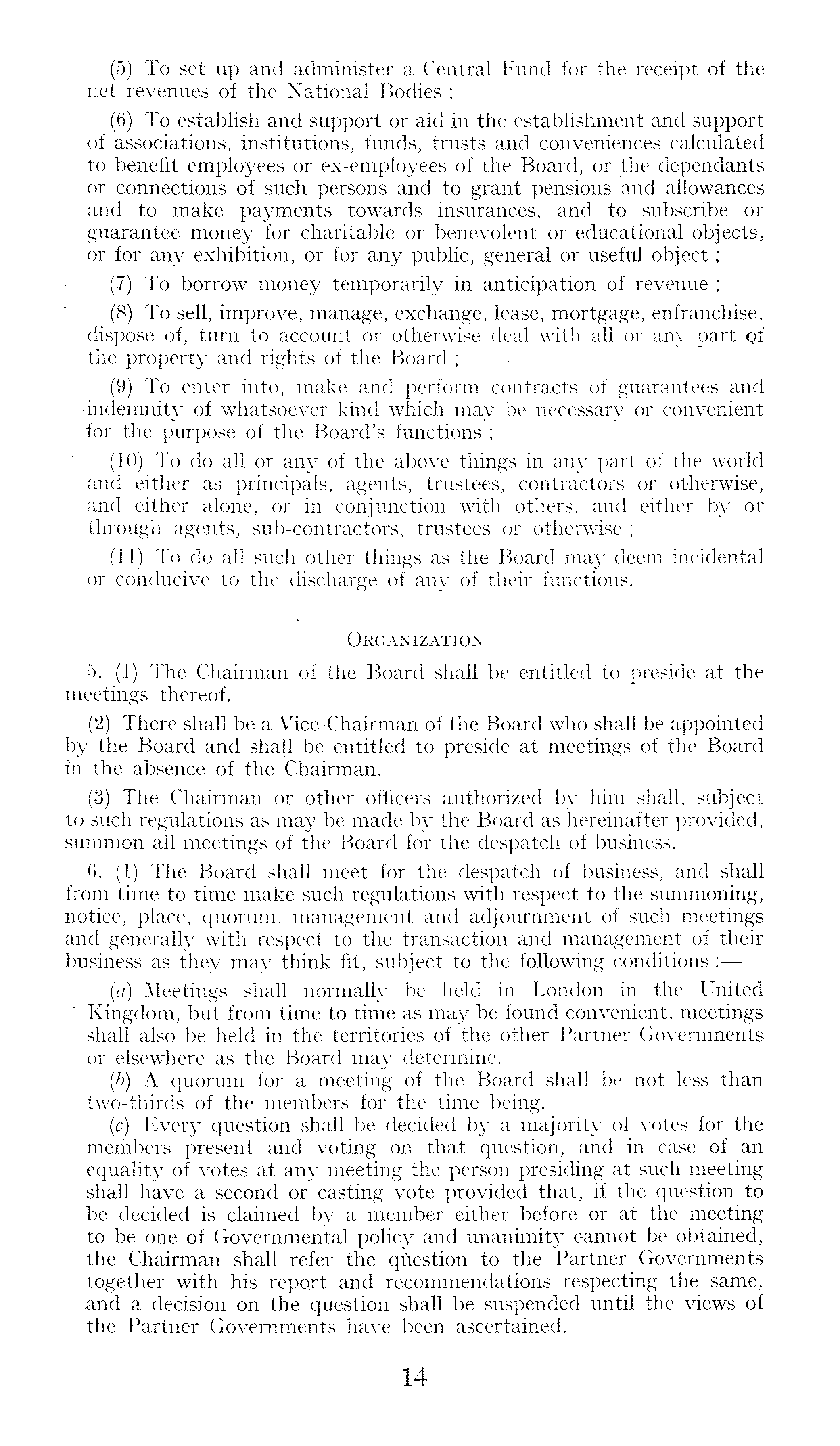 (5) To set up and administer a Central Fund for the receipt of the net revenues of the National Bodies ; (6) To establish and support or aid in the establishment and support •of associations, institutions, funds, trusts and conveniences calculated to benefit employees or ex-employees of the Board, or the dependants or connections of such persons and to grant pensions and allowances and to make payments towards insurances, and to subscribe or guarantee money for charitable or benevolent or educational objects, or for any exhibition, or for any public, general or useful object; (7) To borrow money temporarily in anticipation of revenue ; (8) To sell, improve, manage, exchange, lease, mortgage, enfranchise, dispose of, turn to account or otherwise deal with all or any part <jf the property and rights of the Board ; (9) To enter into, make and perform contracts of guarantees and •indemnity of whatsoever kind which may be necessary or convenient : for the purpose of the Board's functions ; (10) To do all or any of the above things in any part of the world and either as principals, agents, trustees, contractors or otherwise, and either alone, or in conjunction with others, and either by or through agents, sub-contractors, trustees or otherwise ; (11) To do all such other things as the Board may deem incidental or conducive to the discharge of any of their functions. Organization 5. (1) The Chairman of the Board shall be entitled to preside at the meetings thereof. (2) There shall be a Vice-Chairman of the Board who shall be appointed by the Board and shall be entitled to preside at meetings of the Board in the absence of the Chairman. (3) The Chairman or other officers authorized by him shall, subject to such regulations as may be made by the Board as hereinafter provided, summon all meetings of the Board for the despatch of business. 6. (1) The Board shall meet for the despatch of business, and shall from time to time make such regulations with respect to the summoning, notice, place, quorum, management and adjournment of such meetings and generally with respect to the transaction and management of their business as they may think fit, subject to the following conditions : (a) Meetings, shall normally be held in London in the United Kingdom, but from time to time as may be found convenient, meetings shall also be held in the territories of the other Partner Governments or elsewhere as the Board may determine. (b) A quorum for a meeting of the Board shall be not less than two-thirds of the members for the time being. (c) Every question shall be decided by a majority of votes for the members present and voting on that question, and in case of an equality of votes at any meeting the person presiding at such meeting shall have a second or casting vote provided that, if the question to be decided is claimed by. a member either before or at the meeting to be one of Governmental policy and unanimity c-annot be obtained, the Chairman shall refer the question to the Partner Governments together with his report and recommendations respecting the same, and a decision on the question shall be suspended until the views of the Partner Governments have been ascertained.
