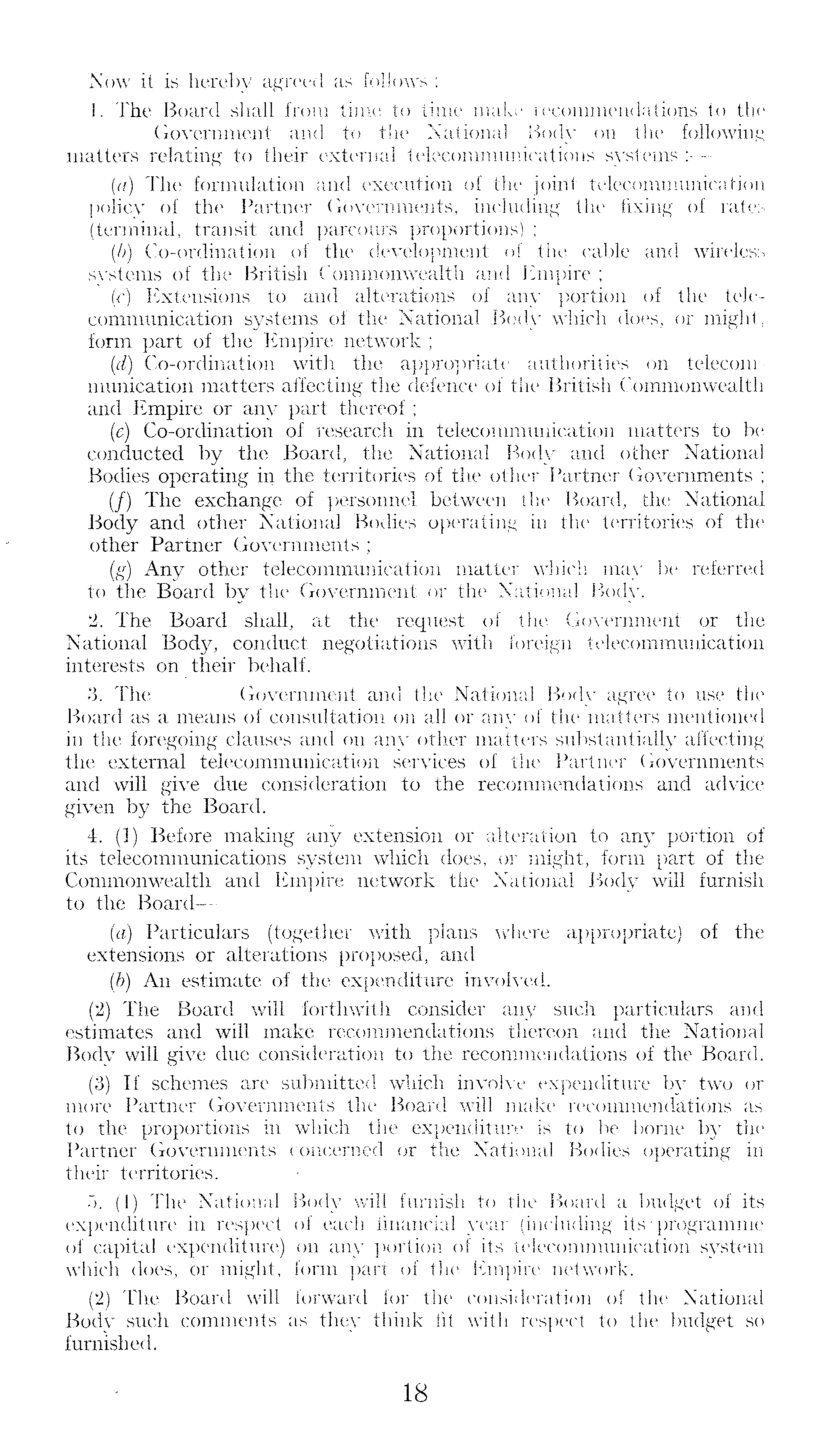 Now it is hereby agreed as follows : 1. The Board shall from time to time make recommendations to the Government and to the National Body on the following matters relating to their external telecommunications systems {a) The formulation and execution of the joint telecommunication policy of the Partner Governments, including the fixing of rates (terminal, transit and parcours proportions) ; (b) Co-ordination of the development of the cable and wireless systems of the British Commonwealth and Empire ; (c) Extensions to and alterations of any portion of the telecommunication systems of the National Body which does, or might, form part of the Empire network ; (,d) Co-ordination with the appropriate authorities on telecommunication matters affecting the defence of the British Commonwealth and Empire or any part thereof ; (e) Co-ordination of research in telecommunication matters to be conducted by the Board, the National Body and other National Bodies operating in the territories of the other Partner Governments ; (/) The exchange of personnel between the Board, the National Body and other National Bodies operating in the territories of the other Partner Governments ; (g) Any other telecommunication matter which may be referred to the Board by the Government or the National Body. 2. The Board shall, at the request of the Government or the National Body, conduct negotiations with foreign telecommunication interests on their behalf. 3. The Government and the National Body agree to use the Board as a means of consultation on all or any of the matters mentioned in the foregoing clauses and on any other matters substantially affecting the external telecommunication services of the Partner Governments and will give due consideration to the recommendations and advice given by the Board. 4. (1) Before making any extension or alteration to any portion of its telecommunications system which does, or might, form part of the Commonwealth and Empire network the National Body will furnish to the Board — (a) Particulars (together with plans where appropriate) of the extensions or alterations proposed, and (b) An estimate of the expenditure involved. (2) The Board will forthwith consider any such particulars and estimates and will make recommendations thereon and the National Body will give due consideration to the recommendations of the Board. (3) If schemes are submitted which involve expenditure by two or more Partner Governments the Board will make recommendations as to the proportions in which the expenditure is to be borne by the Partner Governments concerned or the National Bodies operating in their territories. 5. (1) The National Body will furnish to the Board a budget of its expenditure in respect of each financial year (including its-programme of capital expenditure) on any portion of its telecommunication system which does, or might, form part of the Empire network. (2) The Board will forward for the consideration of the National Body such comments as they think fit with respect to the budget so furnished.