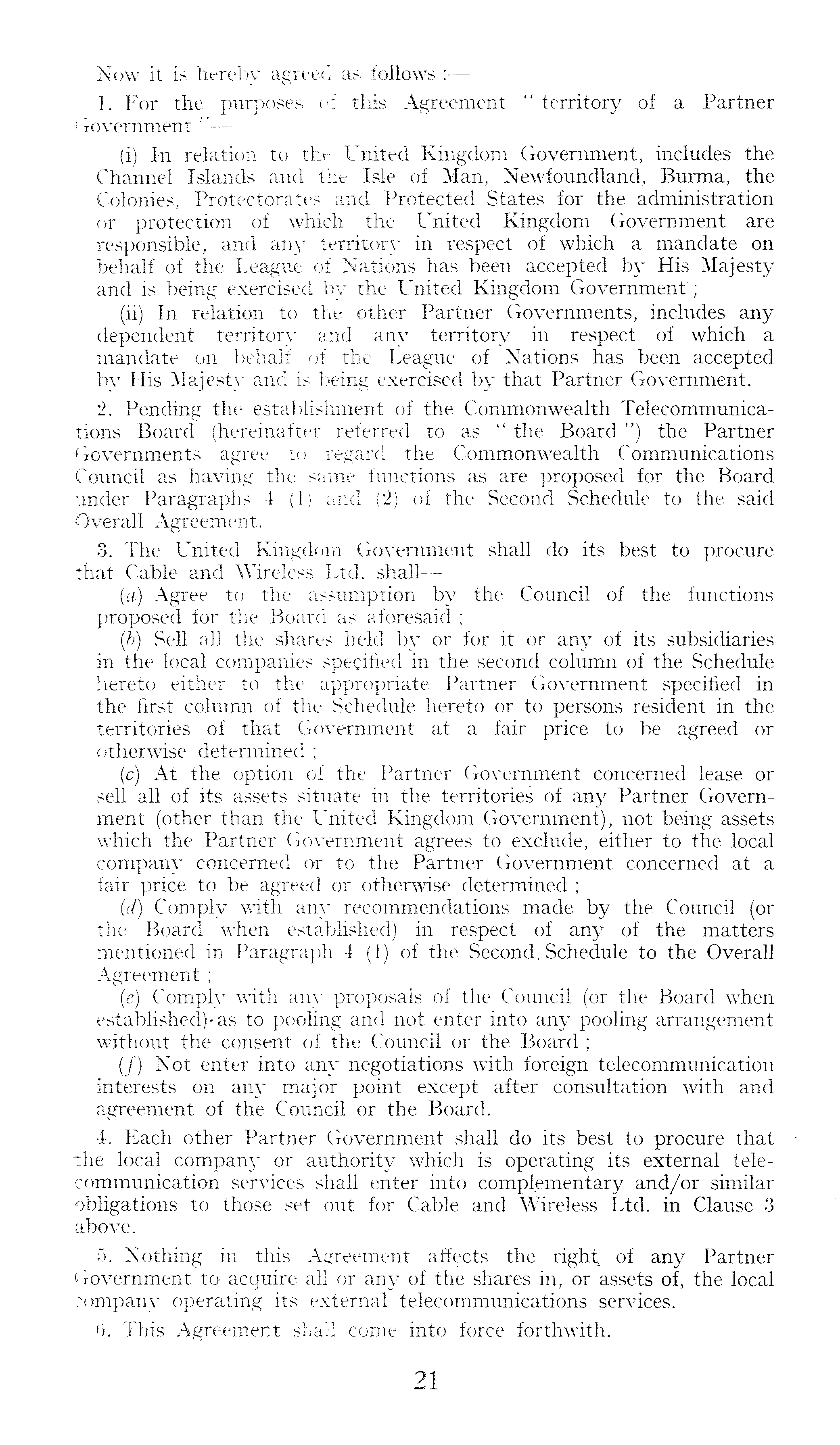 Now it is hereby agreed as follows : 1. For the purposes of this Agreement "territory of a Partner Government " (i) In relation to the United Kingdom Government, includes the Channel Islands and the Isle of Man, Newfoundland, Burma, the Colonies, Protectorates and Protected States for the administration or protection of which the United Kingdom Government are responsible, and any territory in respect of which a mandate on behalf of the League of Nations has been accepted by His Majesty and is being exercised by the United Kingdom Government ; (ii) In relation to the other Partner Governments, includes any dependent territory and any territory in respect of which a mandate on behalf of the League of Nations has been accepted by His Majesty and is being exercised by that Partner Government. 2. Pending the establishment of the Commonwealth Telecommunications Board (hereinafter referred to as " the Board") the Partner Governments agree to regard the Commonwealth Communications Council as having the same functions as are proposed for the Board under Paragraphs 4 (1) and (2) of the Second Schedule to the said Overall Agreement. 3. The United Kingdom Government shall do its best to procure that Cable and Wireless Ltd. shall — (a) Agree to the assumption by the Council of the functions proposed for the Board as aforesaid ; (b) Sell all the shares held by or for it or any of its subsidiaries in the local companies specified in the second column of the Schedule hereto either to the appropriate Partner Government specified in the first column of the Schedule hereto or to persons resident in the territories of that Government at a fair price to be agreed or otherwise determined.; (c) At the option of the Partner Government concerned lease or sell all of its assets situate in the territories of any Partner Government (other than the United Kingdom Government), not being assets which the Partner Government agrees to exclude, either to the local company concerned or to the Partner Government concerned at a fair price to be agreed or otherwise determined ; (d) Comply with any recommendations made by the Council (or the Board when established) in respect of any of the matters mentioned in Paragraph 4 (1) of the Second. Schedule to the Overall Agreement ; (.e) Comply with any proposals of the Council (or the Board when established)* as to pooling and not enter into any pooling arrangement without the consent of the Council or the Board ; (/) Not enter into any negotiations with foreign telecommunication interests on any major point except after consultation with and agreement of the Council or the Board. 4. Each other Partner Government shall do its best to procure that the local company or authority which is operating its external telecommunication services shall enter into complementary and/or similar obligations to those set out for Cable and Wireless Ltd. in Clause 3 above. 5. Nothing in this Agreement affects the right of any Partner Government to acquire all or any of the shares in, or assets of, the local company operating its external telecommunications services. 6. This Agreement shall come into force forthwith.