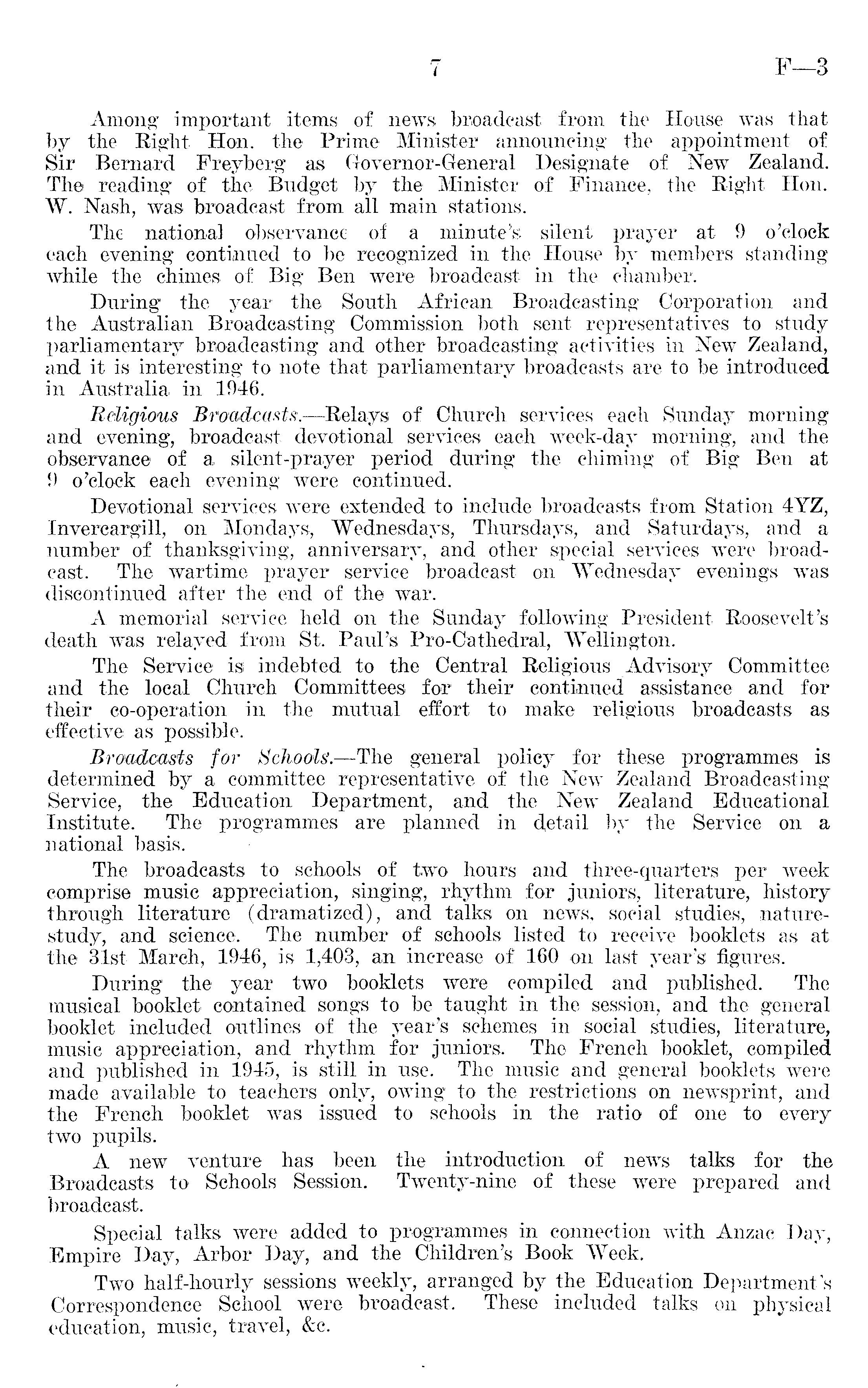 Among important items of news broadcast from the House was that by the Right Hon. the Prime Minister announcing- the appointment of Sir Bernard Freyberg as Governor-General Designate of New Zealand. The reading of the Budget by the Minister of Finance, the Right Hon. W. Nash, was broadcast from all main stations. The national observance of a minute's silent prayer at 9 o'clock each evening continued to be recognized in the House by members standing while the chimes of Big Ben were broadcast in the chamber. During the year the South African Broadcasting Corporation and the Australian Broadcasting Commission both sent representatives to study parliamentary broadcasting and other broadcasting activities in New Zealand, and it is interesting to note that parliamentary broadcasts are to be introduced in Australia in 1946. Religious Broadcasts. —Relays of Church services each Sunday morning and evening, broadcast devotional services each week-day morning, and the observance of a silent-prayer period during the chiming of Big Ben at 9 o'clock each evening were continued. Devotional services were extended to include broadcasts from Station 4YZ, Invereargill, on Mondays, Wednesdays, Thursdays, and Saturdays, and a number of thanksgiving, anniversary, and other special services were broadcast. The wartime prayer service broadcast on "Wednesday evenings was discontinued after the end of the war. A memorial service held on the Sunday following President Roosevelt's death was relayed from St. Paul's Pro-Cathedral, Wellington. The Service is indebted to the Central Religious Advisory Committee and the local Church Committees for their continued assistance and for their co-operation in the mutual effort to make religious broadcasts as effective as possible. Broadcasts for Schools'. —The general policy for these programmes is determined by a committee representative of the New Zealand Broadcasting Service, the Education Department, and the New Zealand Educational Institute. The programmes are planned in d,etail by the Service on a national basis. The broadcasts to schools of two hours and three-quarters per week comprise music appreciation, singing, rhythm for juniors, literature, history through literature (dramatized), and talks on news, social studies, naturestudy, and science. The number of schools listed to receive booklets as at the 31st March, 1946, is 1,403, an increase of 160 on last year's figures. During the year two booklets were compiled and published. The musical booklet contained songs to be taught in the session, and the general booklet included outlines of the year's schemes in social studies, literature, music appreciation, and rhythm for juniors. The French booklet, compiled and published in 1945, is still in use. The music and general booklets were made available to teachers only, owing to the restrictions on newsprint, and the French booklet was issued to schools in the ratio of one to every two pupils, A new venture has been the introduction of news talks for the Broadcasts to Schools Session. Twenty-nine of these were prepared and broadcast. Special talks were 'added to programmes in connection with Anzac Day, Empire Day, Arbor Day, and the Children's Book Week. Two half-hourly sessions weekly, arranged by the Education Department's Correspondence School were broadcast. These included talks on physical education, music, travel, &c.
