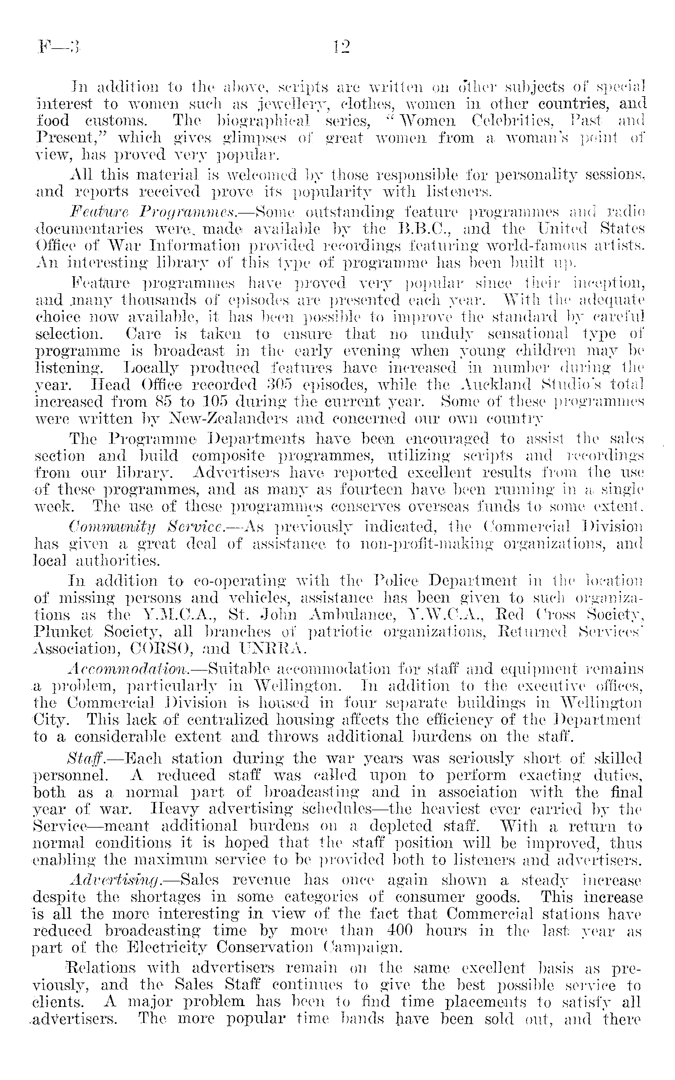 In addition to the above, scripts are written on other subjects of special interest to women such as jewellery, clothes, women in other countries, and food customs. The biographical series, " Women Celebrities, Past and Present," which gives glimpses of great women from a woman's point of yiew, has proved very popular. All this material is welcomed by those responsible for personality sessions, and reports received prove its popularity with listeners. Feature Programmes.—Some outstanding feature programmes and radio •documentaries were, made available by the 8.8.C., and the United States •Office of War Information provided recordings featuring world-famous artists. An interesting library of this type of programme has been built up. Feature programmes have proved very popular since their inception, and .many thousands of episodes are presented each year. With the adequate ■choice now available, it has been possible to improve the standard by careful selection. Care is taken to ensure that no unduly sensational type of programme is broadcast in the early evening when young children may be listening. Locally produced features have increased in number during the year. Head Office recorded 305 episodes, while the Auckland Studio's total Increased from 85 to 105 during the current year. Some of these programmes were written by New-Zealanders and concerned our own country The Programme Departments have been encouraged to assist the sales section and build composite programmes, utilizing scripts and recordings from our library. Advertisers have reported excellent results from the use ■of these programmes, and as many as fourteen have been running in a single week. The use of these programmes conserves overseas funds to some extent. Community Service.—As previously indicated,' the Commercial Division has given a great deal of assistance to non-profit-making organizations, and local authorities. In addition to co-operating with the Police Department in the location •of missing persons and vehicles, assistance has been given to such organizations as the Y.M.C.A., St. John Ambulance, Y.W.C.A., Red Cross Society, Plunket Society, all branches of patriotic organizations, Returned Services' Association, CORSO, and UNRRA. Accommodation.. —Suitable accommodation for staff and equipment remains ■a problem, particularly in Wellington. In addition to the executive offices, the Commercial Division is housed in four separate buildings in Wellington 'City. This lack of centralized housing affects the efficiency of the Department to a considerable extent and throws additional burdens on the staff. Staff. —Each station during the war years was seriously short of skilled personnel. A reduced staff was called upon to perform exacting duties, both as a normal part of broadcasting and in association with the final year of war. Heavy advertising schedules—the heaviest ever carried by the Service —meant Additional burdens on a depleted staff. With a return to normal conditions it is hoped that the staff position will be improved, thus enabling the maximum service to be provided both to listeners and advertisers. Advertising.—Sales revenue has once again shown a steady increase ■despite the shortages in some categories of consumer goods. This increase is all the more interesting in view of the fact that Commercial stations have reduced broadcasting time by more than 400 hours in the last year as part of the Electricity Conservation Campaign. Relations with advertisers remain on the same excellent basis as previously, and the Sales Staff continues to give the best possible service to clients. A major problem has been to find time placements to satisfy all .advertisers. The more popular time bands have been sold out, and there
