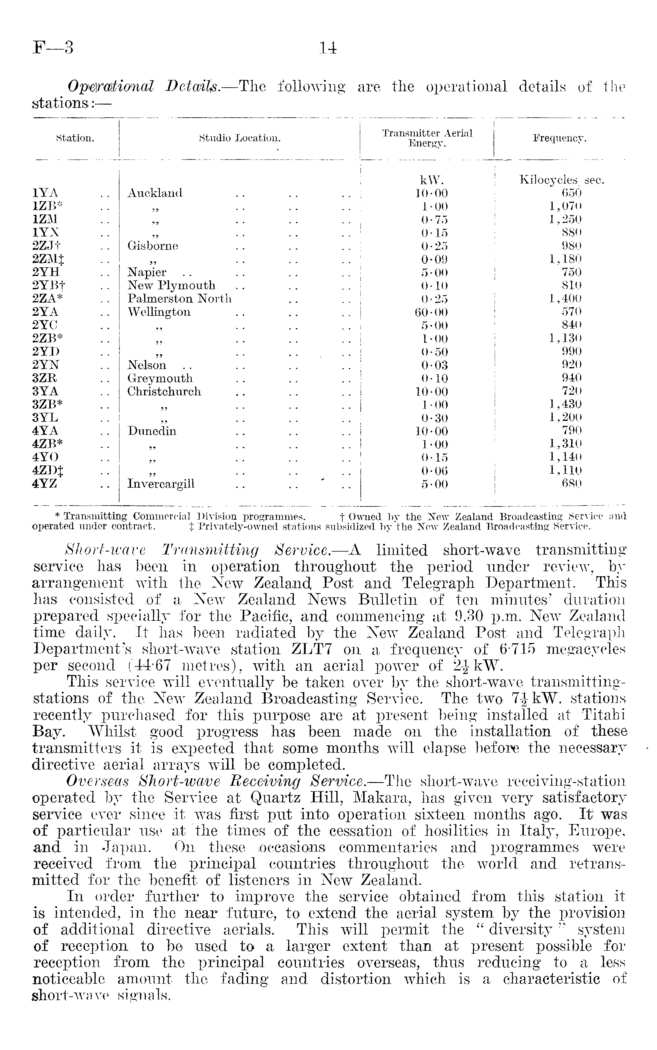 Short-wave Transmitting Service.—A limited short-wave transmitting service has been in operation throughout the period under review, by arrangement with the New Zealand, Post and Telegraph Department. This has consisted of a New Zealand News Bulletin of ten minutes' duration prepared specially for the Pacific, and commencing at 9.30 p.m. New Zealand time daily. It has been radiated by the New Zealand Post and Telegraph Department's short-wave station ZLT7 on a frequency of 6715 megacycles per second (4467 metres), with an aerial power of 2^kW. This service will eventually be taken over by the short-wave transmittingstations of the New Zealand Broadcasting Service. The two 7-JkW. stations recently purchased for this purpose are at present being installed at Titahi Bay. Whilst good progress has been made on the installation of these transmitters it is expected that some months will elapse before the necessary directive aerial arrays will be completed. Overseas Short-wave Receiving Service.—The short-wave receiving-station operated by the Service at Quartz Hill, Makara, has given very satisfactory service ever since it was first put into operation sixteen months ago. It was of particular use at the times of the cessation of hosilities in Italy, Europe, and in Japan. On these occasions commentaries and programmes were received from the principal countries throughout the world and retransmitted for the benefit of listeners in New Zealand. In order further to improve the service obtained from this station it is intended, in the near future, to extend the aerial system by the provision of additional directive aerials. This will permit the " diversity" system of reception to be used to a larger extent than at present possible for reception from the principal countries overseas, thus reducing to a less noticeable amount the fading and distortion which is a characteristic of short-wave signals.
