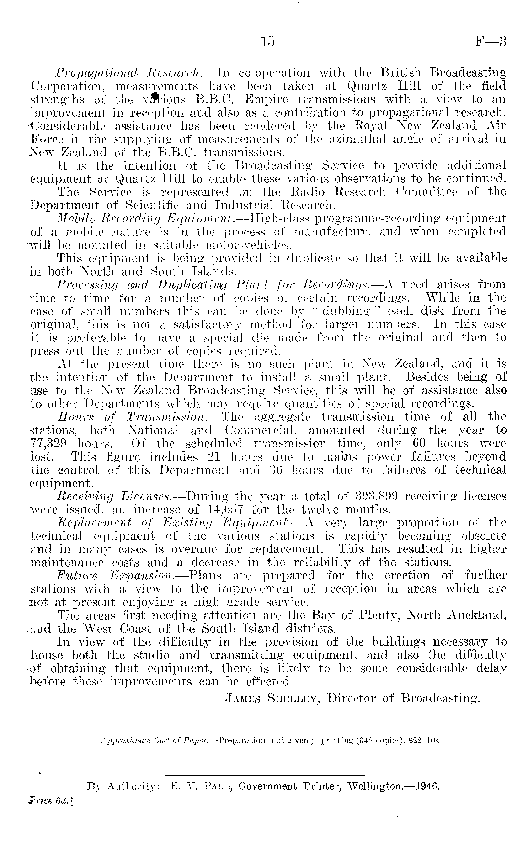 Prapagational Research. —In co-operation with the British Broadcasting 'Corporation, measurements have been taken at Quartz Hill of the field strengths of the vllbious 8.8.C. Empire transmissions with a view to an improvement in reception and also as a contribution to propagational research. Considerable assistance has been rendered by the Royal New Zealand Air Force in the supplying of measurements of the azimuthal angle of arrival in New Zealand of the 8.8.C. transmissions, It is the intention of the Broadcasting Service to provide additional •equipment at Quartz Hill to enable these various observations to be continued. The Service is represented on the Radio Research Committee of the Department of Scientific and Industrial Research. Mobile* Recording Equipment.—High-class programme-recording equipment of a mobile nature is in the process of manufacture, and when completed will be mounted in suitable mot or-vehicles. This equipment is being provided in duplicate so that it will be available in both North and South Islands. Processing and Duplicating Plaint for Recordings.—A need arises from time to time for a number of copies of certain recordings. While in the •case of small numbers this can be done by " dubbing " each disk from the •original, this is not a satisfactory method for larger numbers. In this case it is preferable to have a special die made from the original and then to press out the number of copies required. At the present time there is no such plant in New Zealand, and it is the intention of the Department to install a small plant. Besides being of use to the New Zealand Broadcasting Service, this will be of assistance also to other Departments which may require quantities of special recordings. Hours of Transmission.—The aggregate transmission time of all the : stations, both National and Commercial, amounted during the year to 77,329 hours. Of the scheduled transmission time, only 60 hours were lost. This figure includes 21 hours due to mains power failures beyond the control of this Department and 36 hours due to failures of technical •equipment. Receiving Licenses.—During the year a total of 393,899 receiving licenses were issued, an increase of 14,657 for the twelve months. Replacement of Existing Equipment.—A very large proportion of the technical equipment of the various stations is rapidly becoming obsolete and in many cases is overdue for replacement. This has resulted in higher maintenance costs and a decrease in the reliability of the stations. Future Expansion.—Plans are prepared for the erection of further stations with .a view to the improvement of reception in areas which are not at present enjoying a high grade service. The areas first needing attention are the Bay of Plenty, North Auckland, and the West Coast of the South Island districts. In view of the difficulty in the provision of the buildings necessary to house both the studio and transmitting equipment, and also the difficulty •of obtaining that equipment, there is likely to be some considerable delay before these improvements can be effected. James Shelley, Director of Broadcasting.