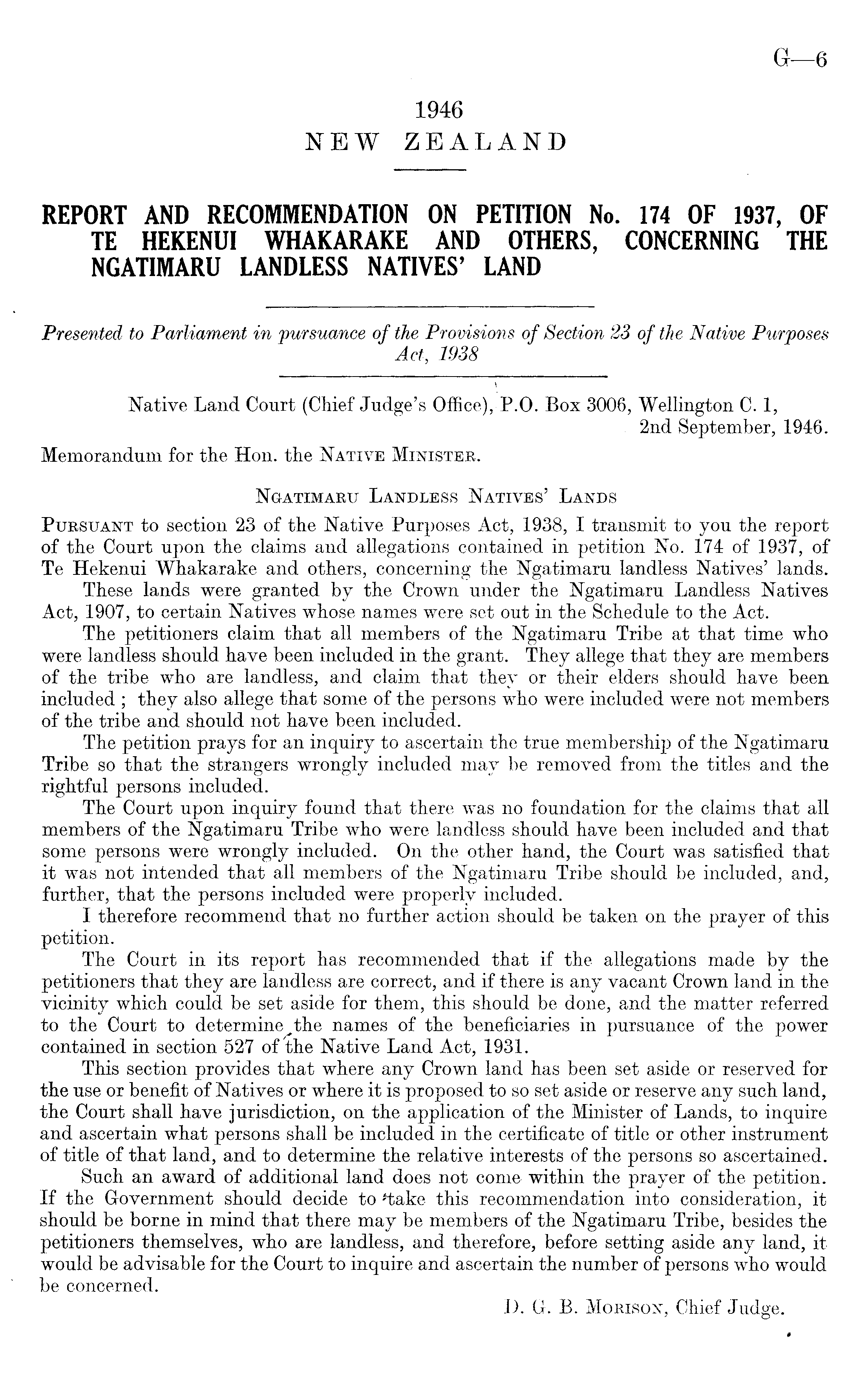 REPORT AND RECOMMENDATION ON PETITION No. 174 OF 1937, OF TE HEKENUI WHAKARAKE AND OTHERS, CONCERNING THE NGATIMARU LANDLESS NATIVES' LAND