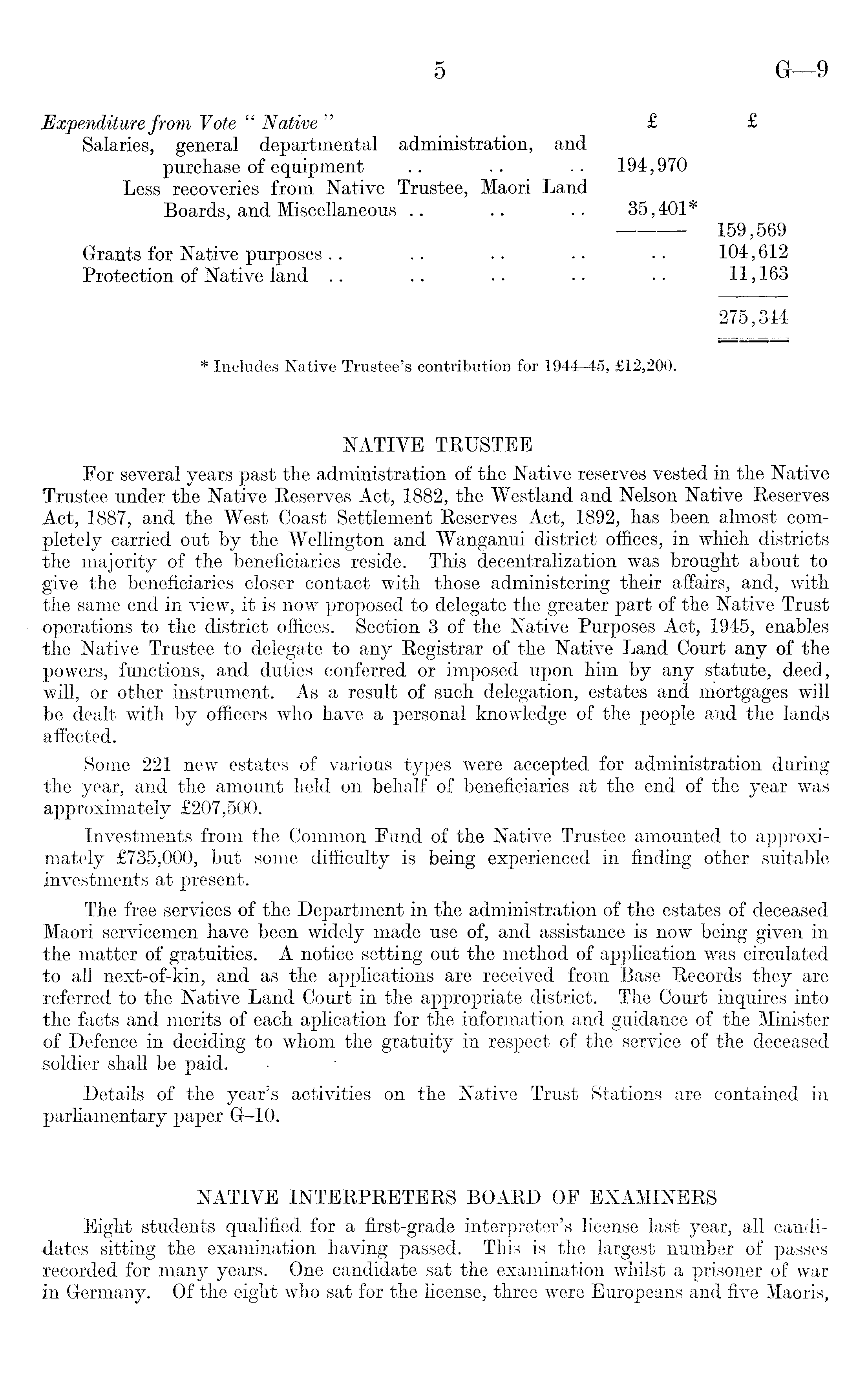 Expenditure from Vote " Native" £ £ Salaries, general departmental administration, and purchase of equipment .. .. .. 194,970 Less recoveries from Native Trustee, Maori Land Boards, and Miscellaneous .. .. .. 35,401* 159,569 Grants for Native purposes.. .. .. .. •• 104,612 Protection of Native land .. .. .. •• •• 11,163 275,344 * Includes Native Trustee's contribution for 1944-45, £12,200. NATIVE TRUSTEE For several years past the administration of the Native reserves vested in the Native Trustee under the Native Reserves Act, 1882, the Westland and Nelson Native Reserves Act, 1887, and the West Coast Settlement Reserves Act, 1892, has been almost completely carried out by the Wellington and Wanganui district offices, in which districts the majority of the beneficiaries reside. This decentralization was brought about to give the beneficiaries closer contact with those administering their affairs, and, with the same end in view, it is now proposed to delegate the greater part of the Native Trust operations to the district offices. Section 3of the Native Purposes Act, 1945, enables the Native Trustee to delegate to any Registrar of the Native Land Court any of the powers, functions, and duties conferred or imposed upon him by any statute, deed, will, or other instrument. As a result of such delegation, estates and mortgages will be dealt with by officers who have a personal knowledge of the people and the lands affected. Some 221 new estates of various types were accepted for administration during the year, and the amount held on behalf of beneficiaries at the end of the year was approximately £207,500. Investments from the Common Fund of the Native Trustee amounted to approximately £735,000, but some difficulty is being experienced in finding other suitable investments at present. The free services of the Department in the administration of the estates of deceased Maori servicemen have been widely made use of, and assistance is now being given in the matter of gratuities. A notice setting out the method of application was circulated to all next-of-kin, and as the applications are received from Base Records they are referred to the Native Land Court in the appropriate district. The Court inquires into the facts and merits of each aplication for the information and guidance of the Minister of Defence in deciding to whom the gratuity in respect of the service of the deceased soldier shall be paid. Details of the year's activities on the Native Trust Stations are contained in parliamentary paper G-10. NATIVE INTERPRETERS BOARD OF EXAMINERS Eight students qualified for a first-grade interpreter's license last year, all candidates sitting the examination having passed. This is the largest number of passes recorded for many years. One candidate sat the examination whilst a prisoner of war in Germany. Of the eight who sat for the license, three were Europeans and five Maoris,