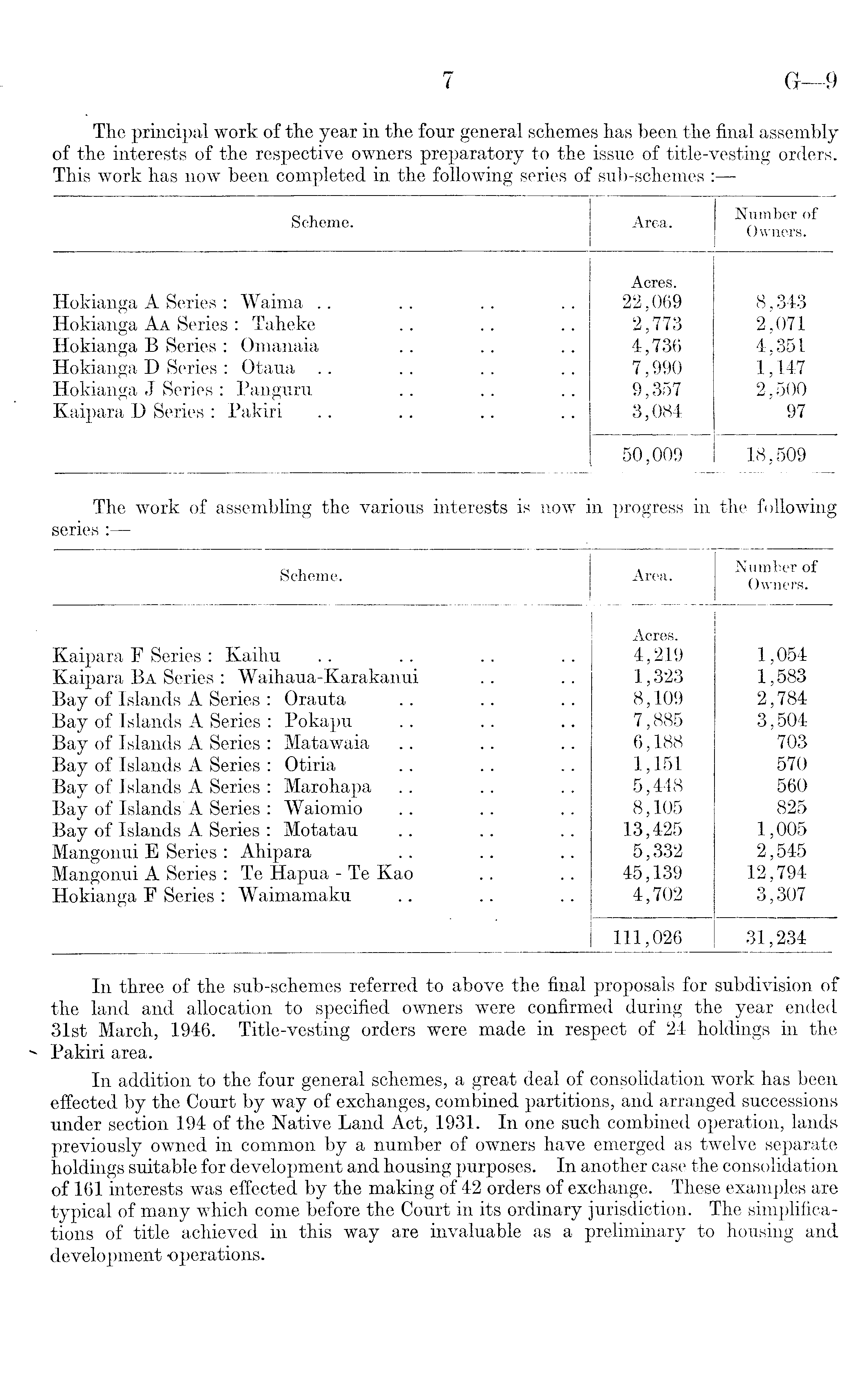 In three of the sub-schemes referred to above the final proposals for subdivision of the land and allocation to specified owners were confirmed during the year ended 31st March, 1946. Title-vesting orders were made in respect of 24 holdings in the Pakiri area. In addition to the four general schemes, a great deal of consolidation work has been effected by the Court by way of exchanges, combined partitions, and arranged successions under section 194 of the Native Land Act, 1931. In one such combined operation, lands previously owned in common by a number of owners have emerged as twelve separate holdings suitable for development and housing purposes. "In another case the consolidation of 161 interests was effected by the making of 42 orders of exchange. These examples are typical of many which come before the Court in its ordinary jurisdiction. The simplifications of title achieved in this way are invaluable as a preliminary to housing and development -operations.