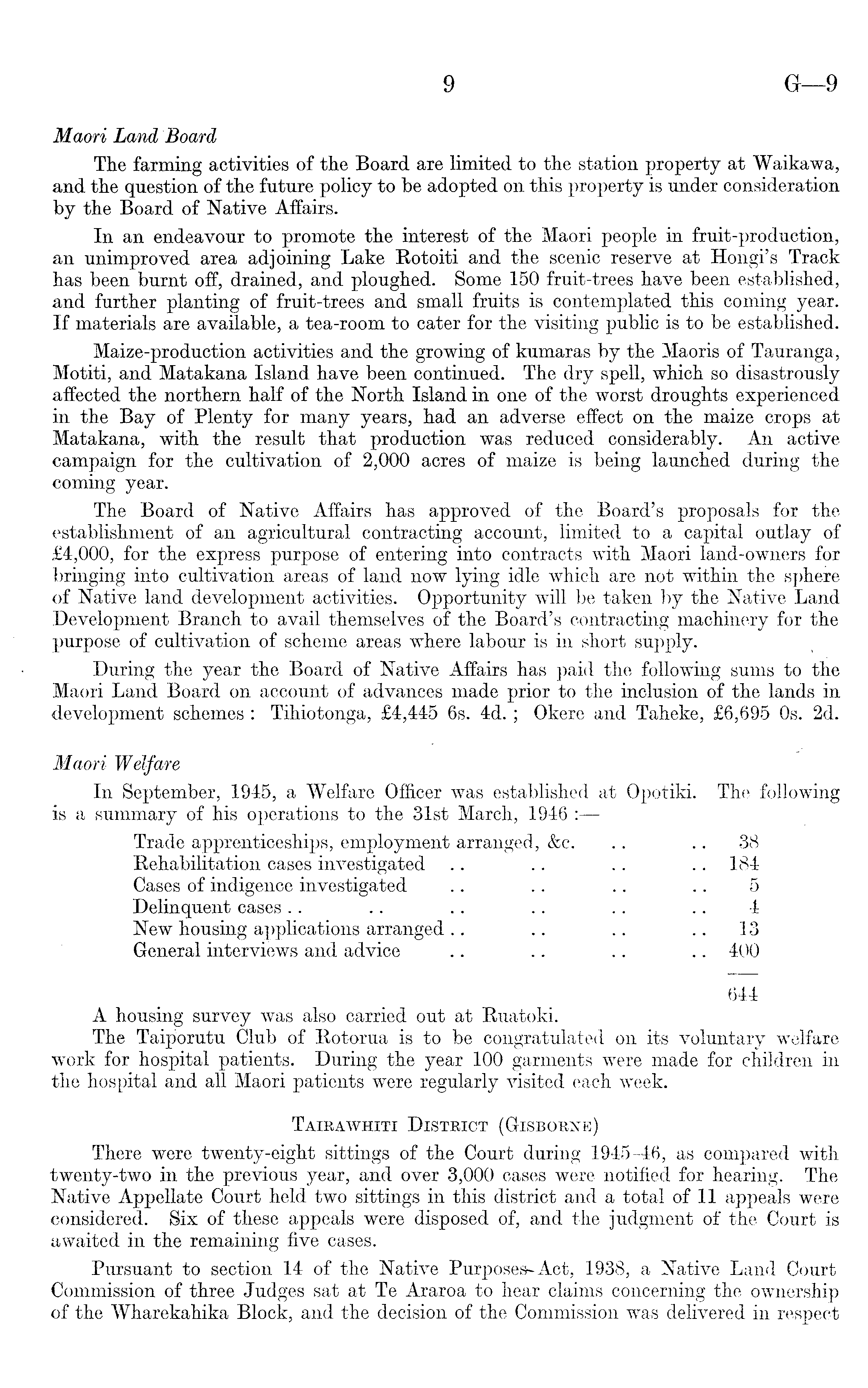 Maori Land Board, The farming activities of the Board are limited to the station property at Waikawa, and the question of the future policy to be adopted on this property is under consideration by the Board of Native Affairs. In an endeavour to promote the interest of the Maori people in fruit-production, an unimproved area adjoining Lake Rotoiti and the scenic reserve at Hongi's Track has been burnt off, drained, and ploughed. Some 150 fruit-trees have been established, and further planting of fruit-trees and small fruits is contemplated this coming year. If materials are available, a tea-room to cater for the visiting public is to be established. Maize-production activities and the growing of kumaras by the Maoris of Tauranga, Motiti, and Matakana Island have been continued. The dry spell, which so disastrously affected the northern half of the North Island in one of the worst droughts experienced in the Bay of Plenty for many years, had an adverse effect on the maize crops at Matakana, with the result that production was reduced considerably. An active campaign for the cultivation of 2,000 acres of maize is being launched during the coming year. The Board of Native Affairs has approved of the Board's proposals for the establishment of an agricultural contracting account, limited to a capital outlay of £4,000, for the express purpose of entering into contracts with Maori land-owners for bringing into cultivation areas of land now lying idle which are not within the sphere of Native land development activities. Opportunity will be taken by the Native Land Development Branch to avail themselves of the Board's contracting machinery for the purpose of cultivation of scheme areas where labour is in short supply. During the year the Board of Native Affairs has paid the following sums to the Maori Land Board on account of advances made prior to the inclusion of the lands in development schemes : Tihiotonga, £4,445 6s. 4d. ; Okere and Taheke, £6,695 os. 2d. Maori Welfare In September, 1945, a Welfare Officer was established at Opotiki. The following is a summary of his operations to the 31st March, 1946 : Trade apprenticeships, employment arranged, &c. .. .. 38 Rehabilitation cases investigated .. .. .. .. 184 Cases of indigence investigated .. .. .. .. 5 Delinquent cases .. .. .. .. .. .. 4 New housing applications arranged .. .. .. .. 13 General interviews and advice .. .. .. .. 400 644 A housing survey was also carried out at Ruatoki. The Taiporutu Club of Rotorua is to be congratulated on its voluntary welfare work for hospital patients. During the year 100 garments were made for children in the hospital and all Maori patients were regularly visited each week. Tairawhiti District (Gisborne) There were twenty-eight sittings of the Court during 1945-46, as compared with twenty-two in the previous year, and over 3,000 cases were notified for hearing. The Native Appellate Court held two sittings in this district and a total of 11 appeals were considered. Six of these appeals were disposed of, and the judgment of the Court is awaited in the remaining five cases. Pursuant to section 14 of the Native Purposes Act, 1938, a Native Land Court Commission of three Judges sat at Te Araroa to hear claims concerning the ownership of the Wharekahika Block, and the decision of the Commission was delivered in respect