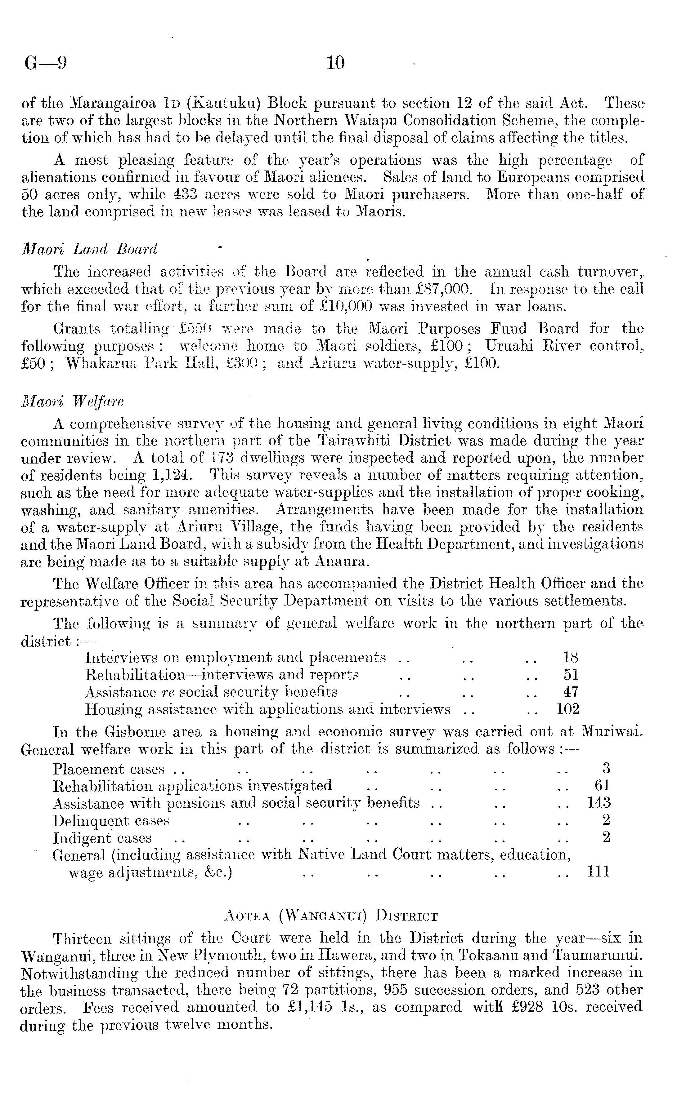 of the Marangairoa Id (Kautuku) Block pursuant to section 12 of the said Act. These are two of the largest blocks in the Northern Waiapu Consolidation Scheme, the completion of which has had to be delayed until the final disposal of claims affecting the titles. A most pleasing feature of the year's operations was the high percentage of alienations confirmed in favour of Maori alienees. Sales of land to Europeans comprised 50 acres only, while 433 acres were sold to Maori purchasers. More than one-half of the land comprised in new leases was leased to Maoris. Maori Land Board The increased activities of the Board are reflected in the annual cash turnover,, which exceeded that of the previous year by more than £87,000. In response to the call for the final war effort, a further sum of £lO,OOO was invested in war loans. Grants totalling £550 were made to the Maori Purposes Fund Board for the following purposes : welcome home to Maori soldiers, £lOO ; Uruahi River control, £5O ; Whakarua Park Hall, £3OO ; and Ariuru water-supply, £lOO. Maori Welfare A comprehensive survey of the housing and general living conditions in eight Maori communities in the northern part of the Tairawhiti District was made during the year under review. A total of 173 dwellings were inspected and reported upon, the number of residents being 1,124. This survey reveals a number of matters requiring attention, such as the need for more adequate water-supplies and the installation of proper cooking, washing, and sanitary amenities. Arrangements have been made for the installation of a water-supply at Ariuru Village, the funds having been provided by the residentsand the Maori Land Board, with a subsidy from the Health Department, and investigations are being made as to a suitable supply at Anaura. The Welfare Officer in this area has accompanied the District Health Officer and the representative of the Social Security Department on visits to the various settlements. The following is a summary of general welfare work in the northern part of the district: — Interviews on employment and placements .. .. .. 18 Rehabilitation —interviews and reports .. .. 51 Assistance re social security benefits .. .. 47 Housing assistance with applications and interviews .. .. 102 In the Gisborne area a housing and economic survey was carried out at Muriwai. General welfare work in this part of the district is summarized as follows : Placement cases .. .. .. .. .. .. .. 3 Rehabilitation applications investigated .. .. .. .. 61 Assistance with pensions and social security benefits .. .. .. 143 Delinquent cases .. .. .. .. .. .. 2 Indigent cases .. . . .. .. .. .. .. 2 General (including assistance with Native Land Court matters, education, wage adjustments, &c.) .. .. .. .. .. 11l i Aotea (Wanganui) District Thirteen sittings of the Court were held in the District during the year —six in Wanganui, three in New Plymouth, two in Hawera, and two in Tokaanu and Taumarunui. Notwithstanding the reduced number of sittings, there has been a marked increase in the business transacted, there being 72 partitions, 955 succession orders, and 523 other orders. Fees received amounted to £1,145 Is., as compared with £928 10s. received during the previous twelve months.