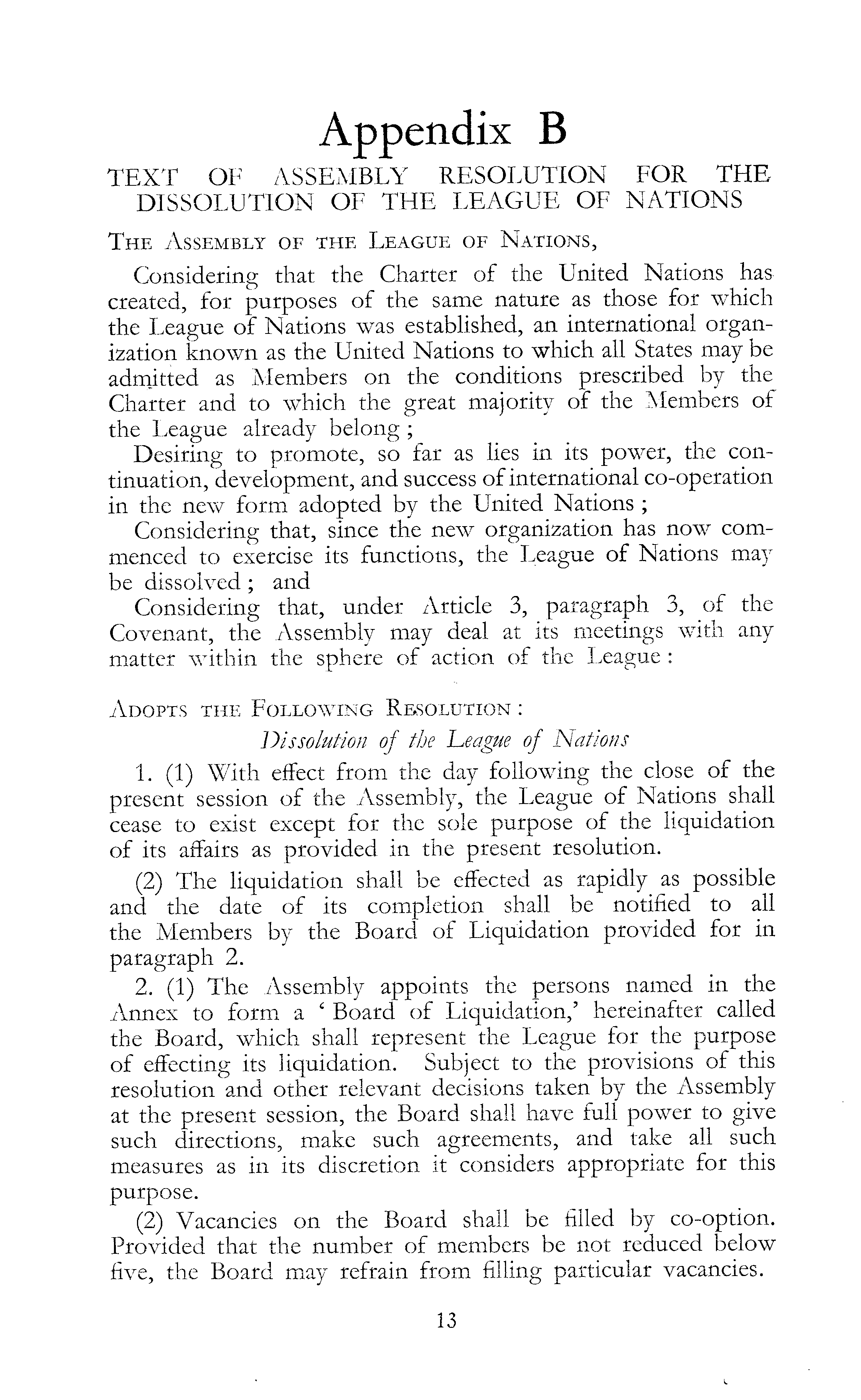 Appendix B TEXT OF ASSEMBLY RESOLUTION FOR THE DISSOLUTION OF THE LEAGUE OF NATIONS The Assembly of the League of Nations, Considering that the Charter of the United Nations has created, for purposes of the same nature as those for which the League of Nations was established, an international organization known as the United Nations to which all States may be admitted as Members on the conditions prescribed by the Charter and to which the great majority of the Members of the League already belong; Desiring to promote, so far as lies in its power, the continuation, development, and success of international co-operation in the new form adopted by the United Nations ; Considering that, since the new organization has now commenced to exercise its functions, the League of Nations may be dissolved; and Considering that, under Article 3, paragraph 3, of the Covenant, the Assembly may deal at its meetings with any matter within the sphere of action of the League : % Adopts the Following Resolution : Dissolution of the League of Nations 1. (1) With effect from the day following the close of the present session of the Assembly, the League of Nations shall cease to exist except for the sole purpose of the liquidation of its affairs as provided in the present resolution. (2) The liquidation shall be effected as rapidly as possible and the date of its completion shall be notified to all the Members by the Board of Liquidation provided for in paragraph 2. 2. (1) The Assembly appoints the persons named in the Annex to form a £ Board of Liquidation,' hereinafter called the Board, which shall represent the League for the purpose of effecting its liquidation. Subject to the provisions of this resolution and other relevant decisions taken by the Assembly at the present session, the Board shall have full power to give such directions, make such agreements, and take all such measures as in its discretion it considers appropriate for this purpose. (2) Vacancies on the Board shall be filled by co-option. Provided that the number of members be not reduced below five, the Board may refrain from filling particular vacancies.