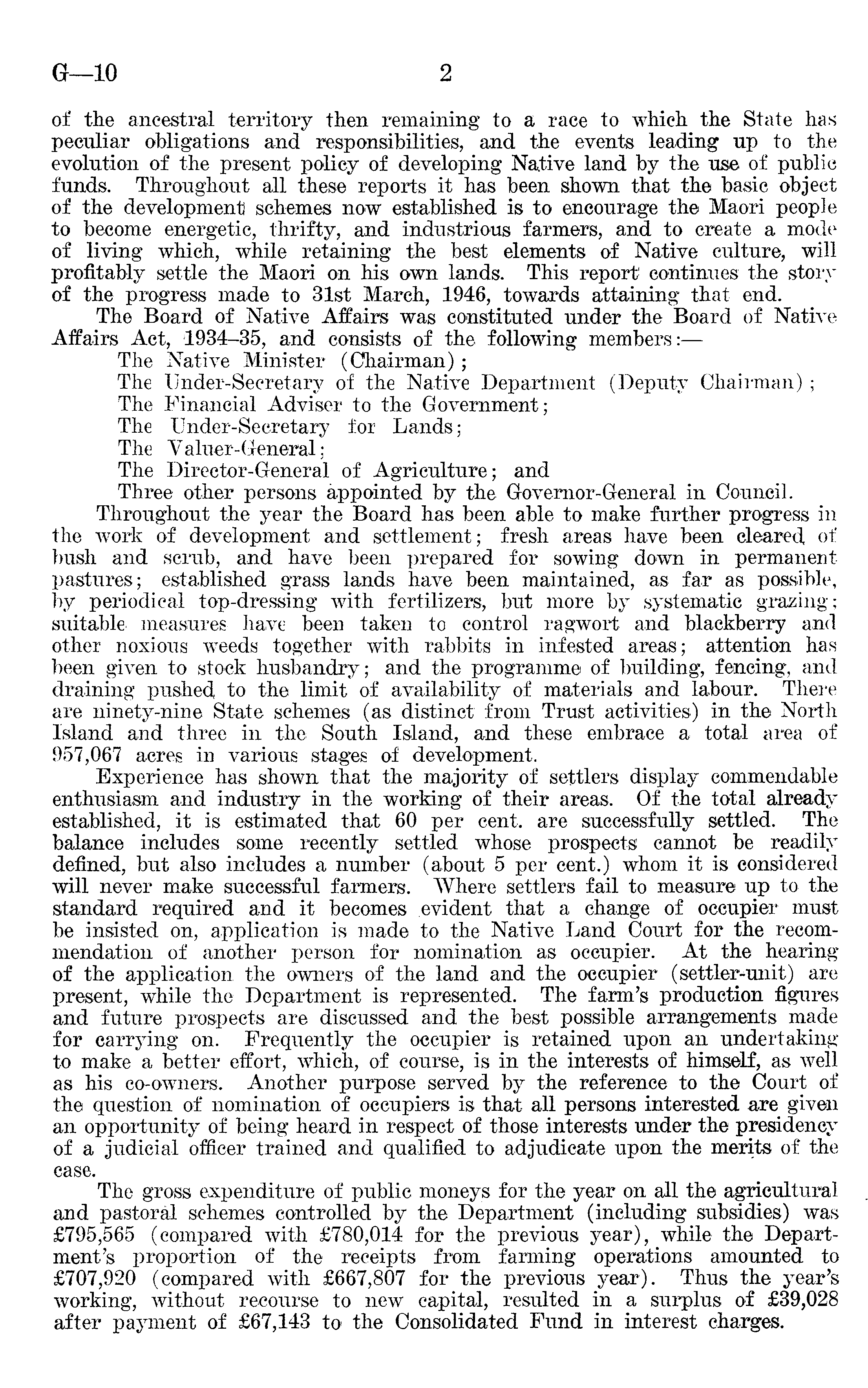 of the ancestral territory then remaining* to a race to which the State has peculiar obligations and responsibilities, and the events leading up to the evolution of the present policy of developing Native land by the use of public funds. Throughout all these reports it has been shown that the basic object of the development! schemes now established is to encourage the Maori people to become energetic, thrifty, and industrious farmers, and to create a mode of living which, while retaining the best elements of Native culture, will profitably settle the Maori on his own lands. This report continues the story of the progress made to 31st March, 1946, towards attaining that end. The Board of Native Affairs was constituted under the Board of Native Affairs Act, 1934-35, and consists of the following members: — The Native Minister (Chairman) ; The Under-Secretary of the Native Department (Deputy Chan-man) ; The Financial Adviser to the Government; The Under-Secretary for Lands; The Y aluer- General; The Director-General of Agriculture; and Three other persons appointed by the Governor-General in Council. Throughout the year the Board has been able to make further progress in the work of development and settlement; fresh areas have been cleared, of bush and scrub, and have been prepared for sowing down in permanent pastures; established grass lands have been maintained, as far as possible, by periodical top-dressing with fertilizers, but more by systematic grazing; suitable measures have been taken to control ragwort and blackberry and other noxious weeds together with rabbits in infested areas; attention has been given to stock husbandry; and the programme of building, fencing, and draining pushed, to the limit of availability of materials and labour. There are ninety-nine State schemes (as distinct from Trust activities) in the North Island and three in the South Island, and these embrace a total area of 957,067 acres in various stages of development. Experience has shown that the majority of settlers display commendable enthusiasm and industry in the working of their areas. Of the total already established, it is estimated that 60 per cent, are successfully settled. The balance includes some recently settled whose prospects cannot be readily defined, but also includes a number (about 5 per cent.) whom it is considered will never make successful farmers. Where settlers fail to measure up to the standard required and it becomes evident that a change of occupier must be insisted on, application is made to the Native Land Court for the recommendation of another person for nomination as occupier. At the hearing of the application the owners of the land and the occupier (settler-unit) are present, while the Department is represented. The farm's production figures and future prospects are discussed and the best possible arrangements made for carrying on. Frequently the occupier is retained upon an undertaking to make a better effort, which, of course, is in the interests of himself, as well as his co-owners. Another purpose served by the reference to the Court of the question of nomination of occupiers is that all persons interested are given an opportunity of being heard in respect of those interests under the presidency of a judicial officer trained and qualified to adjudicate upon the merits of the case. The gross expenditure of public moneys for the year on all the agricultural and pastoral schemes controlled by the Department (including subsidies) was £795,565 (compared with £780,014 for the previous year), while the Department's proportion of the receipts from farming operations amounted to £707,920 (compared with £667,807 for the previous year). Thus the year's working, without recourse to new capital, resulted in a surplus of £39,028 after payment of £67,143 to the Consolidated Fund in interest charges.