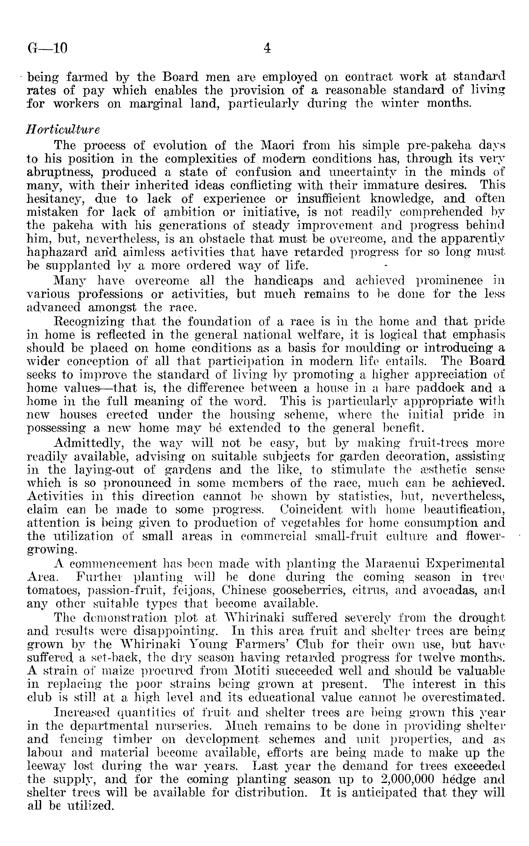 being farmed by the Board men are employed on contract work at standard rates of pay which enables the provision of a reasonable standard of living for workers on marginal land, particularly during the winter months. Horticulture The process of evolution of the Maori from his simple pre-pakeha days to his position in the complexities of modern conditions has, through its very abruptness, produced a state of confusion and uncertainty in the minds of many, with their inherited ideas conflicting with their immature desires. This hesitancy, d,ue to lack of experience or insufficient knowledge, and often mistaken for lack of ambition or initiative, is not readily comprehended by the pakeha with his generations of steady improvement and progress behind him, but, nevertheless, is an obstacle that must be overcome, and the apparently haphazard arid aimless activities that have retarded progress for so long must be supplanted by a more ordered way of life. Many have overcome all the handicaps and achieved prominence in various professions or activities, but much remains to be done for the less advanced amongst the race. Recognizing that the foundation of a race is in the home and that pride in home is reflected in the general national welfare, it is logical that emphasis should be placed on home conditions as a basis for moulding or introducing a wider conception of all that participation in modern life entails. The Board seeks to improve the standard of living by promoting a higher appreciation of home values —that is, the difference between a house in a bare paddock and a home in the full meaning of the word. This is particularly appropriate with new houses erected under the housing scheme, where the initial pride in possessing a new home may be extended to the general benefit. Admittedly, the way will not be easy, but by making fruit-trees more readily available, advising on suitable subjects for garden decoration, assisting in the laying-out of gardens and the like, to stimulate the esthetic sense which is so pronounced in some members of the race, much can be achieved. Activities in this direction cannot be shown by statistics, but, nevertheless, claim can be made to some progress. Coincident with home beautification, attention is being given to production of vegetables for home consumption and the utilization of small areas in commercial small-fruit culture and flowergrowing. A commencement has been made with planting the Maraenui Experimental Area, Further planting will be done during the coming season in tree tomatoes, passion-fruit, feijoas, Chinese gooseberries, citrus, and avocadas, and any other suitable types that become available. The demonstration plot at Whirinaki suffered severely from the drought and results were disappointing. In this area fruit and shelter trees are being grown by the Whirinaki Young Farmers' Club for their own use, but have suffered, a set-back, the dry season having retarded progress for twelve months. A strain of maize procured from Motiti succeeded well and should be valuable in replacing the poor strains being grown at present. The interest in this club is still at a high level and its educational value cannot be overestimated. Increased quantities of fruit and shelter trees are being grown this year in the departmental nurseries. Much remains to be done in providing shelter and fencing timber on development schemes and unit properties, and as labour and material become available, efforts are being made to make up the leeway lost during the war years. Last year the demand for trees exceeded the supply, and for the coming planting season up to 2,000,000 he'dge and shelter trees will be available for distribution. It is anticipated that they will all be utilized.