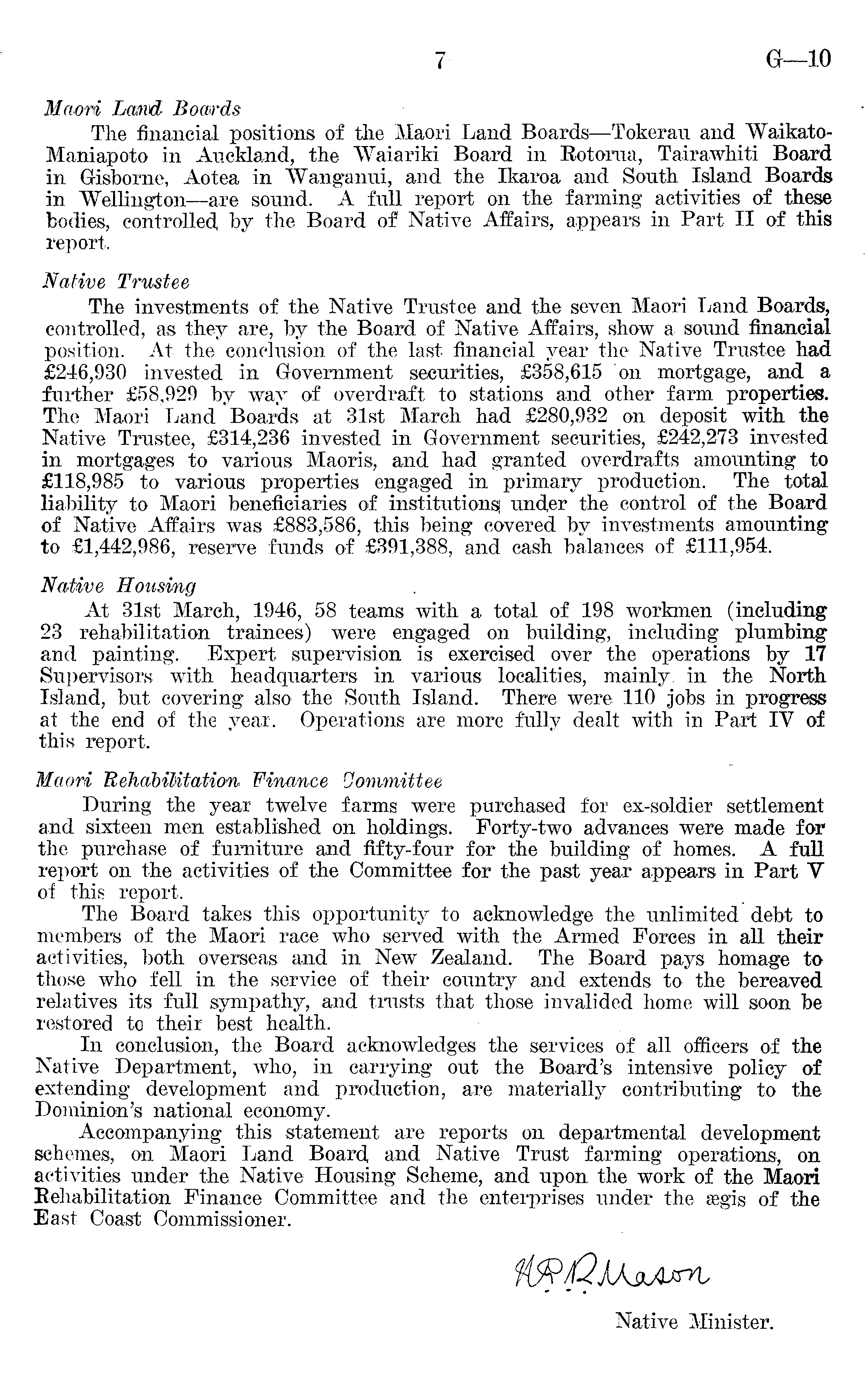 Maori Land Boards The financial positions of the Maori Land Boards—Tokerau and WaikatoManiapoto in Auckland, the Waiariki Board in Rotoma, Tairawhiti Board in Gisborne, Aotea in Wanganui, and the Ikaroa and South Island Boards in Wellington—are sound. A full report on the farming activities of these bodies, controlled, by the Board of Native Affairs, appears in Part II of this report. Native Trustee The investments of the Native Trustee and the seven Maori Land Boards, controlled, as they are, by the Board of Native Affairs, show a sound financial position. At the conclusion of the last financial year the Native Trustee had £246,930 invested in Government securities, £358,615 on mortgage, and a further £58,929 by way of overdraft to stations and other farm properties. The Maori Land Boards at 31st March had £280,932 on deposit with the Native Trustee, £314,236 invested in Government securities, £242,273 invested in mortgages to various Maoris, and had granted overdrafts amounting to £118,985 to various properties engaged in primary production. The total liability to Maori beneficiaries of institutions) under the control of the Board of Native Affairs was £883,586, this being covered by investments amounting to £1,442,986, reserve funds of £391,388, and cash balances of £111,954. Native Housmg At 31st March, 1946, 58 teams with a total of 198 workmen (including 23 rehabilitation trainees) were engaged on building, including plumbing and painting. Expert supervision is exercised over the operations by 17 Supervisors with headquarters in various localities, mainly in the North Island, but covering also the South Island. There were 110 .jobs in progress at the end of the year. Operations are more fully dealt with in Part IV of this report. Maori Rehabilitation Finance Committee During the year twelve farms were purchased for ex-soldier settlement and sixteen men established on holdings. Forty-two advances were made for the purchase of furniture and fifty-four for the building of homes. A full report on the activities of the Committee for the past year appears in Part Y of this report. The Board takes this opportunity to acknowledge the unlimited debt to members of the Maori race who served with the Armed Forces in all their activities, both overseas and in New Zealand. The Board pays homage to those who fell in the service of their country and extends to the bereaved relatives its full sympathy, and trusts that those invalided home will soon be restored to their best health. In conclusion, the Board acknowledges the services of all officers of the Native Department, who, in carrying out the Board's intensive policy of extending development and production, are materially contributing to the Dominion's national economy. Accompanying this statement are reports on departmental development schemes, on Maori Land Board and Native Trust farming operations, on activities under the Native Housing Scheme, and upon the work of the Maori Rehabilitation Finance Committee and the enterprises under the asgis of the East Coast Commissioner. Native Minister.