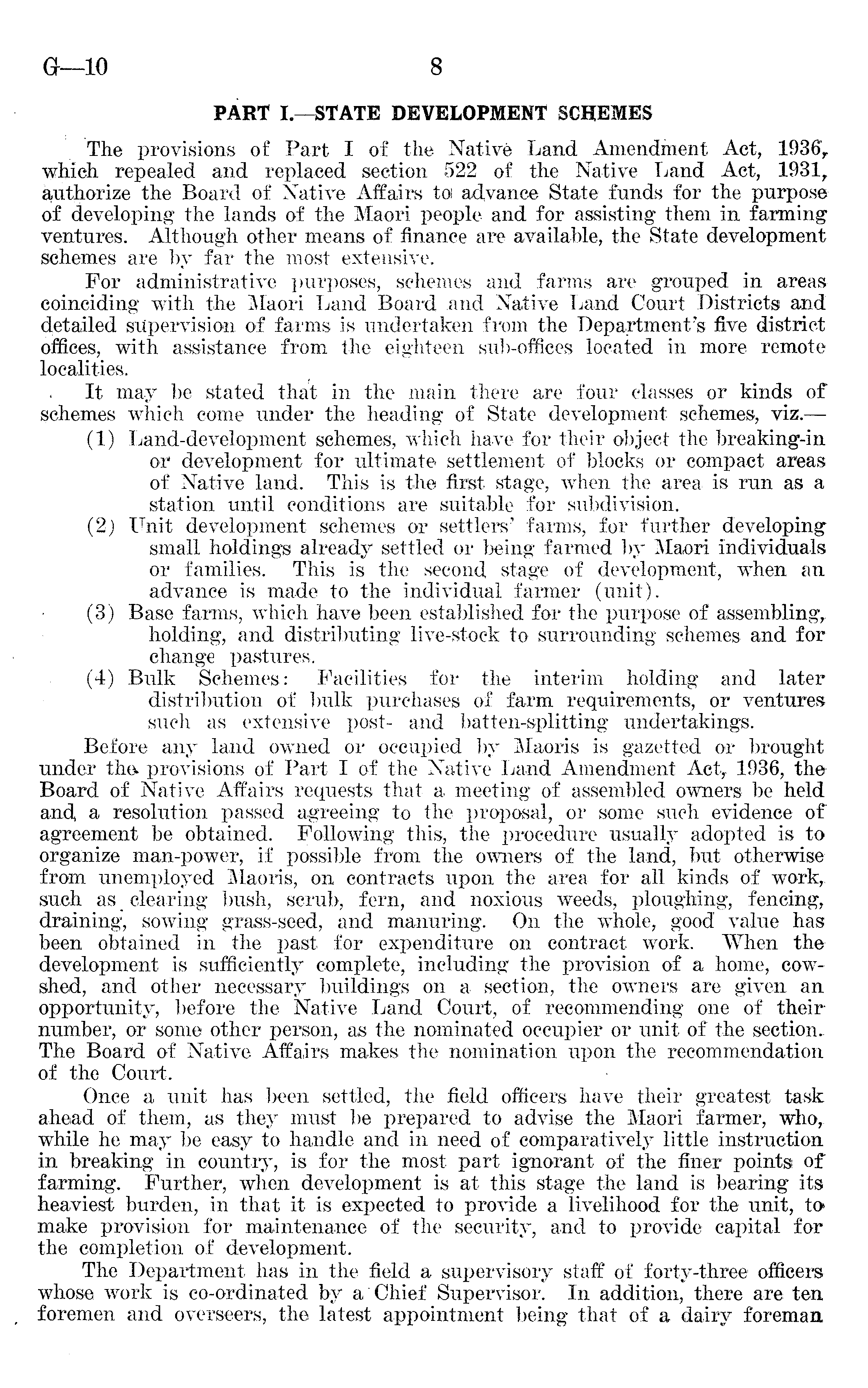 PART I.—STATE DEVELOPMENT SCHEMES The provisions of Part I of the Native Land Amendment Act, 1936, which repealed and replaced section 522 of the Native Land Act, 1931, authorize the Board of Native Affairs toi advance State funds for the purpose of developing the lands of the Maori people and for assisting them in farming 1 ventures. Although other means of finance are available, the State development schemes are by far the most extensive. For administrative purposes, schemes and farms are grouped in areas coinciding with the Maori Land Board .and Native Land Court Districts and detailed supervision of farms is undertaken from the Department's five district offices, with assistance from the eighteen sub-offices located in more remote localities. It may be stated that in the main there are four classes or kinds of schemes which come under the heading of State development schemes, viz.— (1) Land-development schemes, which have for their object the breaking-in or development for ultimate settlement of blocks or compact areas of Native land. This is the first stage, when the area is run as a station until conditions are suitable for subdivision. (2) Unit development schemes or settlers' farms, for further developing small holdings already settled or being farmed by Maori individuals or families. This is the second stage of development, when an advance is made to the individual farmer (unit). (3) Base farms, which have been established for the purpose of assembling,. holding, and distributing live-stock to surrounding schemes and for change pastures. (4) Bulk Schemes: Facilities for the interim holding and later distribution of bulk purchases of farm requirements, or ventures such as extensive post- and batten-splitting undertakings. Before any land owned or occupied by Maoris is gazetted or brought under the. provisions of Part I of the Native Land Amendment Act,. 1936, the Board of Native Affairs requests that a meeting of assembled owners be held and, a resolution passed agreeing to the proposal, or some such evidence of agreement be obtained. Following this, the procedure usually adopted is to organize man-power, if possible from the owners of the land, but otherwise from unemployed Maoris, on contracts upon the area for all kinds of work,, such as _ clearing bush, scrub, fern, and noxious weeds, ploughing, fencing, draining, sowing grass-seed, and manuring. On the whole, good' value has been obtained in the past for expenditure on contract work. When the development is sufficiently complete, including the provision of a home, cowshed, and other necessary buildings on a section, the owners are given an opportunity, before the Native Land Court, of recommending one of their number, or some other person, as the nominated occupier or unit of the section. The Board of Native Affairs makes the nomination upon the recommendation of the Court. Once a unit has been settled, the field officers have their greatest task ahead of them, as they must be prepared to advise the Maori farmer, who, while he may be easy to handle and in need of comparatively little instruction in breaking in country, is for the most part ignorant of the finer points of farming. Further, when development is at this stage the land is bearing its heaviest burden, in that it is expected to provide a livelihood for the unit, to* make provision for maintenance of the security, and to provide capital for the completion of development. The Department has in the field a supervisory staff of forty-three officers whose work is co-ordinated by a'Chief Supervisor. In addition, there are ten foremen and overseers, the latest appointment being that of a dairy foreman