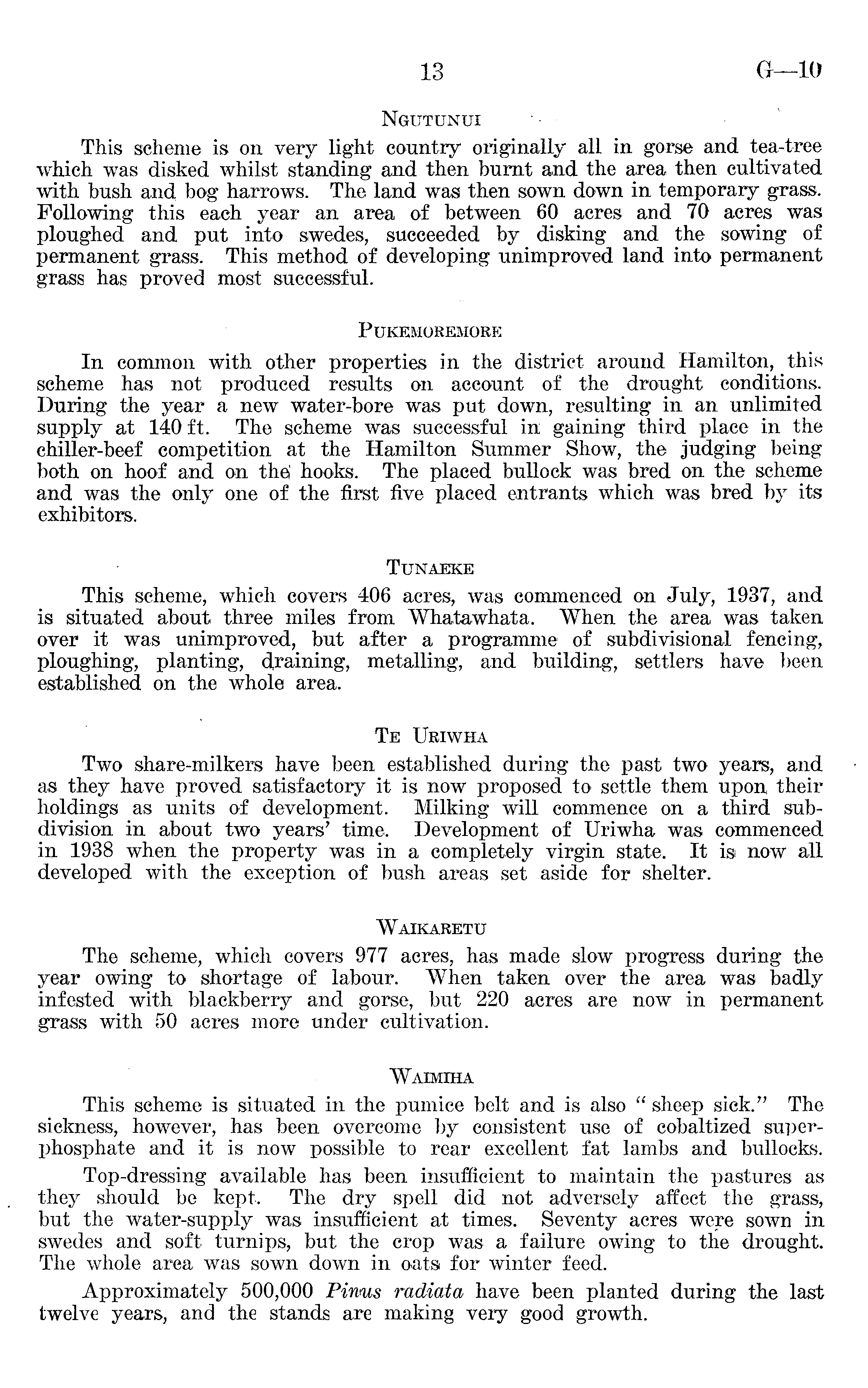 Ngutunui ■ • - This scheme is on very light country originally all in gorse and tea-tree which was disked whilst standing and then burnt and the area then cultivated with bush and bog harrows. The land was then sown down in temporary grass. Following this each year an area of between 60 acres and 70 acres was ploughed and put into swedes, succeeded by disking and the sowing of permanent grass. This method of developing unimproved land into permanent grass has proved most successful. PIJKEMOREMORE In common with other properties in the district around Hamilton, this scheme has not produced results on account of the drought conditions. During the year a new water-bore was put down, resulting in an unlimited supply at 140 ft. The scheme was successful in gaining third place in the chiller-beef competition at the Hamilton Summer Show, the judging being both on hoof and on the' hooks. The placed bullock was bred on the scheme and was the only one of the first five placed entrants which was bred by its exhibitors. Tunaeke This scheme, which covers 406 acres, was commenced on July, 1937, and is situated about three miles from Whatawhata. When the area was taken over it was unimproved, but after a programme of subdivisional fencing, ploughing, planting, draining, metalling, and building, settlers have been established on the whole area. Te Uriwha Two share-milkers have been established during the past two years, and as they have proved satisfactory it is now proposed to settle them upon their holdings as units of development. Milking will commence on a third subdivision in about two years' time. Development of Uriwha was commenced in 1938 when the property was in a completely virgin state. It is now all developed with the exception of bush areas set aside for shelter. Waikaretu The scheme, which covers 977 acres, has made slow progress during the year owing to shortage of labour. When taken over the area was badly infested with blackberry and gorse, but 220 acres are now in permanent grass with 50 acres more under cultivation. Waimiha This scheme is situated in the pumice belt and is also " sheep sick." The sickness, however, has been overcome by consistent use of cobaltized superphosphate and it is now possible to rear excellent fat lambs and bullocks. Top-dressing available has been insufficient to maintain the pastures as they should be kept. The dry spell did not adversely affect the grass, but the water-supply was insufficient at times. Seventy acres were sown in swedes and soft turnips, but the crop was a failure owing to the drought. The whole area was sown down in oats for winter feed. Approximately 500,000 Pinus radiata have been planted during the last twelve years, and the stands are making very good growth.