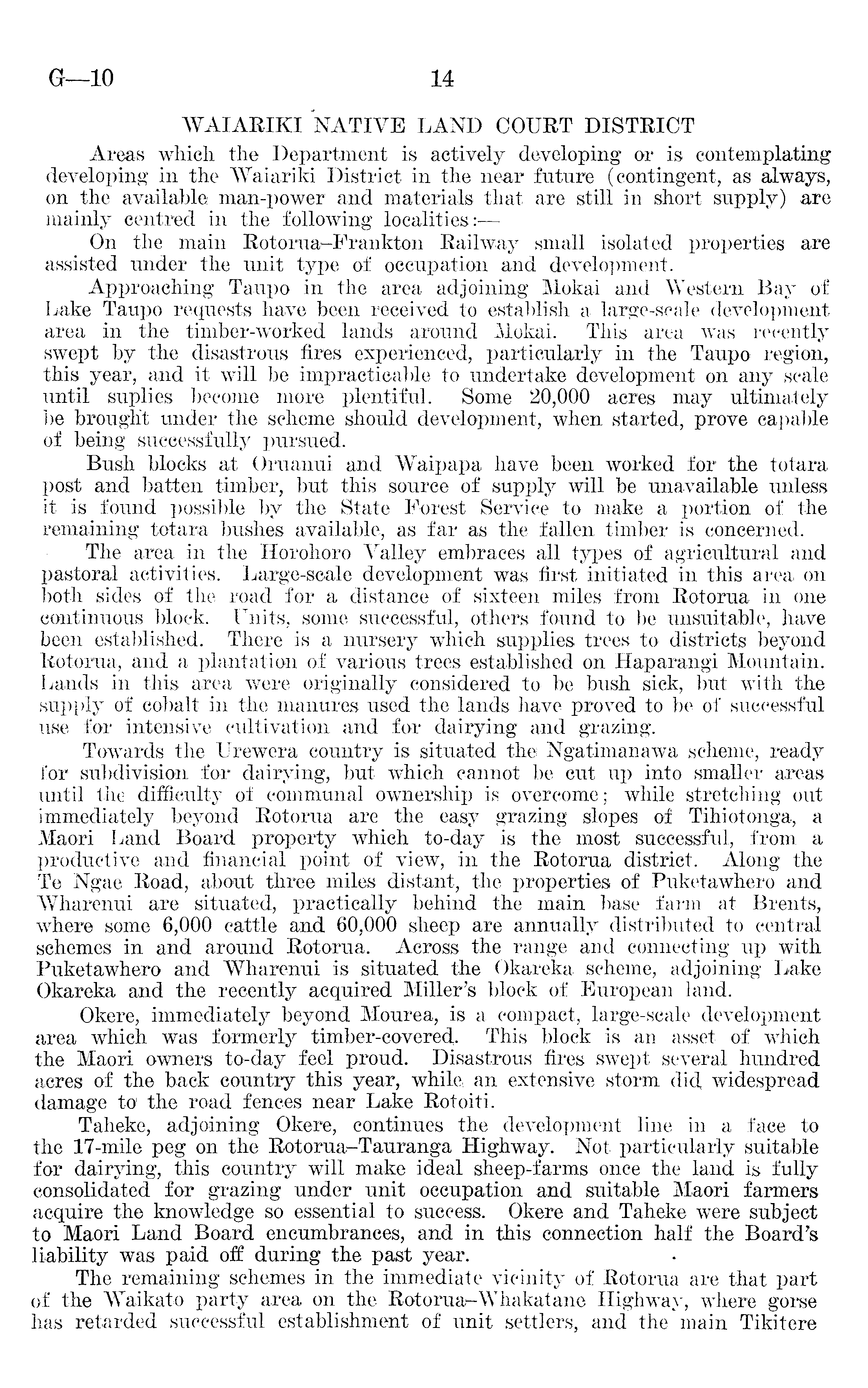 WAIARIKI NATIVE LAND COURT DISTRICT Areas which the Department is actively developing or is contemplating developing in the Waiariki District in the near future (contingent, as always, on the available man-power and materials that are still in short supply) are mainly centred in the following localities: — On the main Rotorua-Frankton Railway small isolated properties are assisted under the unit type of occupation and development. Approaching Taupo in the area adjoining Mokai and Western Bay of Lake Taupo requests have been received to establish a large-scale development area in the timber-worked lands around Mokai. This area was recently swept by the disastrous fires experienced, particularly in the Taupo region, this year, and it will be impracticable to undertake development on any scale until suplies become more plentiful. Some 20,000 acres may ultimately be brought under the scheme should development, when started, prove capable of being successfully pursued. Bush blocks at Oruanui and Waipapa have been worked for the totara post and batten timber, but this source of supply will be unavailable unless it is found possible by the State Forest Service to make a portion of the remaining totara bushes available, as far as the fallen timber is concerned. The area in the Horohoro Valley embraces all types of agricultural and pastoral activities. Large-scale development was first initiated in this area on both sides of the road for a distance of sixteen miles from Rotorua in one continuous block. Units, some successful, others found to be unsuitable, have been established. There is a nursery which supplies trees to districts beyond Rotorua, and a plantation of various trees established on Haparangi Mountain. Lands in this area were originally considered to be bush sick, but with the supply of cobalt in the manures used the lands have proved to be of successful use for intensive cultivation and for dairying and grazing. Towards the Urewera country is situated the Ngatimanawa scheme, ready for subdivision for dairying, but which cannot be cut up into smaller areas until the difficulty of communal ownership is overcome; while stretching out immediately beyond Rotorua are the easy grazing slopes of Tihiotonga, a Maori Land Board property which to-day is the most successful, from a productive and financial point of view, in the Rotorua district. Along the Te Ngae Road, about three miles distant, the properties of Puketawhero and Wharenui are situated, practically behind the main base farm at Brents, where some 6,000 cattle and 60,000 sheep are annually distributed to central schemes in and around Rotorua. Across the range and connecting up with Puketawhero and Wharenui is situated the Okareka scheme, adjoining Lake Okareka and the recently acquired Miller's block of European land. Okere, immediately beyond Mourea, is a compact, large-scale development area which was formerly timber-covered,. This block is an asset of which the Maori, owners to-day feel proud. Disastrous fires swept several hundred acres of the back country this year, while an extensive storm did, widespread damage to the road fences near Lake Rotoiti. Taheke, adjoining Okere, continues the development line in a face to the 17-mile peg on the Rotorua-Tauranga Highway. Not particularly suitable for dairying, this country will make ideal sheep-farms once the land is fully consolidated for grazing under unit occupation and suitable Maori farmers acquire the knowledge so essential to success. Okere and Taheke were subject to Maori Land Board encumbrances, and in this connection half the Board's liability was paid off during the past year. The remaining schemes in the immediate vicinity of Rotorua are that part of the Waikato party area on the Rotorua-AVhakatane Highway, where gorse has retarded successful establishment of unit settlers, and the main Tikitere