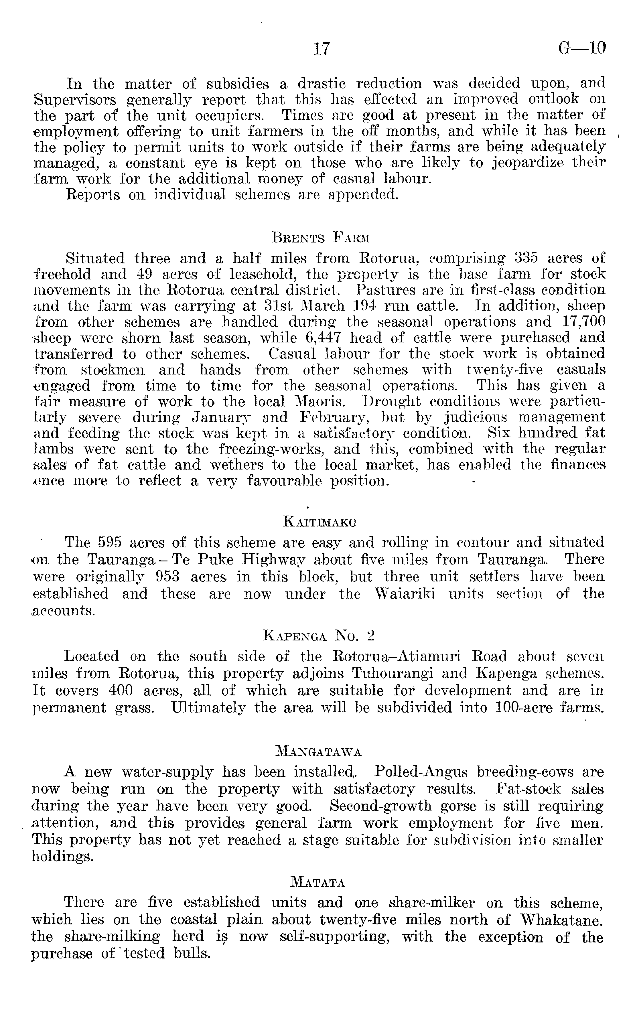 In the matter of subsidies a drastic reduction was decided upon, and Supervisors generally report that this has effected an improved outlook on the part of the unit occupiers. Times are good at present in the matter of employment offering to unit farmers in the off months, and while it has been the policy to permit units to work outside if their farms are being adequately managed, a constant eye is kept on those who are likely to jeopardize their farm work for the additional money of casual labour. Reports on individual schemes are appended. Brents Farm Situated three and a half miles from Rotorua, comprising 335 acres of freehold and 49 acres of leasehold, the property is the base farm for stock movements in the Rotorua central district. Pastures are in first-class condition and the farm was carrying at 31st March 194 run cattle. In addition, sheep from other schemes are handled during the seasonal operations and 17,700 sheep were shorn last season, while 6,447 head of cattle were purchased and transferred to other schemes. Casual labour for the stock work is obtained from stockmen and hands from other schemes with twenty-five casuals -engaged from time to time for the seasonal operations. This has given a fair measure of work to the local Maoris. Drought conditions were particularly severe during January and February, but by judicious management and feeding the stock was! kept in a satisfactory condition. Six hundred fat lambs were sent to the freezing-works, and this, combined with the regular sales! of fat cattle and wethers to the local market, has enabled the finances once more to reflect a very favourable position. Kaitimako The 595 acres of this scheme are easy and rolling in contour and situated on the Tauranga -Te Puke Highway about five miles from Tauranga. There were originally 953 acres in this block, but three unit settlers have been established and these are now under the Waiariki units section of the accounts. Kapenga No. 2 Located on the south side of the Rotorua-Atiamuri Road about seven miles from Rotorua, this property adjoins Tuhourangi and Kapenga schemes. It covers 400 acres, all of which are suitable for development and are in permanent grass. Ultimately the area will be subdivided into 100-acre farms. Mangatawa A new water-supply has been installed,. Polled-Angus breeding-cows are now being run on the property with satisfactory results. Fat-stock sales during the year have been very good. Second-growth gorse is still requiring attention, and this provides general farm work employment for five men. This property has not yet reached a stage suitable for subdivision into smaller holdings. Matata There are five established units and one share-milker on this scheme, which lies on the coastal plain about twenty-five miles north of Whakatane. the share-milking herd is now self-supporting, with the exception of the purchase of tested bulls.