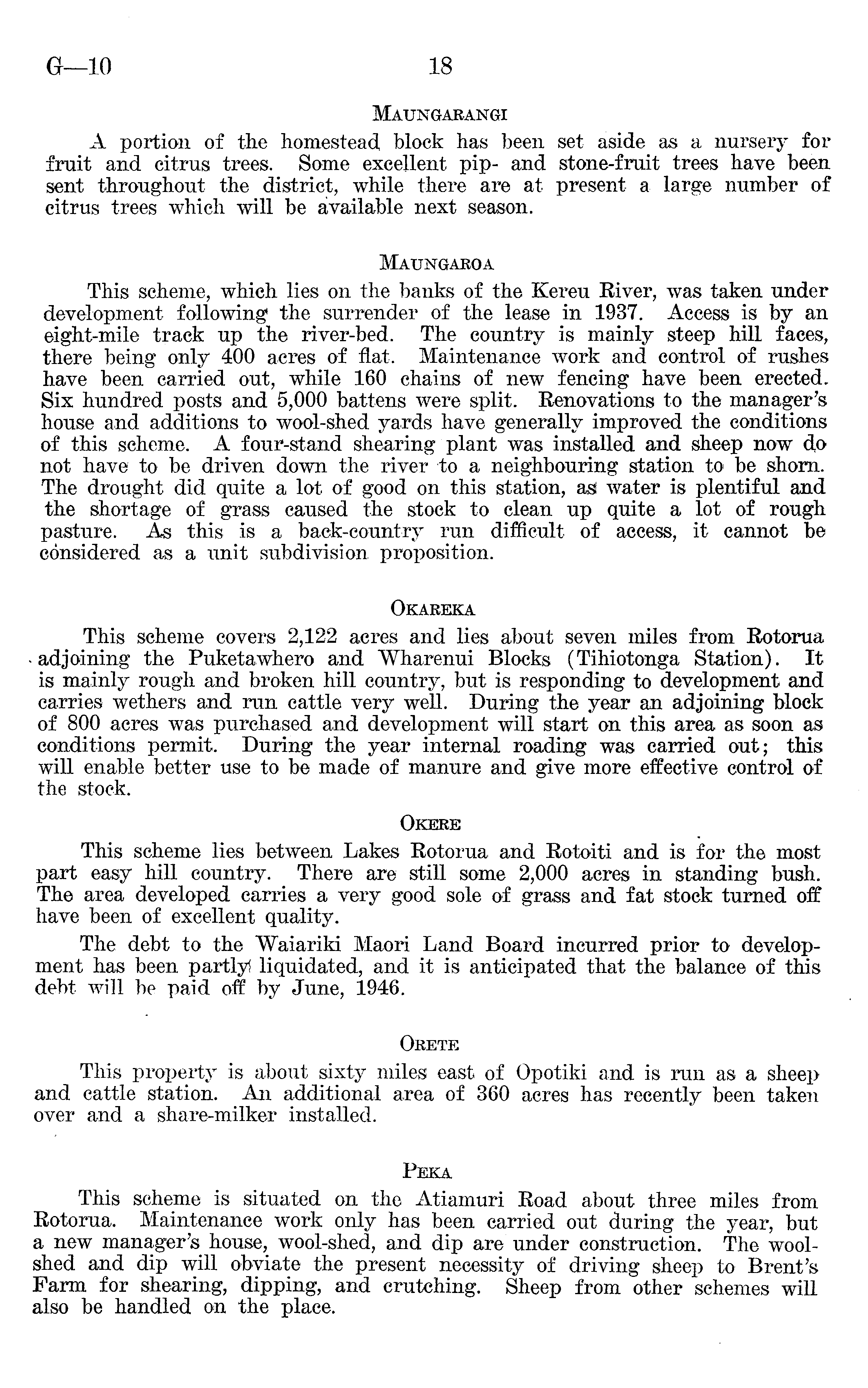 Maungarangi A portion of the homestead, block has been set aside as a nursery for fruit and citrus trees. Some excellent pip- and stone-fruit trees have been sent throughout the district, while there are at present a large number of citrus trees which will be available next season. Maungaroa This scheme, which lies on the banks of the Kereu River, was taken under development following the surrender of the lease in 1937. Access is by an eight-mile track up the river-bed. The country is mainly steep hill faces, there being only 400 acres of flat. Maintenance work and control of rushes have been carried out, while 160 chains of new fencing have been erected. Six hundred posts and 5,000 battens were split. Renovations to the manager's house and additions to wool-shed yards have generally improved the conditions of this scheme. A four-stand shearing plant was installed and sheep now do not have to be driven down the river to a neighbouring station to be shorn. The drought did quite a lot of good on this station, asi water is plentiful and the shortage of grass caused the stock to clean up quite a lot of rough pasture. As this is a back-country run difficult of access, it cannot be considered as a unit subdivision proposition. Okareka This scheme covers 2,122 acres and lies about seven miles from Rotorua ■ adjoining the Puketawhero and "Wharenui Blocks (Tihiotonga Station). It is mainly rough and broken hill country, but is responding to development and carries wethers and run cattle very well. During the year an adjoining block of 800 acres was purchased and development will start on this area as soon as conditions permit. During the year internal reading was carried out; this will enable better use to be made of manure and give more effective control of the stock. Okere This scheme lies between Lakes Rotorua and Rotoiti and is for the most part easy hill country. There are still some 2,000 acres in standing bush. The area developed carries a very good sole of grass and fat stock turned off have been of excellent quality. The debt to the Waiariki Maori Land Board incurred prior to development has been partly liquidated, and it is anticipated that the balance of this debt will be paid off by June, 1946. Orete This property is about sixty miles east of Opotiki and is run as a sheep and cattle station. An additional area of 360 acres has recently been taken over and a share-milker installed. Peka This scheme is situated on the Atiamuri Road about three miles from Rotorua. Maintenance work only has been carried out during the year, but a new manager's house, wool-shed, and dip are under construction. The woolshed and dip will obviate the present necessity of driving sheep to Brent's Farm for shearing, dipping, and crutching. Sheep, from other schemes will also be handled on the place.
