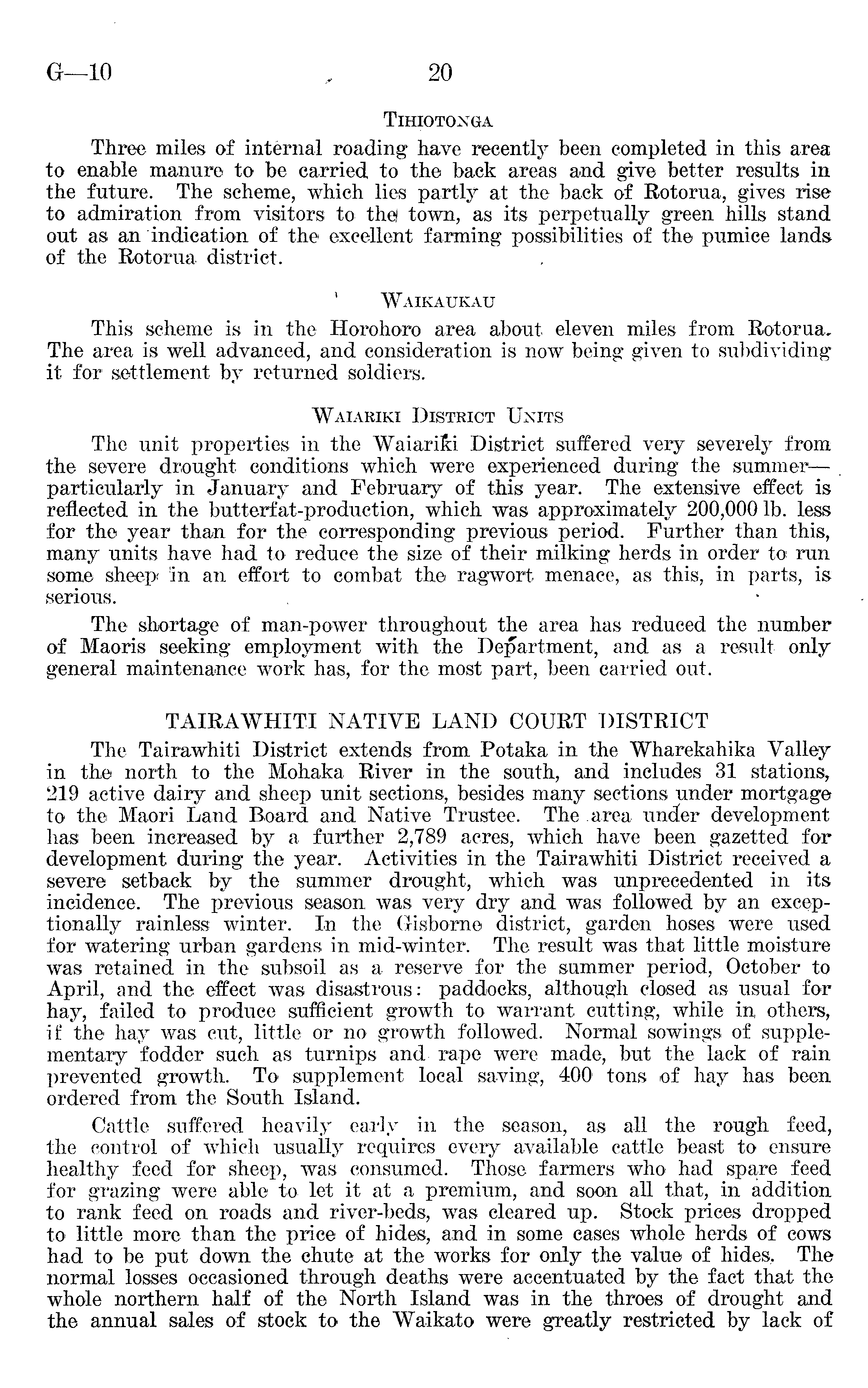 Tihiotonga Three miles of internal roading have recently been completed in this area to enable manure to be carried to the back areas and give better results in the future. The scheme, which lies partly at the back of Rotorua, gives rise to admiration from visitors to the) town, as its perpetually green hills stand out as an indication of the excellent farming possibilities of the pumice lands of the Rotorua. district. Waikaukau This scheme is in the Horohoro area about eleven miles from The area is well advanced, and consideration is now being given to subdividing it for settlement by returned soldiers. Waiariki District Units The unit properties in the Waiarifc District suffered very severely from the severe drought conditions which were experienced during the summer—particularly in January and February of this year. The extensive effect is reflected in the butterfat-production, which was approximately 200,000 lb. less for the year than for the corresponding previous period. Further than this, many units have had to reduce the size of their milking herds in order to run some sheep in an effort to combat the ragwort menace, as this, in parts, is serious. The shortage of man-power throughout the area has reduced the number of Maoris seeking employment with the Department, and as a result only general maintenance work has, for the most part, been carried out. TAIRAWHITI NATIVE LAND COURT DISTRICT The Tairawhiti District extends from Potaka in the Wharekahika Valley in the north to the Mohaka River in the south, and includes 31 stations, 219 active dairy and sheep unit sections, besides many sections under mortgage to the Maori Land Board and Native Trustee. The area under development has been increased by a further 2,789 acres, which have been gazetted for development during the year. Activities in the Tairawhiti District received a severe setback by the summer drought, which was unprecedented in its incidence. The previous season was very dry and was followed by an exceptionally rainless winter. In the Gisborne district, garden hoses were used for watering urban gardens in mid-winter. The result was that little moisture was retained in the subsoil as a reserve for the summer period, October to April, and the effect was disastrous: paddocks, although closed as usual for hay, failed to produce sufficient growth to warrant cutting, while in others, if the hay was cut, little or no growth followed. Normal sowings of supplementary fodder such as turnips and rape were made, but the lack of rain prevented growth. To supplement local saving, 400 tons of hay has been ordered from the South Island. Cattle suffered heavily early in the season, as all the rough feed,, the control of which usually requires every available cattle beast to ensure healthy feed for sheep, was consumed. Those farmers who had spare feed for grazing were able to let it at a premium, and soon all that, in addition to rank feed on roads and river-beds, was cleared up. Stock prices dropped to little more than the price of hides, and in some cases whole herds of cows had to be put down the chute at the works for only the value of hides.. The normal losses occasioned through deaths were accentuated by the fact that the whole northern half of the North Island was in the throes of drought and the annual sales of stock to the Waikato were greatly restricted by lack of