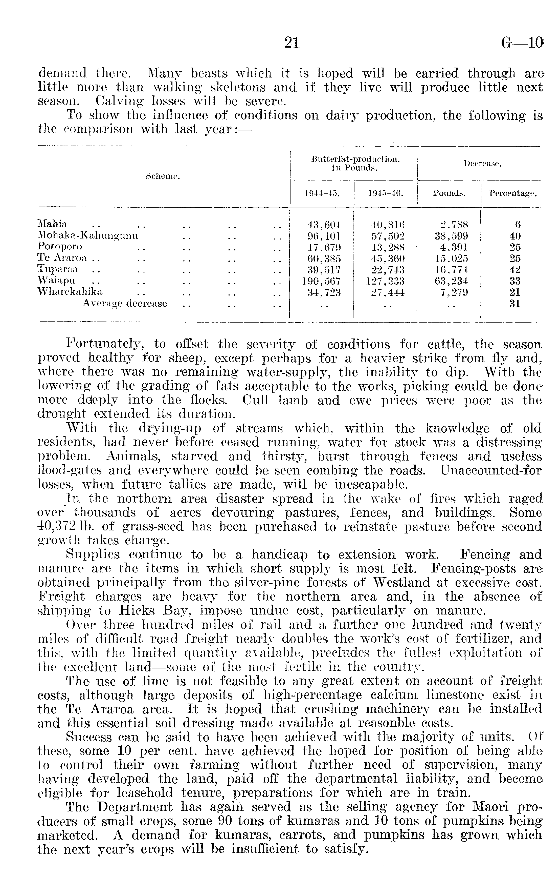 Scheme. Butterfat-production, in Pounds. Decrease. 1944-45. 1945-46. Pounds. Percentage. Mahia 43,604 40,816 2,788 6 Mohak a-Kah ungumi 96,101 57,502 38,599 40 Poroporo 17,679 13,288 4,391 25 Te Araroa 60,385 45.360 15,025 25 Tuparoa 39,517 22,743 16,774 42 Waiapu 190,567 127,333 63,234 33 Wharekahika 34,723 27,444 7., 279 21 Average decrease 31