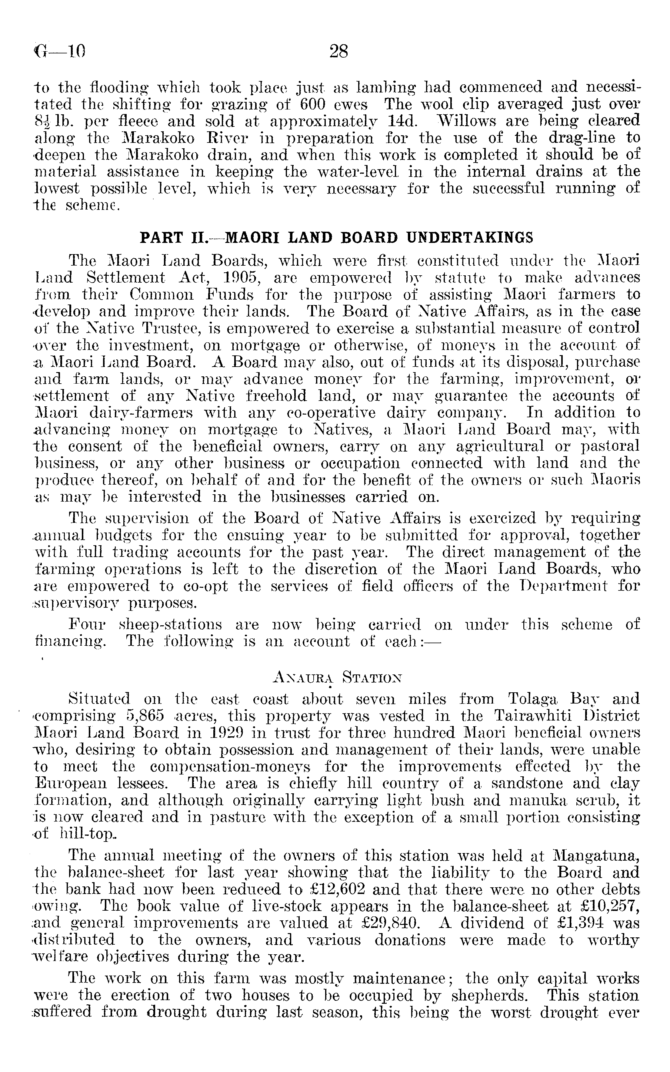 to the flooding which took place just as lambing had commenced and necessitated the shifting for grazing of 600 ewes The wool clip averaged just over 8| lb. per fleece and sold at approximately 14d. Willows are being cleared along the Marakoko River in preparation for the use of the drag-line to •deepen the Marakoko drain, and when this work is completed it should be of material assistance in keeping the water-level in the internal drains at the lowest possible level, which is very necessary for the successful running of the scheme. PART 11. MAORI LAND BOARD UNDERTAKINGS The Maori Land Boards, which were first constituted under the Maori Land Settlement Act, 1905, are empowered by statute to make advances from their Common Funds for the purpose of assisting Maori farmers to ■develop and improve their lands. The Board of Native Affairs, as in the case -of the Native Trustee, is empowered to exercise a substantial measure of control •over the investment, on mortgage or otherwise, of moneys in the account of k Maori Land Board. A Board may also, out of funds at its disposal, purchase and farm lands, or may advance money for the farming, improvement, or •settlement of any Native freehold land, or may guarantee the accounts of Maori dairy-farmers with any co-operative dairy company. In addition to advancing money on mortgage to Natives, a Maori Land Board may, with the consent of the beneficial owners, carry on any agricultural or pastoral business, or any other business or occupation connected with land and the produce thereof, on behalf of and for the benefit of the owners or such Maoris as may be interested in the businesses carried on. The supervision of the Board of Native Affairs is exercized by requiring annual budgets for the ensuing year to be submitted for approval, together with full trading accounts for the past year. The direct management of the farming operations is left to the discretion of the Maori Land Boards, who are empowered to co-opt the services of field officers of the Department for supervisory purposes. Four sheep-stations are now being carried on under this scheme of financing. The following is an account of each: — Anaura Station Situated 011 the east coast about seven miles from Tolaga Bay and 'comprising 5,865 acres, this property was vested in the Tairawhiti District Maori Land Board in 1929 in trust for three hundred Maori beneficial owners -who, desiring to obtain possession and management of their lands, were unable to meet the compensation-moneys for the improvements effected by the European lessees. The area is chiefly hill country of a sandstone and clay formation, and although originally carrying light bush and manuka scrub, it is now cleared and in pasture with the exception of a small portion consisting •of hill-top. The annual meeting of the owners of this station was held at Mangatuna, the balance-sheet for last year showing that the liability to the Board and the bank had now been reduced to £12,602 and that there were no other debts •owing. The book value of live-stock appears in the balance-sheet at £10,257, and general improvements are valued at £29,840. A dividend of £1,394 was •distributed to the owners, and various donations were made to worthy welfare objectives during the year. The work on this farm was mostly maintenance; the only capital works were the erection of two houses to be occupied by shepherds. This station suffered from drought during last season, this being the worst drought ever