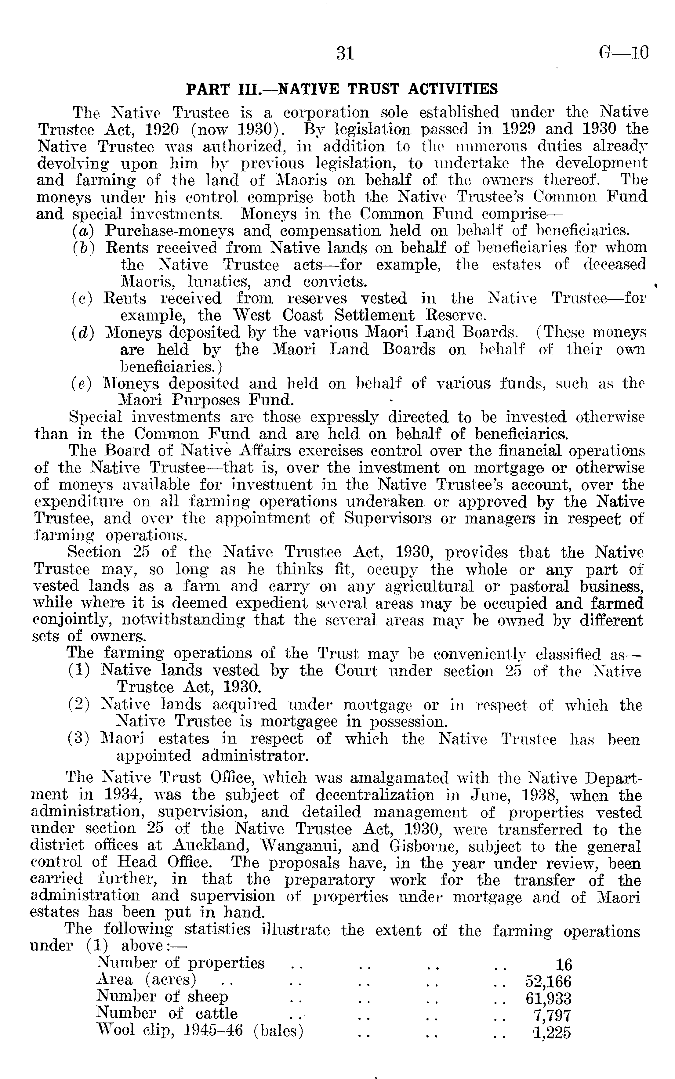 PART lII.—NATIVE TRUST ACTIVITIES The Native Trustee is a corporation sole established under the Native Trustee Act, 1920 (now 1930). By legislation passed in 1929 and 1930 the Native Trustee was authorized, in addition to the numerous duties already devolving upon him by previous legislation, to undertake the development and farming of the land of Maoris on behalf of the owners thereof. The moneys under his control comprise both the Native Trustee's Common Fund and special investments. Moneys in the Common Fund comprise—(a) Purchase-moneys and, compensation held on behalf of beneficiaries. (b) Rents received from Native lands on behalf of beneficiaries for whom the Native Trustee acts—for example, the estates of deceased Maoris, lunatics, and convicts. , (c) Rents received from reserves vested in the Native Trustee—for example, the West Coast Settlement Reserve. (d) Moneys deposited by the various Maori Land Boards. (These moneys are held by the Maori Land Boards on behalf of their own beneficiaries.) (e) Moneys deposited and held on behalf of various funds, such as the Maori Purposes Fund. Special investments are those expressly directed to be invested otherwise than in the Common Fund and are held on behalf of beneficiaries. The Board of Native Affairs exercises control over the financial operations of the Native Trustee—that is, over the investment on mortgage or otherwise of moneys available for investment in the Native Trustee's account, over the expenditure on all farming operations underaken or approved by the Native Trustee, and over the appointment of Supervisors or managers in respect of farming operations. Section 25 of the Native Trustee Act, 1930, provides that the Native Trustee may, so long as he thinks fit, occupy the whole or any part of vested lands as a farm and carry on any agricultural or pastoral business, while where it is deemed expedient several areas may be occupied and farmed conjointly, notwithstanding that the several areas may be owned by different sets of owners. The farming operations of the Trust may be conveniently classified as—(1) Native lands vested by the Court under section 25 of the Native Trustee Act, 1930. (2) Native lands acquired under mortgage or in respect of which the Native Trustee is mortgagee in possession. (3) Maori estates in respect of which the Native Trustee has been appointed administrator. The Native Trust Office, which was amalgamated with the Native Department in 1934, was the subject of decentralization in June, 1938, when the administration, supervision, and detailed management of properties vested under section 25 of the Native Trustee Act, 1930, were transferred to the district offices at Auckland, Wanganui, and Gisborne, subject to the general control of Head Office. The proposals have, in the year under review, been carried further, in that the preparatory work for the transfer of the administration and supervision of properties under mortgage and of Maori estates has been put in hand. The following statistics illustrate the extent of the farming operations under (1) above:— Number of properties .. .. .. .. 16 Area (acres) . . . . .. .. . . 52,166 Number of sheep .. .. . . .. 61,933 Number of cattle . . .. .. .. 7,797 Wool clip, 1945-46 (bales) .. .. .. ij'22s