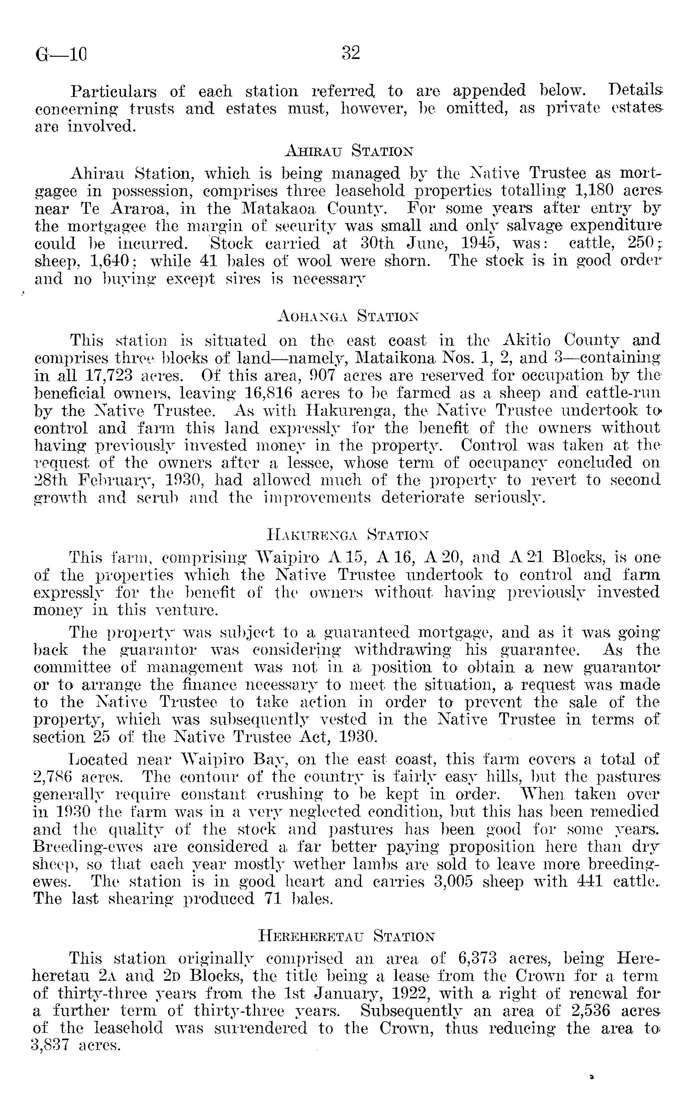 Particulars of each station referred, to are appended below. Details concerning trusts and estates must, however, be omitted, as private estates are involved. Ahirau Station Ahirau Station, which is being managed by the Native Trustee as mortgagee in possession, comprises three leasehold properties totalling 1,180 acres near Te Araroa, in the Matakaoa County. For some years after entry by the mortgagee the margin of security was small and only salvage expenditure could be incurred. Stock carried at 30th June, 1945, was: cattle, 250sheep, 1,640; while 41 bales of wool were shorn. The stock is in good order and, no buying except sires is necessary Aohanga Station This station is situated on the east coast in the Akitio County and comprises three blocks of land —namely, Mataikona Nos. 1, 2, and 3—containing in all 17,723 acres. Of this area, 907 acres are reserved for occupation by the beneficial owners, leaving 16,816 acres to be farmed as a sheep and cattle-run by the Native Trustee. As with Hakurenga, the Native Trustee undertook to control and farm this land expressly for the benefit of the owners without having previously invested money in the property. Control was taken at the request of the owners after a lessee, whose term of - occupancy concluded on 28th February, 1930, had allowed much of the property to revert to second growth and scrub and the improvements deteriorate seriously. Hakurenga Station This farm, comprising Waipiro A 15, A 16, A 20, and A 21 Blocks, is one of the properties which the Native Trustee undertook to control and farm expressly for the benefit of the owners without having previously invested money in this venture. The property' was subject to a guaranteed mortgage, and as it was going back the guarantor was considering withdrawing his guarantee. As the committee of management was not in a position to obtain a new guarantor or to arrange the finance necessary to meet the situation, a request was made to the Native Trustee to take action in. order to prevent the sale of the property, which was subsequently vested in the Native Trustee in terms of section 25 of the Native Trustee Act, 1930. Located near Waipiro Bay, on the east coast, this farm covers a total of 2,786 acres. The contour of the country is fairly easy hills, but the pastures generally require constant crushing to be kept in order. When, taken over in 1930 the farm was in a very neglected condition, but this has been remedied and the . quality of the stock and pastures has been good for some years. Breeding-ewes are considered a far better paying proposition here than dry sheep, so that each year mostly wether lambs are sold to leave more breedingewes. The station is in good heart and carries 3,005 sheep with 441 cattle. The last shearing produced 71 bales. Hereheretau Station This station originally comprised an area of 6,373 acres, being Hereheretau 2a and 2d Blocks, the title being a lease from the Crown for a. term of thirty-three years from the Ist January, 1922, with a right of renewal for a further term of thirty-three years. Subsequently an area of 2,536 acres of the leasehold was surrendered to the Crown, thus reducing the area to 3,837 acres.