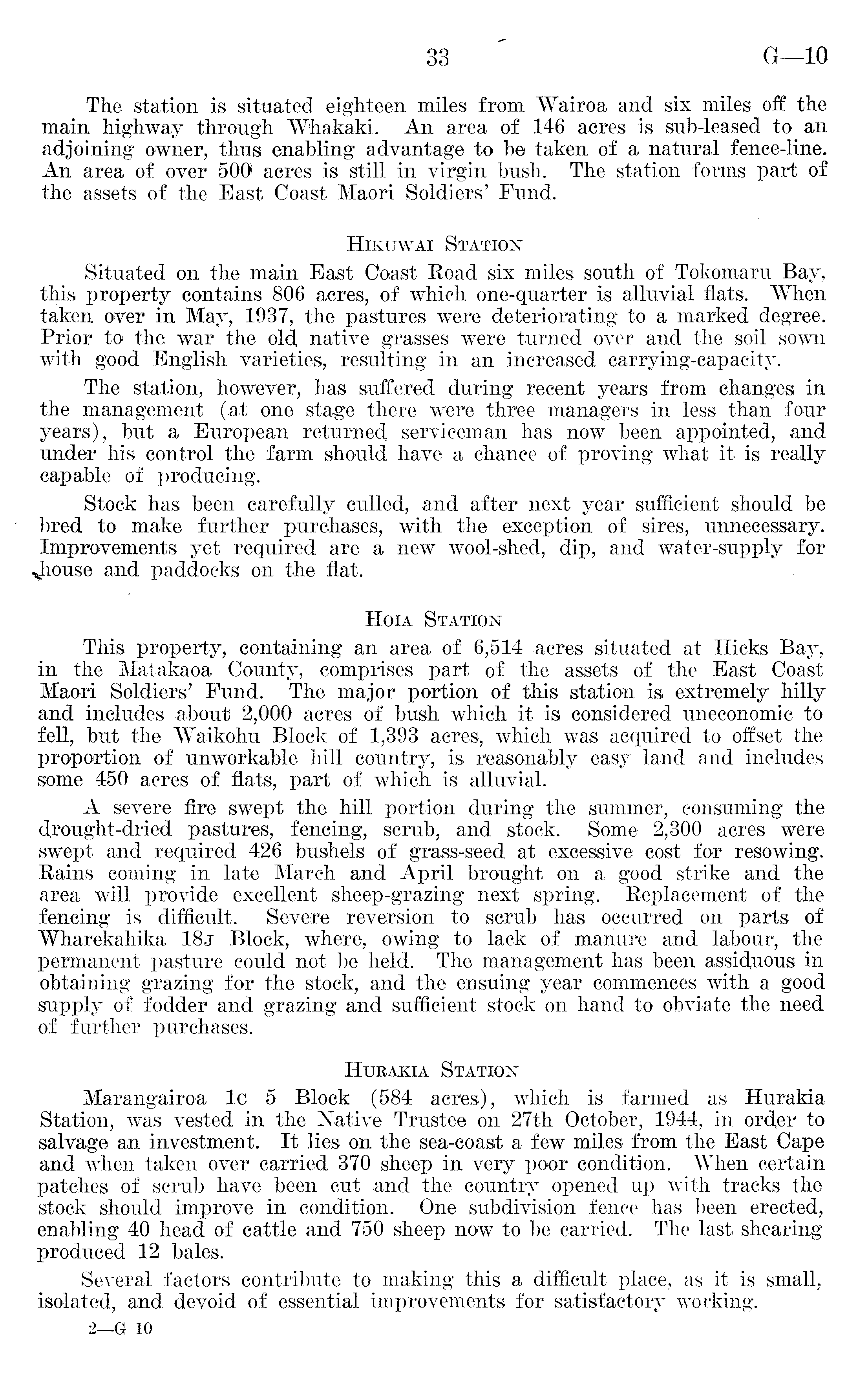 The station, is situated eighteen miles from Wairoa and six miles off the main highway through Whakaki. An area of 146 acres is sub-leased to an adjoining owner, thus enabling advantage to be taken of a natural fence-line. An area of over 500 acres is still in virgin bush. The station forms part of the assets of the Bast Coast Maori Soldiers' Fund. Hikuwai Station Situated on the main East Coast Road six miles south of Tokomaru Bay, this property contains 806 acres, of which one-quarter is alluvial flats. When taken over in May, 1937, the pastures were deteriorating to a marked degree. Prior to the war the old native grasses were turned over and the soil sown with good English varieties, resulting in an increased carrying-capacity. The station, however, has suffered during recent years from changes in the management (at one stage there were three managers in less than four years), but a European returned, serviceman has now been appointed, and under his control the farm should have a chance of proving what it is really capable of producing. Stock has been carefully culled, and after next year sufficient should be bred to make further purchases, with the exception of sires, unnecessary. Improvements yet required are a new wool-shed, dip, and water-supply for yhouse and paddocks on the flat. Hoia Station This property, containing an area of 6,514 acres situated at Hicks Bay, in the Matakaoa County, comprises part of the assets of the East Coast Maori Soldiers 7 Fund. The major portion of this station is extremely hilly and includes about 2,000 acres of bush which it is considered uneconomic to fell, but the Waikohu Block of 1,393 acres, which was acquired to offset the proportion of unworkable hill country, is reasonably easy land and includes some 450 acres of flats, part of which is alluvial. A severe fire swept the hill portion during the summer, consuming the drought-dried pastures, fencing, scrub, and stock. Some 2,300 acres were swept and required 426 bushels of grass-seed at excessive cost for resowing. Rains coming in late March and April brought on a good strike and the area will provide excellent sheep-grazing next spring. Replacement of the fencing is difficult. Severe reversion to scrub has occurred on parts of Wharekahika 18j Block, where, owing to lack of manure and labour, the permanent pasture could not be held. The management has been assiduous in obtaining grazing for the stock, and the ensuing year commences with a good supply of fodder and grazing and sufficient stock on hand to obviate the need of further purchases. Hurakia Station Marangairoa lc 5 Block (584 acres), which is farmed as Hurakia Station, was vested in the Native Trustee on 27th October, 1944, in ord,er to salvage an investment. It lies on the sea-coast a few miles from the East Cape and when taken over carried 370 sheep in very poor condition. When certain patches of scrub have been cut and the country opened up with tracks the stock should improve in condition. One subdivision fence has been erected, enabling 40 head of cattle and 750 sheep now to be carried. The last shearing produced 12 bales. Several factors contribute to making this a difficult place, as it is small, isolated, and devoid of essential improvements for satisfactory working.