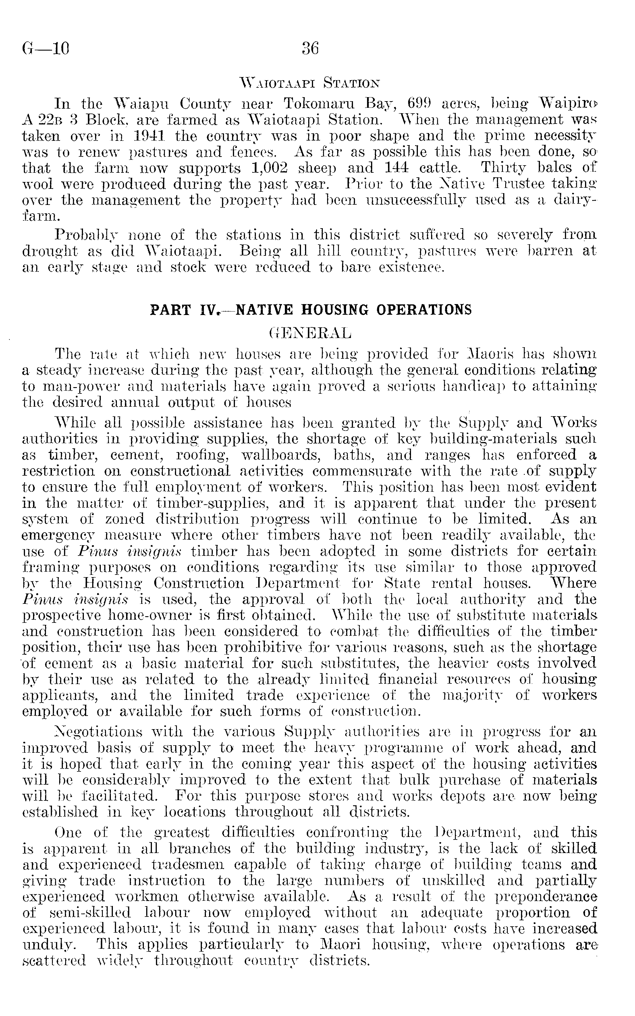 Waiotaapi Station In the Waiapu County near Tokomaru Bay, 699 acres, being Waipiro A 22b 3 Block, are farmed as Waiotaapi Station. When the management was taken over in 1941 the country was in poor shape and the prime necessity was to renew pastures and fences. As far as possible this has been done, so that the farm now supports 1,002 sheep and 144 cattle. Thirty bales of wool were produced during the past year. Prior to the Native Trustee taking over the management the property had been unsuccessfully used as a dairyfarm. Probably none of the stations in this district suffered so severely from drought as did Waiotaapi. Being all hill country, pastures were barren at an early stage and stock were reduced to bare existence. PART IV,—NATIVE HOUSING OPERATIONS GENERAL The rate at which new houses are being provided for Maoris has shown a steady increase during the past year, although the general conditions relating to man-power and materials have again proved a serious handicap to attaining the desired annual output of houses While all possible assistance has been granted by the Supply and Works authorities in providing supplies, the shortage of key building-materials such as timber, cement, roofing, wallboards, baths, and ranges has enforced a restriction on constructional activities commensurate with the rate .of supply to ensure the full employment of workers. This position has been most evident in the matter of timber-supplies, and it is apparent that under the present system of zoned distribution progress will continue to be limited. As an emergency measure where other timbers have not been readily available, the use of Pinus imignis timber has been adopted in some districts for certain framing purposes on conditions regarding its use similar to those approved by the Housing Construction Department for State rental houses. Where Pinus imignis is used, the approval of both the local authority and the prospective home-owner is first obtained. While the use of substitute materials and construction has been considered to combat the difficulties of the timber position, their use has been prohibitive for various reasons, such as the shortage of cement as a basic material for such substitutes, the heavier costs involved by their use as related to the already limited financial resources of housing applicants, and the limited trade experience of the majority of workers employed or available for such forms of construction. Negotiations with the various Supply authorities are in progress for an improved basis of supply to meet the heavy programme of work ahead, and it is hoped that early in the coming year this aspect of the housing activities will be considerably improved to the extent that bulk purchase of materials will be facilitated. For this purpose stores and works depots are now being established in key locations throughout all districts. One of the greatest difficulties confronting the Department, and this is apparent in all branches of the building industry, is the lack of skilled and experienced tradesmen capable of taking charge of building teams and giving trade instruction to the large numbers of unskilled and partially experienced workmen otherwise available. As a result of the preponderance of semi-skilled labour now employed without an adequate proportion of experienced labour, it is found in many cases that labour costs have increased unduly. This applies particularly to Maori housing, where operations are scattered widely throughout country districts.
