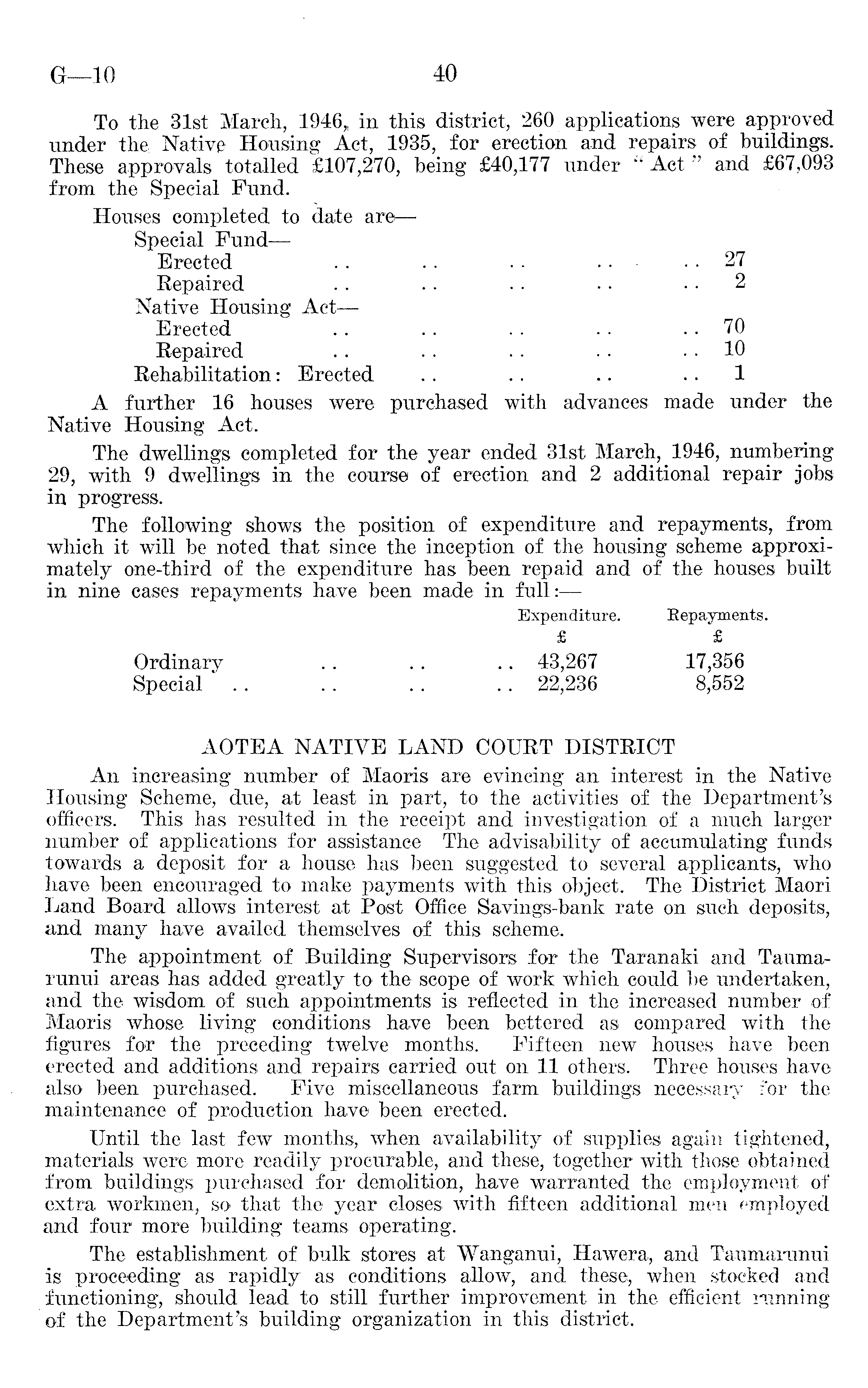 To the 31st March, 1946,, in this district, 260 applications were approved under the. Native Housing Act, 1935, for erection and repairs of buildings. These approvals totalled £107,270, being £40,177 under " Act " and £67,093 from the Special Fund. Houses completed to date are— Special Fund— Erected . . .. . . 27 Repaired .. .. .. .. .. 2 Native Housing Act— Erected .. .. .. . . .. 70 Repaired .. . . . . .. .. 10 Rehabilitation: Erected .. .. .. 1 A further 16 houses were purchased with advances made under the Native Housing Act. The dwellings completed for the year ended 31st March, 1946, numbering 29, with 9 dwellings in the course of erection and 2 additional repair jobs in progress. The following shows the position of expenditure and repayments, from which it will be noted that since the inception of the housing scheme approximately one-third of the expenditure has been repaid and of the houses built in nine cases repayments have been made in full:— Expenditure. Repayments. £ £ Ordinary . . .. .. 43,267 17,356 Special . . .. . . .. 22,236 8,552 AOTEA NATIVE LAND COURT DISTRICT An increasing number of Maoris are evincing an interest in the Native Housing Scheme, due, at least in part, to the activities of the Department's officers. This has resulted in the receipt and investigation of a much larger number of applications for assistance The advisability of accumulating funds towards a deposit for a house has been suggested to several applicants, who have been encouraged to make payments with this object. The District Maori Land Board allows interest at Post Office Savings-bank rate on such deposits, and many have availed themselves of this scheme. The appointment of Building Supervisors for the Taranaki and Taumarunui areas has added greatly to the scope of work which could be undertaken, and the wisdom of such appointments is reflected in the increased number of Maoris whose living conditions have been bettered as compared with the figures for the preceding twelve months. Fifteen new houses have been erected and additions and repairs carried out on 11 others. Three houses have also been purchased. Five miscellaneous farm buildings necessary for the maintenance of production have been erected. Until the last few months, when availability of supplies again tightened, materials were more readily procurable, and these, together with those obtained from buildings purchased for demolition, have warranted the employment of extra workmen, so that the year closes with fifteen additional men employed and four more building teams operating. The establishment of bulk stores at Wanganui, Hawera, and Taumarunui is proceeding as rapidly as conditions allow, and these, when stocked and functioning, should lead to still further improvement in the efficient running of the Department's building organization in this district.
