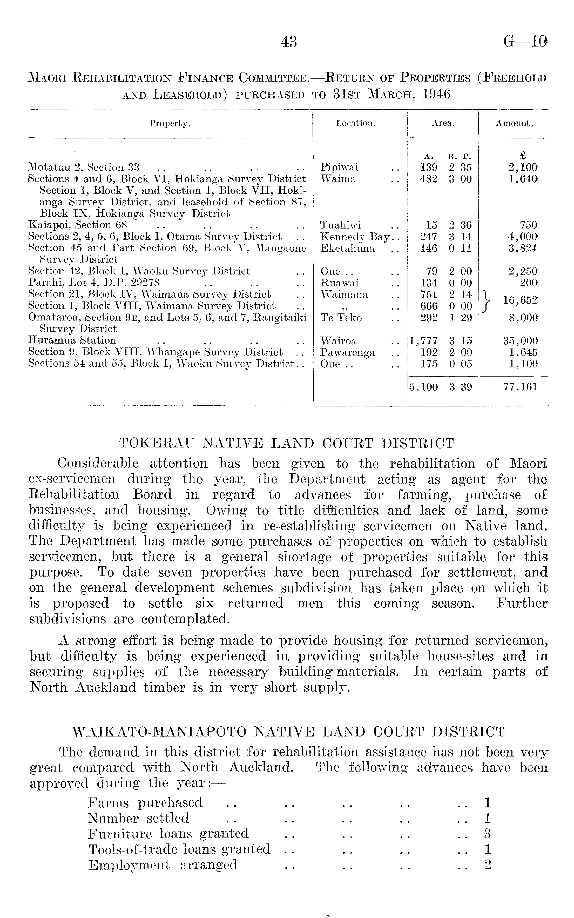 TOKERAU NATIVE LAND COURT DISTRICT Considerable attention has been given to the rehabilitation of Maori ex-servicemen during 1 the year, the Department acting as agent for the Rehabilitation Board in regard to advances for farming, purchase of businesses, and housing. Owing to title difficulties and lack of land, some difficulty is being experienced in re-establishing servicemen on Native land. The Department has made some purchases of properties on which to establish servicemen, but there is a general shortage of properties suitable for this purpose. To date seven properties have been purchased for settlement, and on the general development schemes subdivision has taken place on which it is proposed to settle six returned men this coming season. Further subdivisions are contemplated. A strong effort is being made to provide housing for returned servicemen, but difficulty is being experienced in providing suitable house-sites and in securing supplies of the necessary building-materials. In certain parts of North Auckland timber is in very short supply. WAIKATO-MANIAPOTO NATIVE LAND COURT DISTRICT The demand in this district for rehabilitation assistance has not been very great compared with North Auckland. The following advances have been approved during the year:— Farms purchased .. .. .. .. .. 1 Number settled .. .. .. .. 1 Furniture loans granted .. .. .. .. 3 Tools-of-trade loans granted .. .. .. .. 1 Employment arranged .. .. .. .. 2