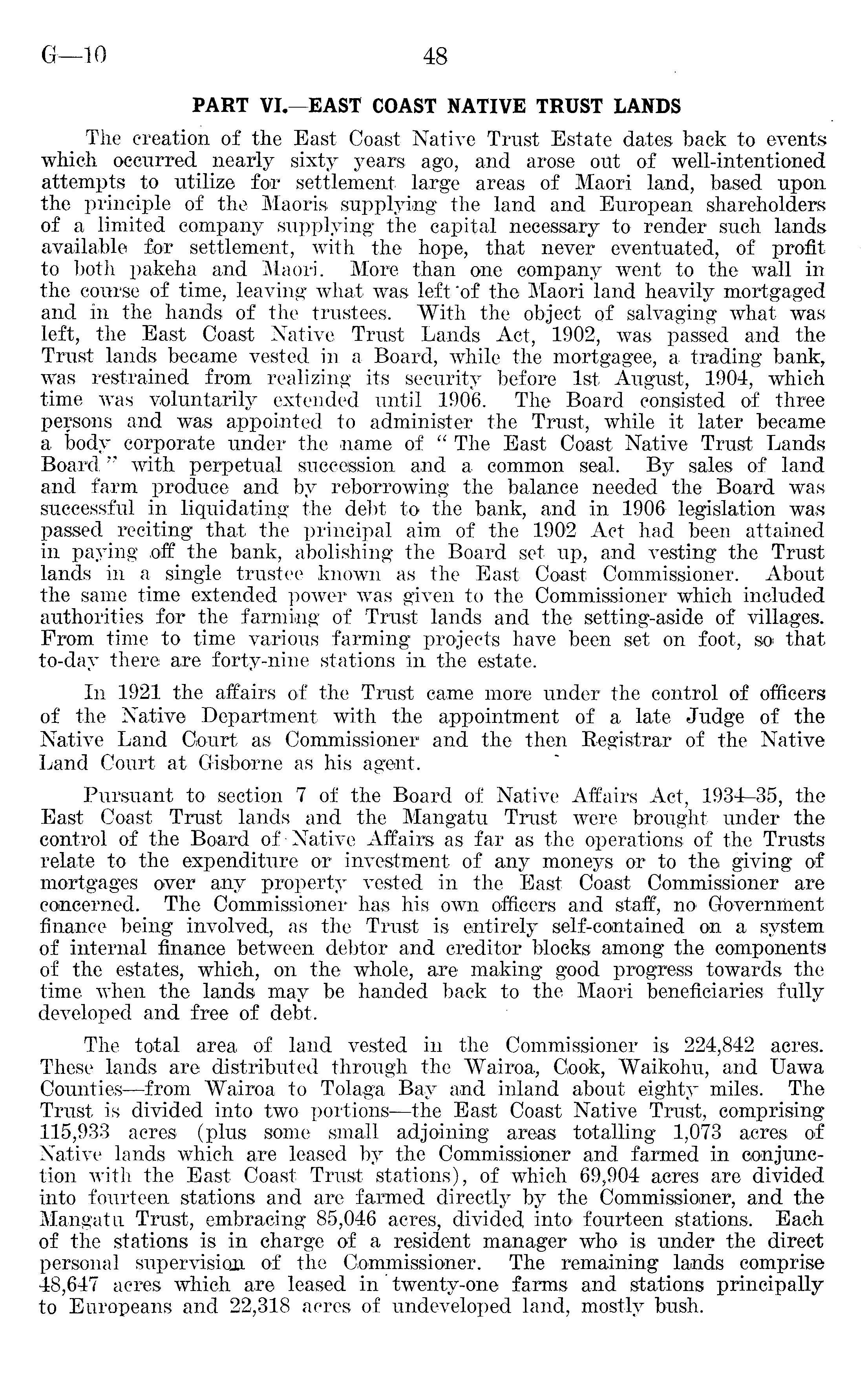 PART VI. —EAST COAST NATIVE TRUST LANDS The creation of the East Coast Native Trust Estate dates back to events which occurred nearly sixty years ago, and arose out of well-intentioned attempts to utilize for settlement large areas of Maori land, based upon the principle of the Maoris supplying the land and European shareholders of a limited company supplying the capital necessary to render such lands available for settlement, with the hope, that 7 never eventuated, of profit to both pakeha and Maori, More than one company went to the wall in the course of time, leaving what was left "of the Maori land heavily mortgaged and in the hands of the trustees. With the object of salvaging what was left, the East Coast Native Trust Lands Act, 1902, was passed and the Trust lands became vested in a Board, while the mortgagee, a trading bank, was restrained from realizing its security before Ist August, 1904, which time was voluntarily extended until 1906. The Board consisted of three persons and was appointed to administer the Trust, while it later became a body corporate under the name of. " The East Coast Native Trust Lands Board" with perpetual succession and a. common seal. By sales of land and farm prodtLce and by reborrowing the balance needed the Board was successful in liquidating the debt to the bank, and in 1906 legislation was passed reciting that the principal aim of the 1902 Act had been attained in paying off the bank, abolishing the Board set up, and vesting the Trust lands in a single trustee known as the East Coast Commissioner. About the same time extended power was given to the Commissioner which included authorities for the farming of Trust lands and the setting-aside of villages. From time to time various farming projects have been set on foot, so that to-day there are forty-nine stations in the estate. In 1921 the affairs of the Trust came more under the control of officers of the Native Department with the appointment of a late Judge of the Native Land Court as Commissioner and the then Registrar of the Native Land Court at Gisborne as his agent. Pursuant to section 7 of the Board of Native Affairs Act, 1934-35, the East Coast Trust lands and the Mangatu Trust were brought under the control of the Board of-Native Affairs as far as the operations of the Trusts relate to the expenditure or investment of any moneys or to the giving of mortgages over any property vested in the East Coast Commissioner are concerned. The Commissioner has his own officers and staff, no Government finance being involved, as the Trust is entirely self-contained on a system of internal finance between debtor and creditor blocks among the components of the estates, which, on the whole, are making good progress towards the time when the lands may be handed back to the Maori beneficiaries fully developed and free of debt. The total area of land vested in the Commissioner is 224,842 acres. These lands are distributed through the Wairoa, Cook, Waikohu, and Uawa Counties —from Wairoa to Tolaga Bay and inland about eighty miles. The Trust is divided into two portions—the East Coast Native Trust, comprising 115,933 acres (plus some small adjoining areas totalling 1,073 acres of Native lands which are leased by the Commissioner and farmed in conjunction with the East Coast Trust stations), of which 69,904 acres are divided into fourteen stations and are farmed directly by the Commissioner, and the Mangatu Trust, embracing 85,046 acres, divided into fourteen stations. Each of the stations is in charge of a resident manager who is under the direct personal supervision of the Commissioner. The remaining lands comprise 48,647 acres which are leased in twenty-one farms and stations principally to Europeans and 22,318 acres of undeveloped land, mostly bush.