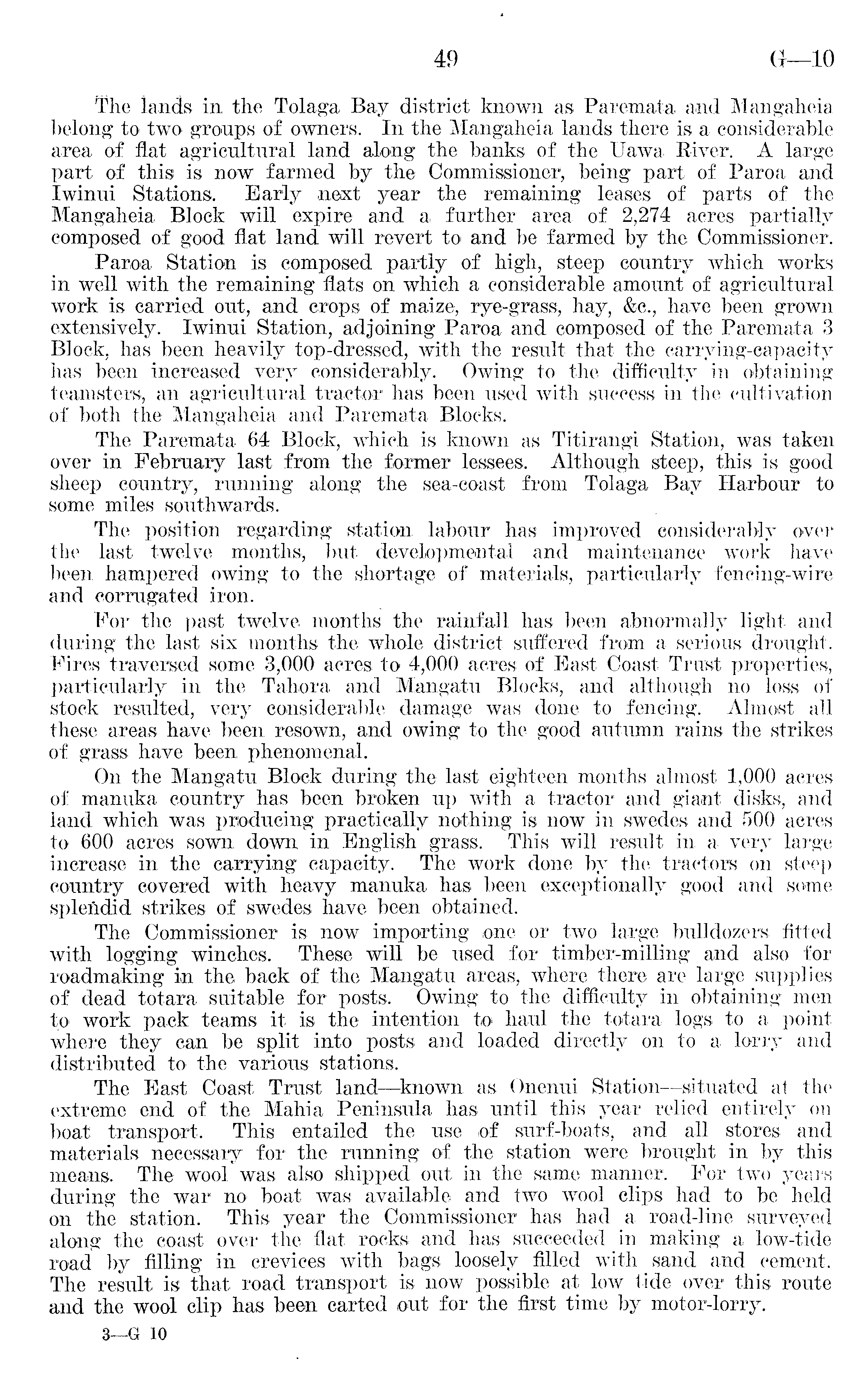 The lands in the Tolaga Bay district known as Paremata and Mangaheia belong to two groups of owners. In the Mangaheia lands there is a considerable area of flat agricultural land along the banks of the Uawa River. A large part of this is now farmed by the Commissioner, being part of Paroa and Iwinui Stations. Early next year the remaining leases of parts of the Mangaheia Block will expire and a further area of 2,274 acres partially composed of good flat land will revert to and be farmed by the Commissioner. Paroa Station is composed partly of high, steep country which works in well with the remaining flats on which a considerable amount of agricultural work is carried out, and crops of maize, rye-grass, hay, &c., have been grown extensively. Iwinui Station, adjoining Paroa and composed of the Paremata 3 Block, has been heavily top-dressed, with the result that the carrying-capacity has been increased very considerably. Owing to the difficulty in obtaining teamsters, an agricultural tractor has been used with success in the cultivation of both the Mangaheia and Paremata Blocks. The Paremata 64 Block, which is known as Titirangi Station, was taken over in February last from the former lessees. Although steep, this is good sheep country, running along the sea-coast from Tolaga Bay Harbour to some miles southwards. The position regarding station labour has improved considerably over the last twelve months, but developmental and maintenance work have been hampered owing to the shortage of materials, particularly fencing-wire and corrugated iron. For the past twelve months the rainfall has been abnormally light and during the last six months the whole district suffered from a serious drought. Fires traversed some 3,000 acres to 4,000 acres of East Coast Trust properties, particularly in the Tahora and Mangatu Blocks, and although no loss of stock resulted, very considerable damage was done to fencing. Almost all these areas have been resown, and owing to the good autumn rains the strikes of grass have been phenomenal. On the Mangatu Block during the last eighteen months almost 1,000 acres of manuka country has been broken up with a tractor and giant disks, and land which was producing practically nothing is now in swedes and 500 acres to 600 acres sown down in English grass. This will result in a very large increase in the carrying capacity. The work done by the tractors on steep country covered with heavy manuka has been exceptionally good and some splefidid strikes of swedes have been obtained. The Commissioner is now importing one or two large bulldozers fitted with logging winches. These will be used for timber-milling and also for roadmaking in the back of the Mangatu areas, where there are large supplies of dead totara suitable for posts. Owing to the difficulty in obtaining men to work pack teams it is the intention to haul the totara logs to a point where they can be split into posts and loaded directly on to a lorry and distributed to the various stations. The East Coast Trust land—known as Onenui Station—situated at the extreme end of the Mahia Peninsula has until this year relied entirely on boat transport. This entailed the use of surf-boats, and all stores and materials necessary for the running of the station were brought in by this means. The wool was also shipped out in the same manner. For two years during the war no boat was available and two wool clips had to be held on the station. This year the Commissioner has had a road-line surveyed along the coast over the flat rocks and has succeeded in making a low-tide road by filling in crevices with bags loosely filled with sand and cement. The result is that road transport is now possible at low tide over this route and the wool clip has been carted out for the first time by motor-lorry.