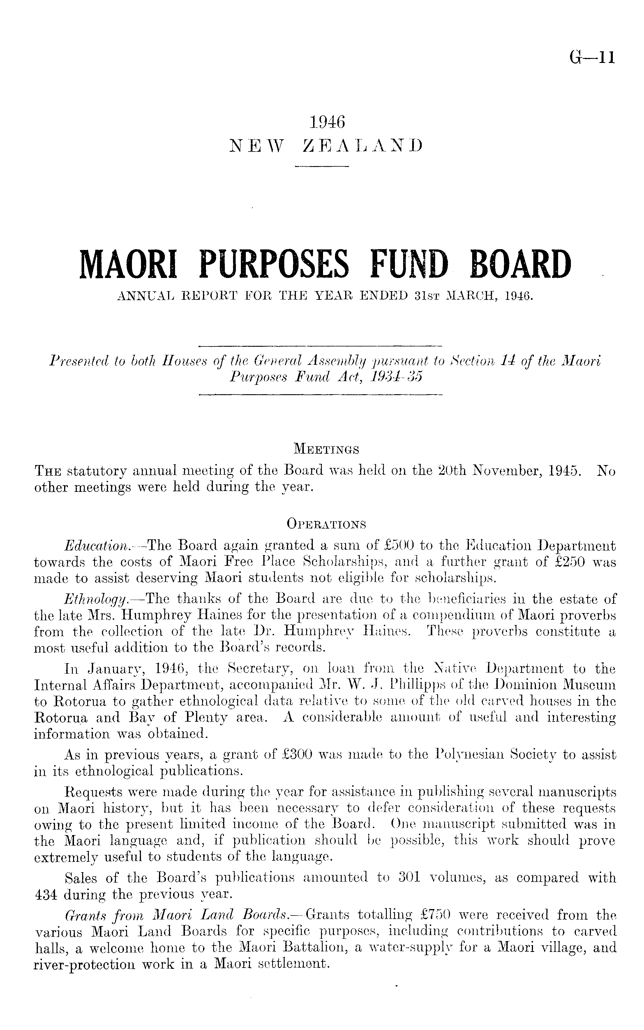 \ Meetings The statutory annual meeting of the Board was held on the 20th November, 1945. No other meetings were held during the year. Operations Education. —The Board again granted a sum of £5OO to the Education Department towards the costs of Maori Free Place Scholarships, and a further grant of £250 was made to assist deserving Maori students not eligible for scholarships. Ethnology.—The thanks of the Board are due to the beneficiaries in the estate of the late Mrs. Humphrey Haines for the presentation of a compendium of Maori proverbs from the collection of the late Dr. Humphrey Haines. These proverbs constitute a most useful addition to the Board's records. In January, 1946, the Secretary, on loan from the Native Department to the Internal Affairs Department, accompanied Mr. W. J. Phillipps of the Dominion Museum to Rotorua to gather .ethnological data relative to some of the old carved houses in the Rotorua and Bay of Plenty area. A considerable amount of useful and interesting information was obtained. As in previous years, a grant of £3OO was made to the Polynesian Society to assist in its ethnological publications. Requests were made during the year for assistance in publishing several manuscripts on Maori history, but it has been necessary to defer consideration of these requests owing to the present limited income of the Board. One manuscript submitted was in the Maori language and, if publication should be possible, this work should prove extremely useful to students of the language. Sales of the Board's publications amounted to 301 volumes, as compared, with 434 during the previous year. Grants from Maori Land Boards. —Grants totalling £750 were received from the various Maori Land Boards for specific purposes, including contributions to carved halls, a welcome home to the Maori Battalion, a water-supply for a Maori village, and river-protection work in a Maori settlement.