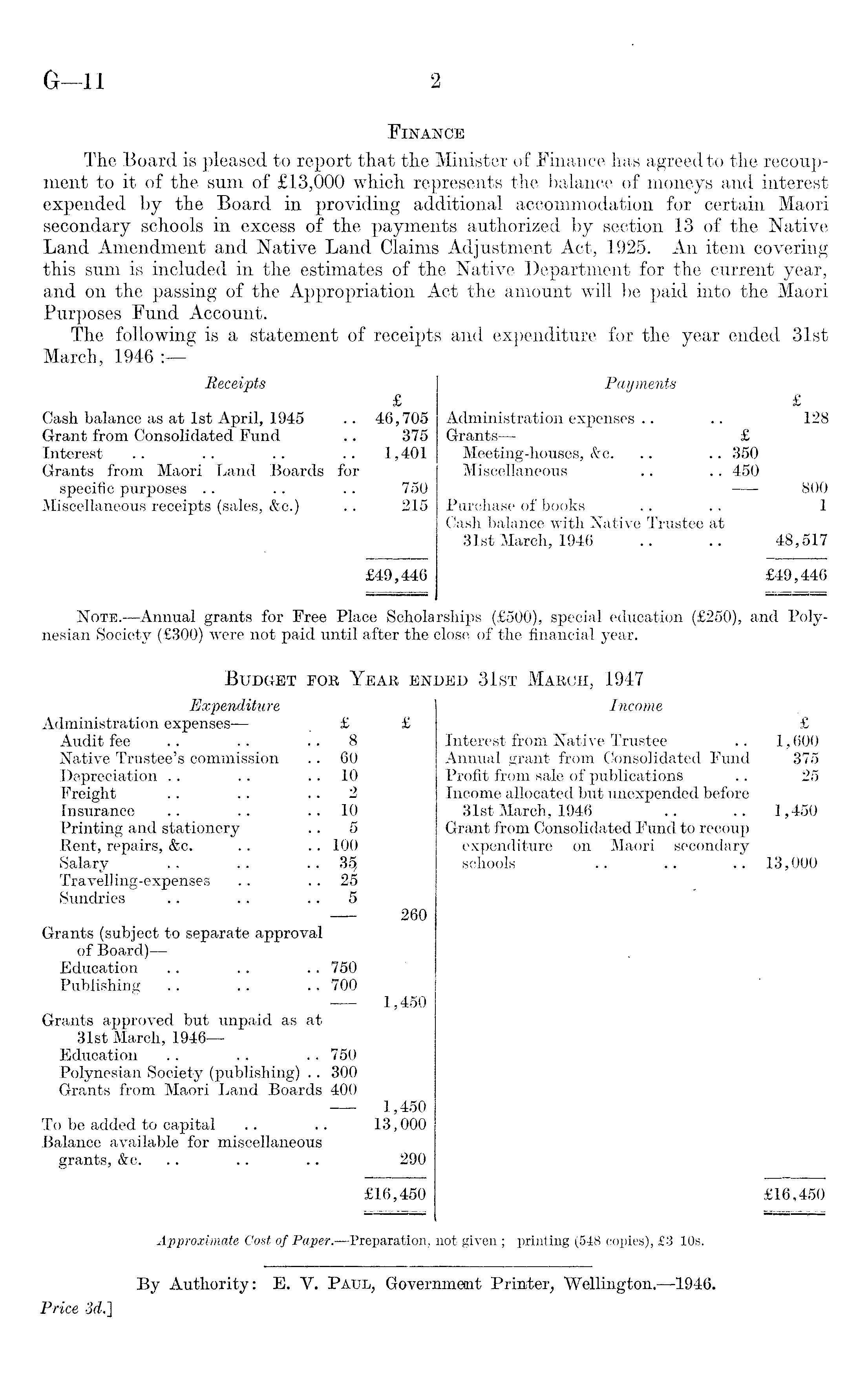 Finance The Board is pleased to report that the Minister of Finance has agreed to the recoupment to it of the sum of £13,000 which represents the balance of moneys and interest expended by the Board in providing additional accommodation for certain Maori secondary schools in excess of the payments authorized by section 13 of the Native Land Amendment and Native Land Claims Adjustment Act, 1925. An item covering this sum is included in the estimates of the Native Department for the current year, and on the passing 'of the Appropriation Act the amount will be paid into the Maori Purposes Fund Account. The following is a statement of receipts and expenditure for the year ended 31st March, 1946 :